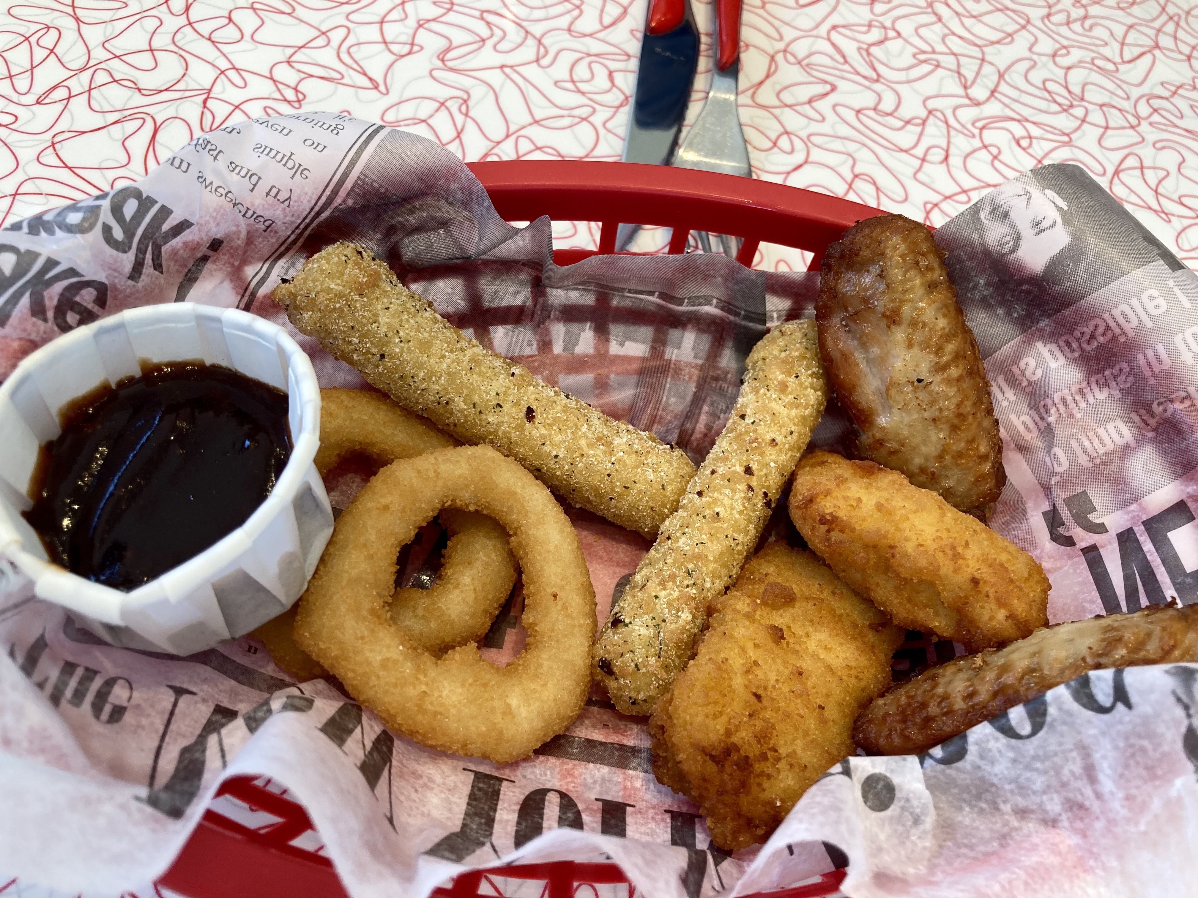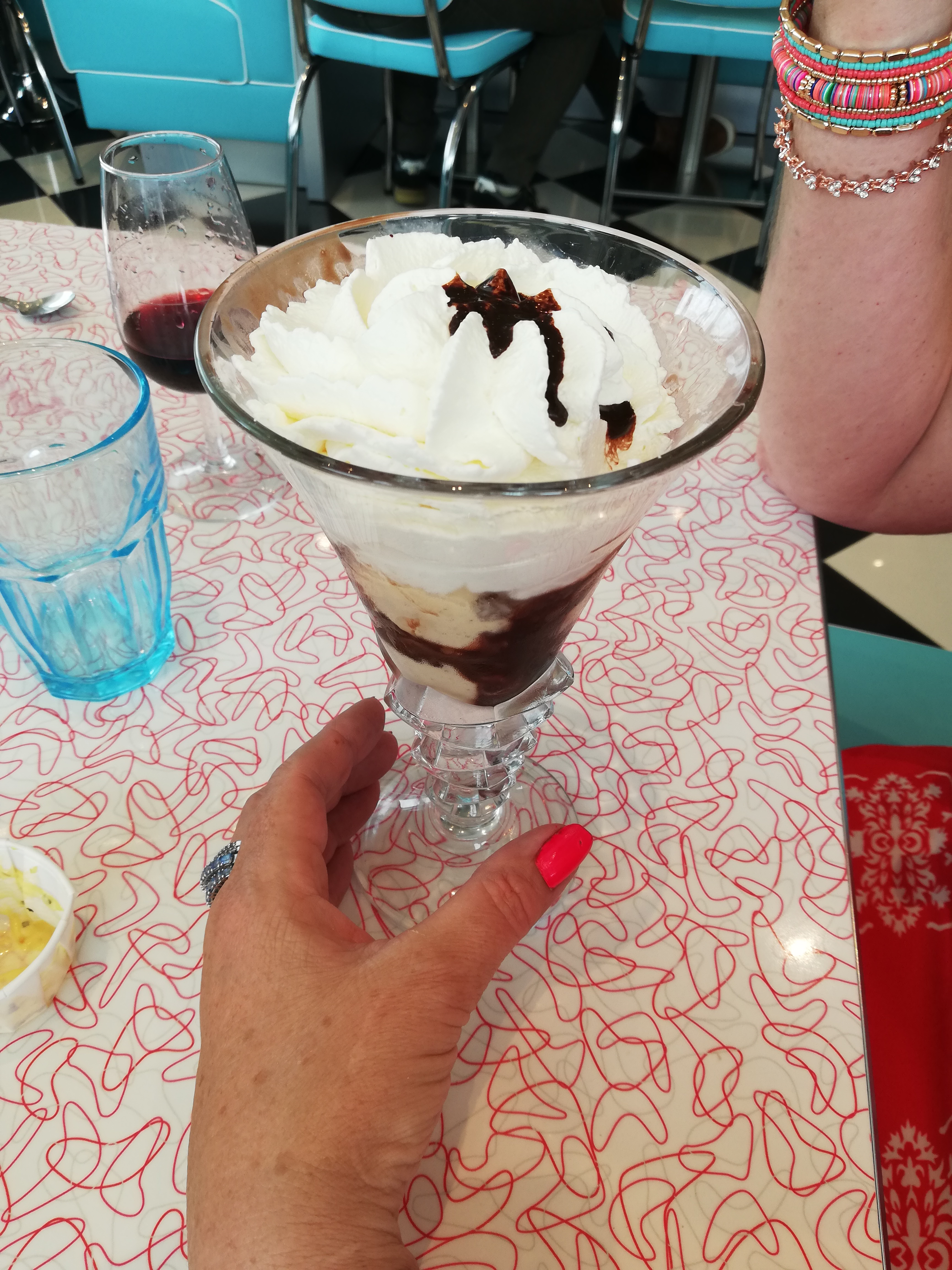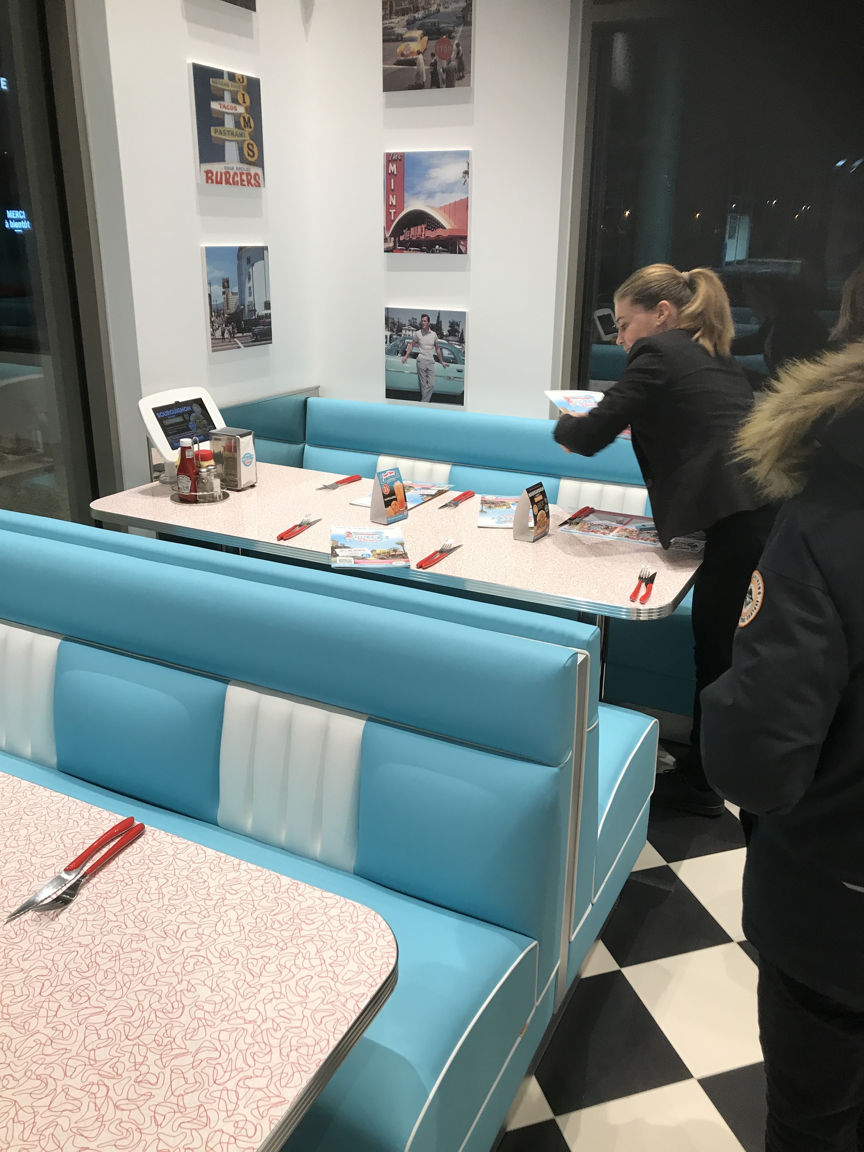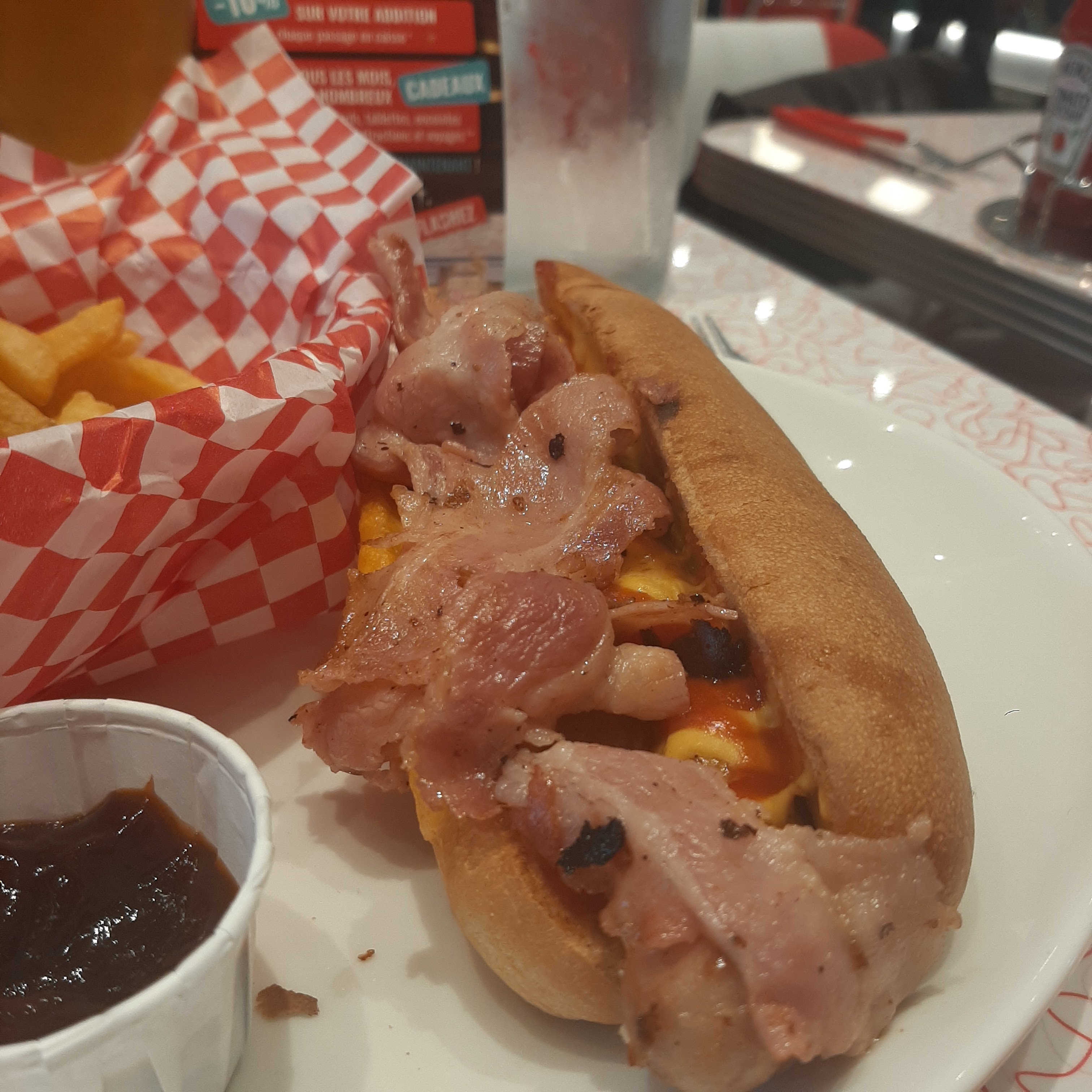 franchement pas bon . et cher pour de l'industriel. Quitte à mal manger (fast food) autant aller se faire un conçurent. largement moins cher. Hot dog, pas bon du tout et frites beaucoup trop cuites. et Burger moyen. Le décor est sympa années 50 / 60, et les tenues des serveurs serveuses nous plongent dans cette ambiance . ce jour là nous sommes arrivés en fin de service du midi. on nous a pressé dès notre arrivée pour la commande avant même d'être assis. ce que je peux comprendre. mais pour que au final, la manageuse blonde, prenne son temps pour raconter sa vie à ses serveurs. avant de nous faire asseoir. De plus fin de service oblige, on a assisté au défilé de nettoyage et balayage des rangs de serveurs . les balais restent en salle ,moyen quand on mange encore.