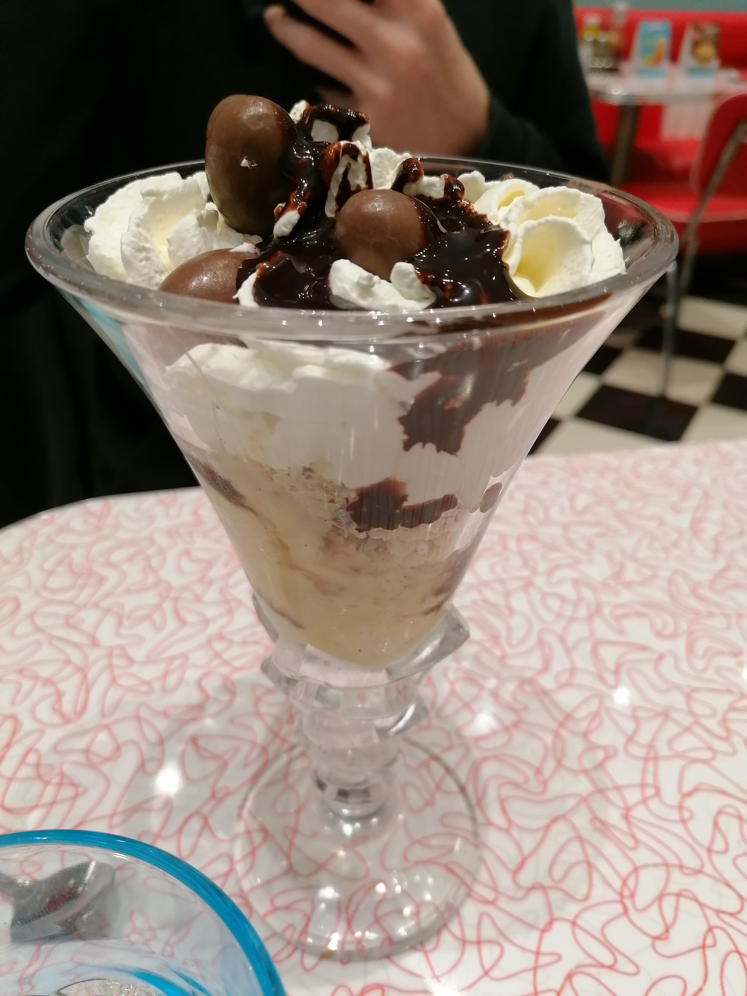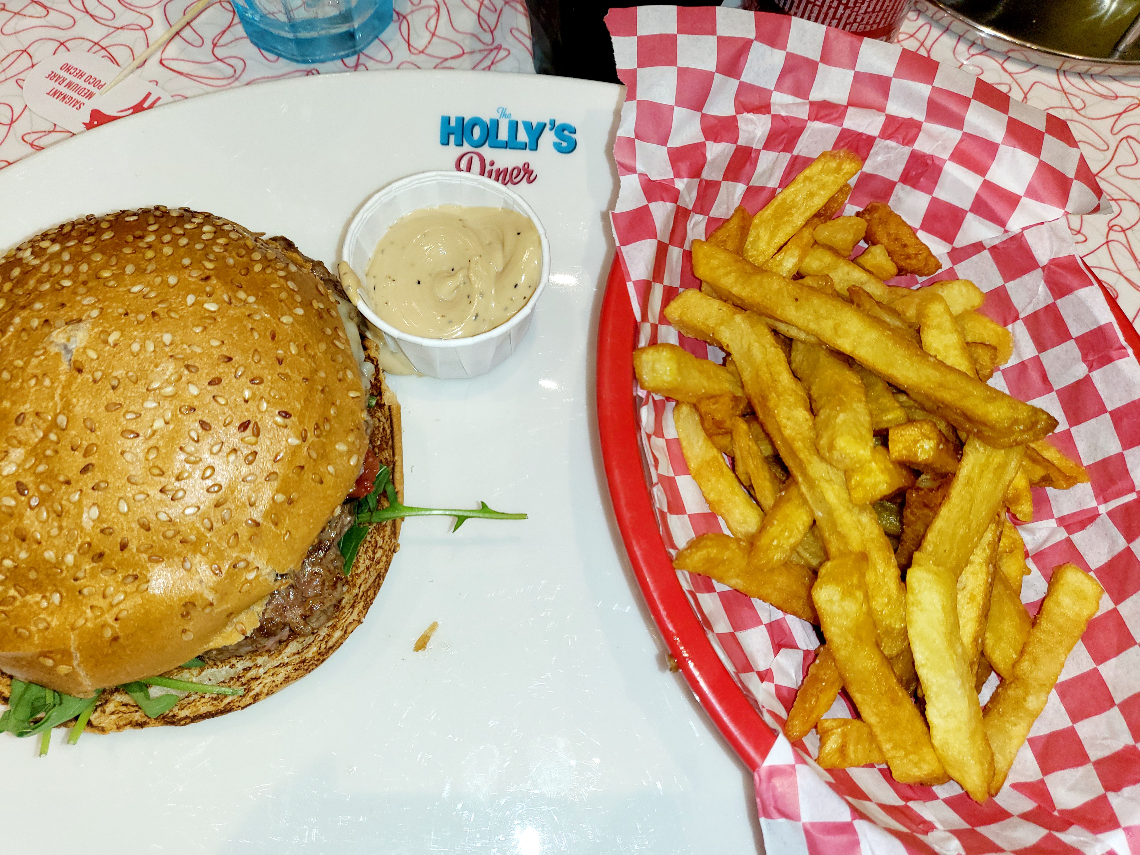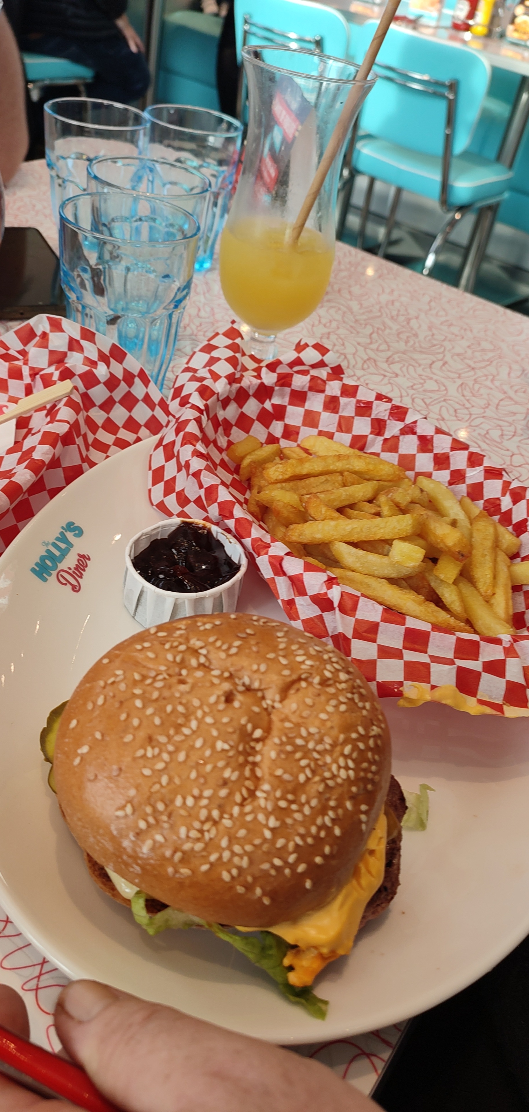 La serveuse qui s'est occupée de nous était très agréable, en revanche les plats étaient très moyens. Nous avons commandé des falafels, le goût n'était pas trop mauvais mais la texture pas terrible du tout, on avait l'impression que c'était réchauffé au micro onde. Au niveau du plat le burger était bon, mais les frites et potatoes décevantes. Même chose, elles étaient soit réchauffées au micro onde ou alors c'était les frites servies du midi et juste replongées dans l'huile pour les réchauffer. Je ne sais pas si tous les Holly's Dîner sont comme ça, mais celui là je ne reviendrais pas car c'est également cher pour ce que c'est. En revanche le dessert était bon.