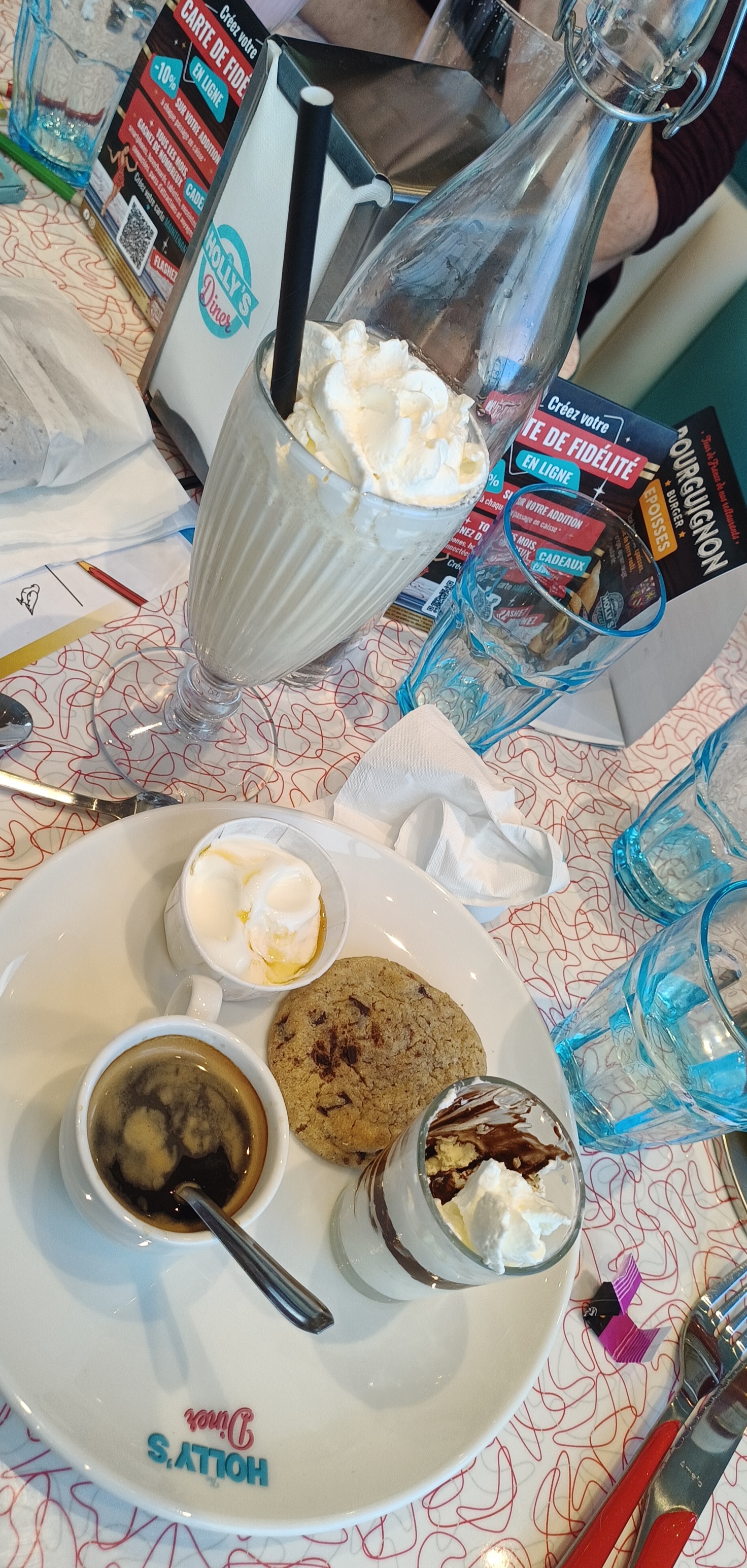 2 expériences Holly's à Nevers pendant les fêtes de fin d'année au déjeuner un vendredi et au dîner un lundi. Un conseil, il faut arriver tôt car il y a du monde mais l'organisation est bonne avec du personnel souriant et professionnel. Peut-être l'effet ouverture combinée avec les vacances scolaires. Attention l'addition peut vite déraper à la carte. Pour maîtriser votre budget, des menus Good deal et bonnes affaires de 8,90€ à 22,90€. Même un menu enfant moins de 10 ans à 7,90€. Et une carte fidélité gratuite vous offre 10% à chaque passage en caisse. La carte est très variée et les plats sont copieux et qualitatifs. Tous les burgers sont personnalisables. Les frites sont maisons et sauces à volonté. Garniture frites, potatoes, haricot vert, pomme au four,.. Sauce barbecue, roquefort, béarnaise, salsa, poivre, cream cheese... Carte steak house avec bavette, steak haché, pavé de boeuf mais aussi fish and chips, Rib's, Mac' and cheese (plat typique américain) ou pavé de saumon. Nombreux Poké Bowls, Hot dogs et salades. Une carte des desserts également très variée. Excellent Sundae avec des parfums et nappages variés comme les milkshakes (petit bémol sur leur fraîcheur limite tiède!! ce qui est bizarre pour un produit à base de glace). Le décor année 50/60 est vraiment sympa et le restaurant bien agencé. Service rapide, serveurs aux petits soins. Merci Canelle. Bientôt la 5ème étoile avec des milkshakes bien frais et un petit sourire supplémentaire de notre premier serveur dont j'ai oublié le prénom.