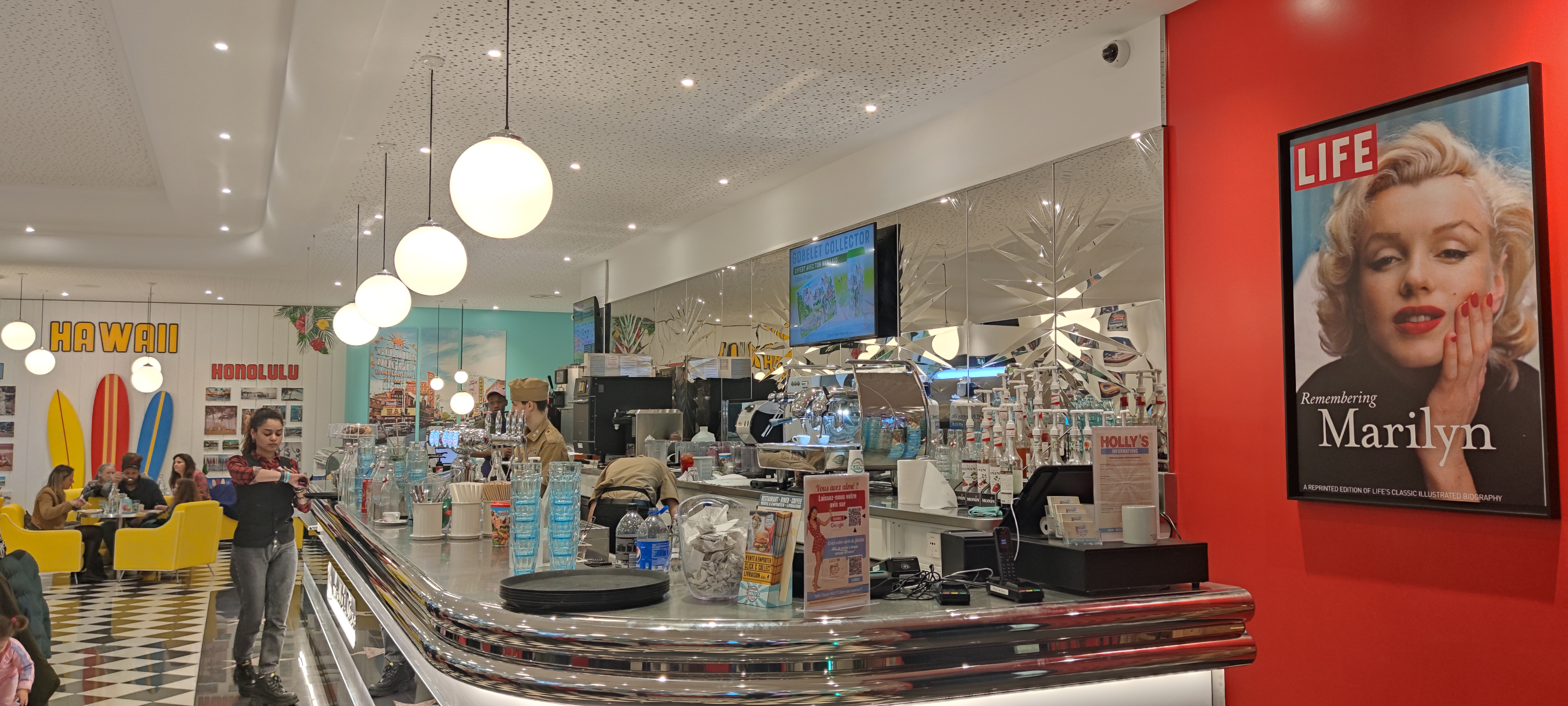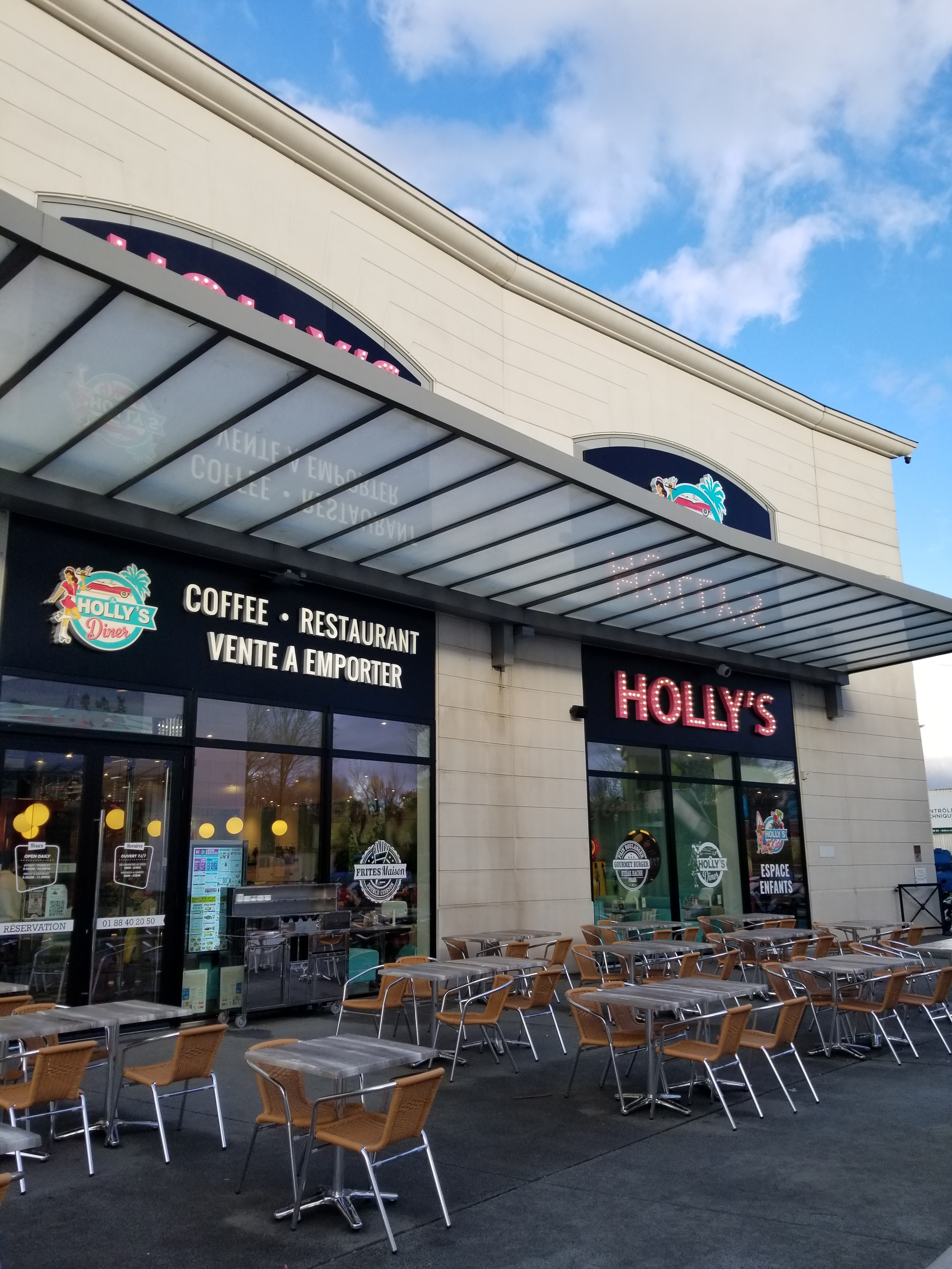 J’adore les Dinners et j’ai l’habitude des dinner aux USA. Je venais régulièrement au Tommy’s dinner avant sa fermeture. Le Holly’s a pris sa place. J’en viens à la conclusion, je regrette fortement le Tommy’s et pour les prix et surtout pour la déco/ambiance. Dommage car la cuisine est bonne mais le côté fifties est trop timide. Je reviendrais peut-être un jour 🤔 mais je m’attendais à mieux. Points positifs : - Produits fais maisons - Frites cuites en double cuisson, top ! - Pain Burger fait maison. - Cuisson des viandes impeccable. - Florent, le serveur est sympathique. - Parking du centre commercial pratique. - Le tenue des serveurs est bien pensée. Points négatifs : - tarifs élevés pour un fast-food. Ça devient une folie de payer aussi cher pour des frites et un Burger. Même maison. - Un soda 33cl : 4,50€ 😰 - Musiques des fifties inaudibles, peu d’ambiance. - Déco au rabais. Les banquettes sont jolies mais il manque cruellement de décorations rappelant les USA. Rien à regardé à part quelques affiches rares au mur, un pompe à essence et un juke-box. - Un écran géant qui aurait pu servir à diffuser autre chose que le menu. - La quinzaine de glaçons dans la limonade maison, c’est diluer le produit. Quel dommage !