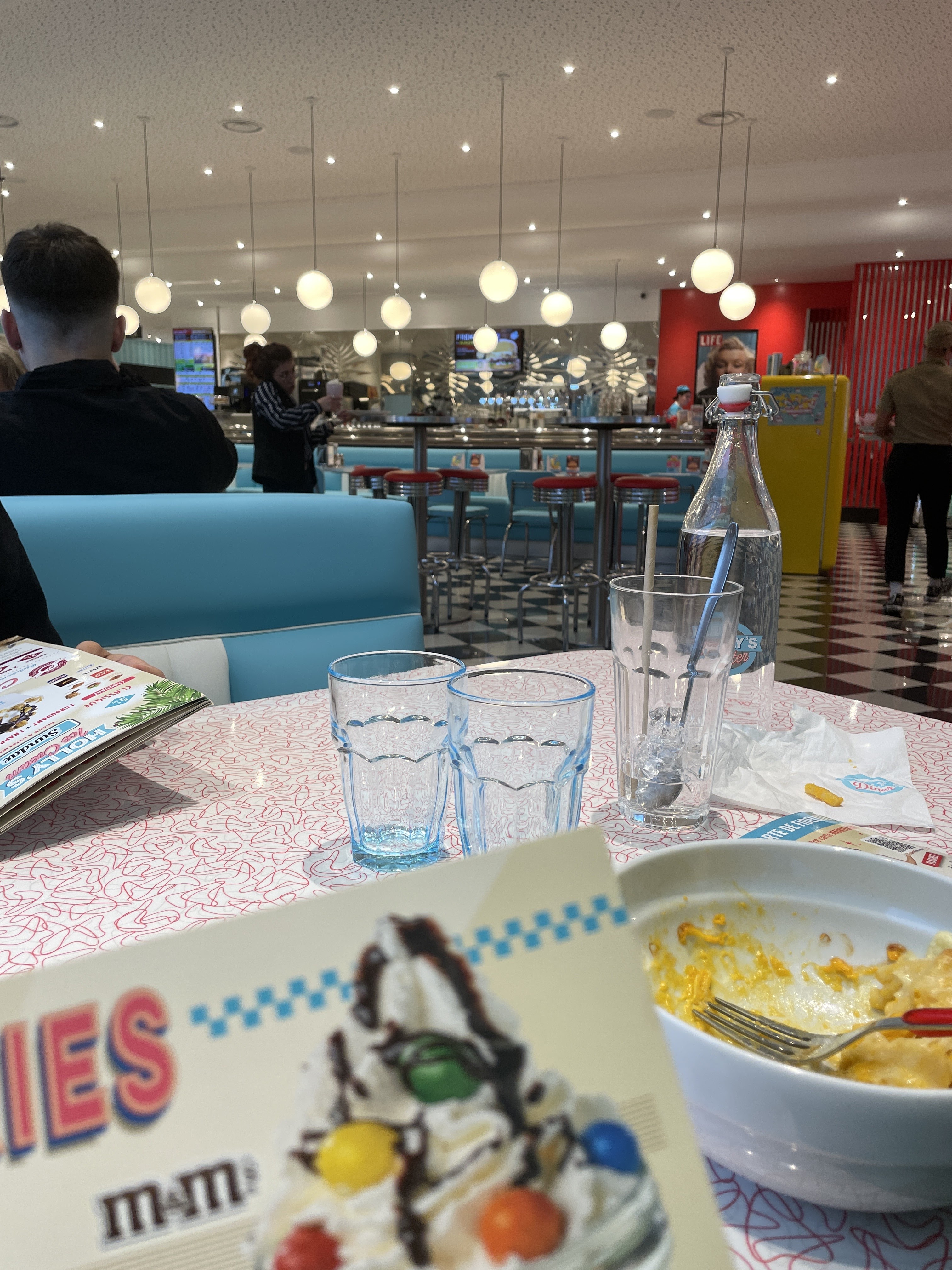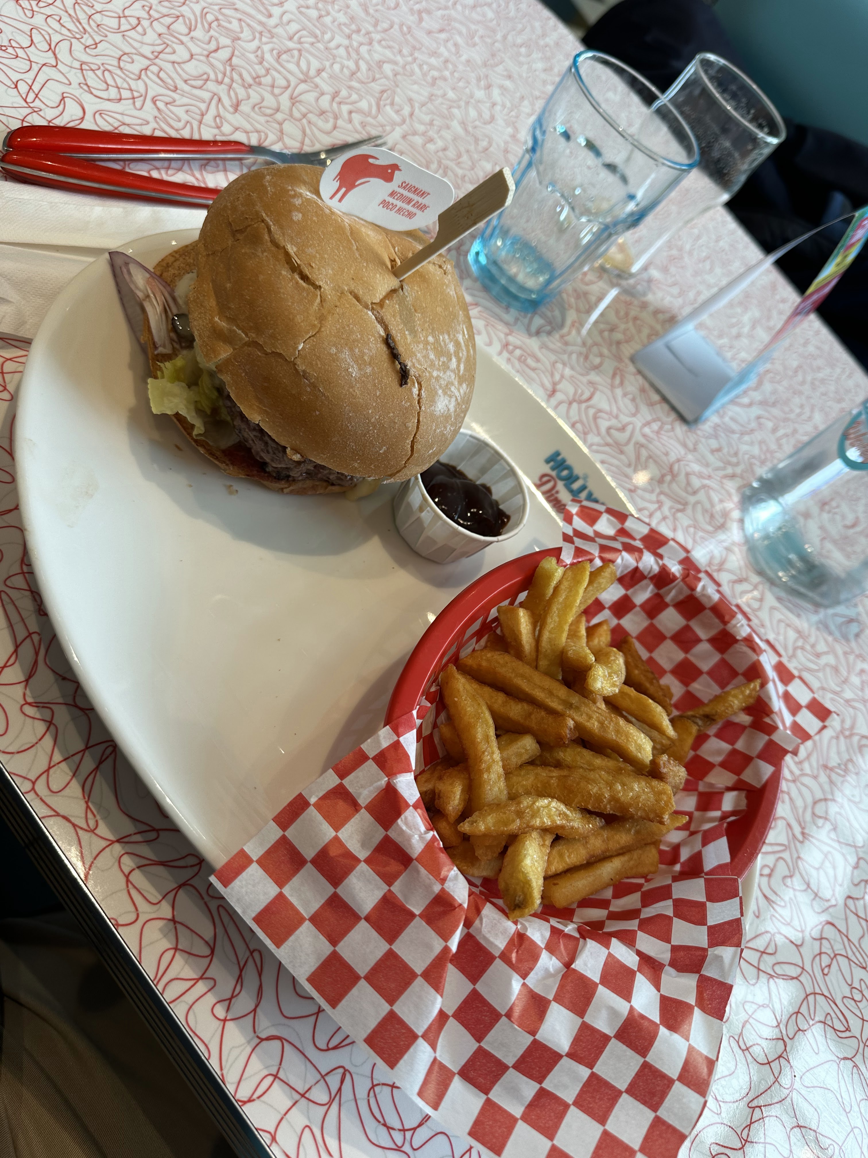 Ambiance Américaine année 70 ! Les frites sont faites maison avec des pommes de terre fraîches ! A tomber. Je vous le recommande ! La carte des desserts n'a rien à envier ! Testez les sundaes ou les cafés gourmands ! Vous ne serez pas déçu. Pour les amateurs de churros, allez-y. Ils sont croustillant à souhait ! Il y a une zone de jeux dédiée aux enfants.
