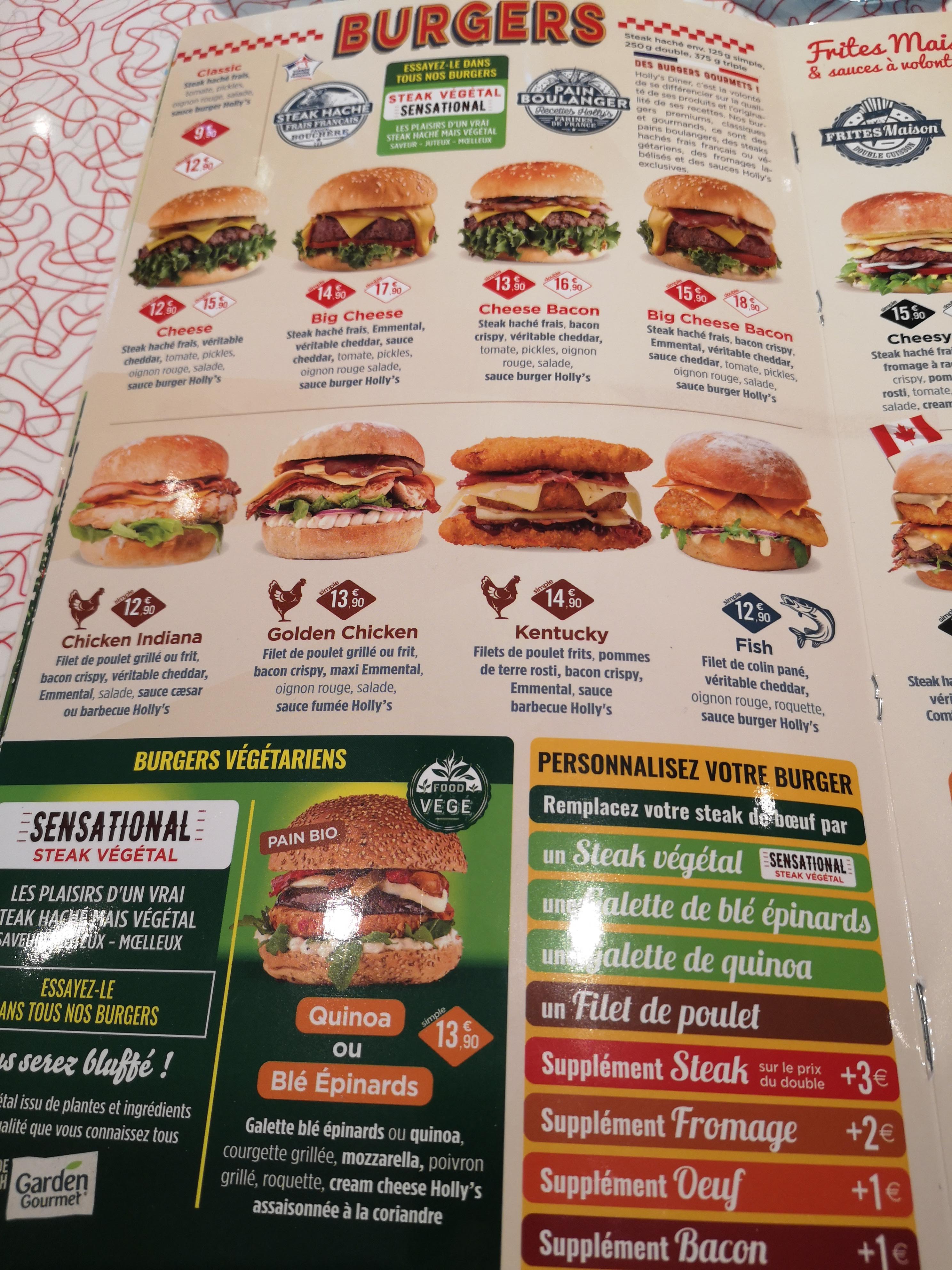 Nous voulions découvrir depuis un moment l’enseigne Holly’s ! Accueil agréable et professionnel, prix affiché à la carte plutôt correct, le petit plus du chef, un programme fidélité pour ma part intéressant! Au niveau du repas, nous avons pris des formules burger frites, service, ultrarapide pratique pour des gens pressés, aux petits soins, tu rends tout notre repas, par compte gustativement parlant il ne faut pas s’attendre à quelque chose d’extraordinaire, je note les frites fraîches Malgrétout qui sont bonnes! Gros points négatifs sur la cuisson des steaks… Celle-ci est à revoir en cuisine signalé lors de l’encaissement. Pour le reste nous avions apprécié le cadre que offre le restaurant.