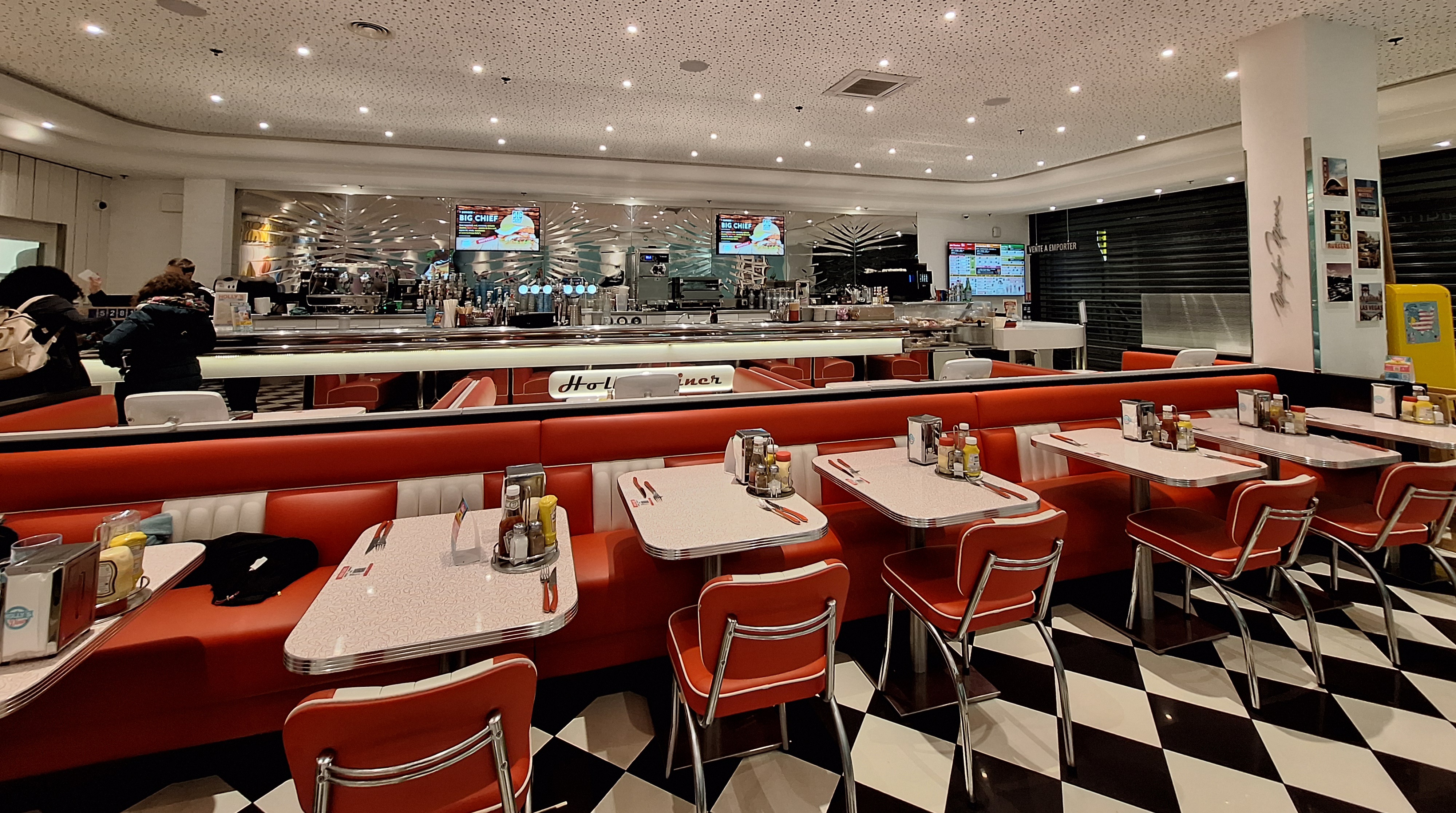 Decembre2019: Défaut d’organisation à la réception. En effet vous êtes obligé de faire la même queue des personnes souhaitant prendre des plats emportés donc vous perdez du temps. Personnel sympa. Pas de commentaire sur l’esthétique des lieux en effet c est neuf. Code Holly’s diners non respecté. Les macciano et milkshake ont été servis dans des gobelets en carton. A savoir que la chaîne utilise des grands verres. J ai fait plusieurs holly pour confirmer. Établissement pouvant s’améliorer. Je repasserai pour constater. Je suis repassé en août 2020. Aucune amélioration. Milkshake complètement fade. Ce n est pas un vrai mille Shake. Temps d attente toujours aussi long. Et j étais 2 eme seulement Règles COVID non respectées en caisse et en préparation pas de gel hydro pour le personnel entre chaque client pour les échanges de monnaie etc... gel dispo pour client uniquement. Glace non remplie correctement vu le prix en face au mcdo on a mieux avec les mêmes produit pour les glaces. Comme sur les photos les contenants sont toujours en papier carton contrairement au standard de la franchise et de la pub affichée en magasin. Les couverts et pailles sont toujours en plastique malgré l interdiction mise en place en France. Je déconseille ce lieu. Je ne comprend pas les 4.4 en avis.