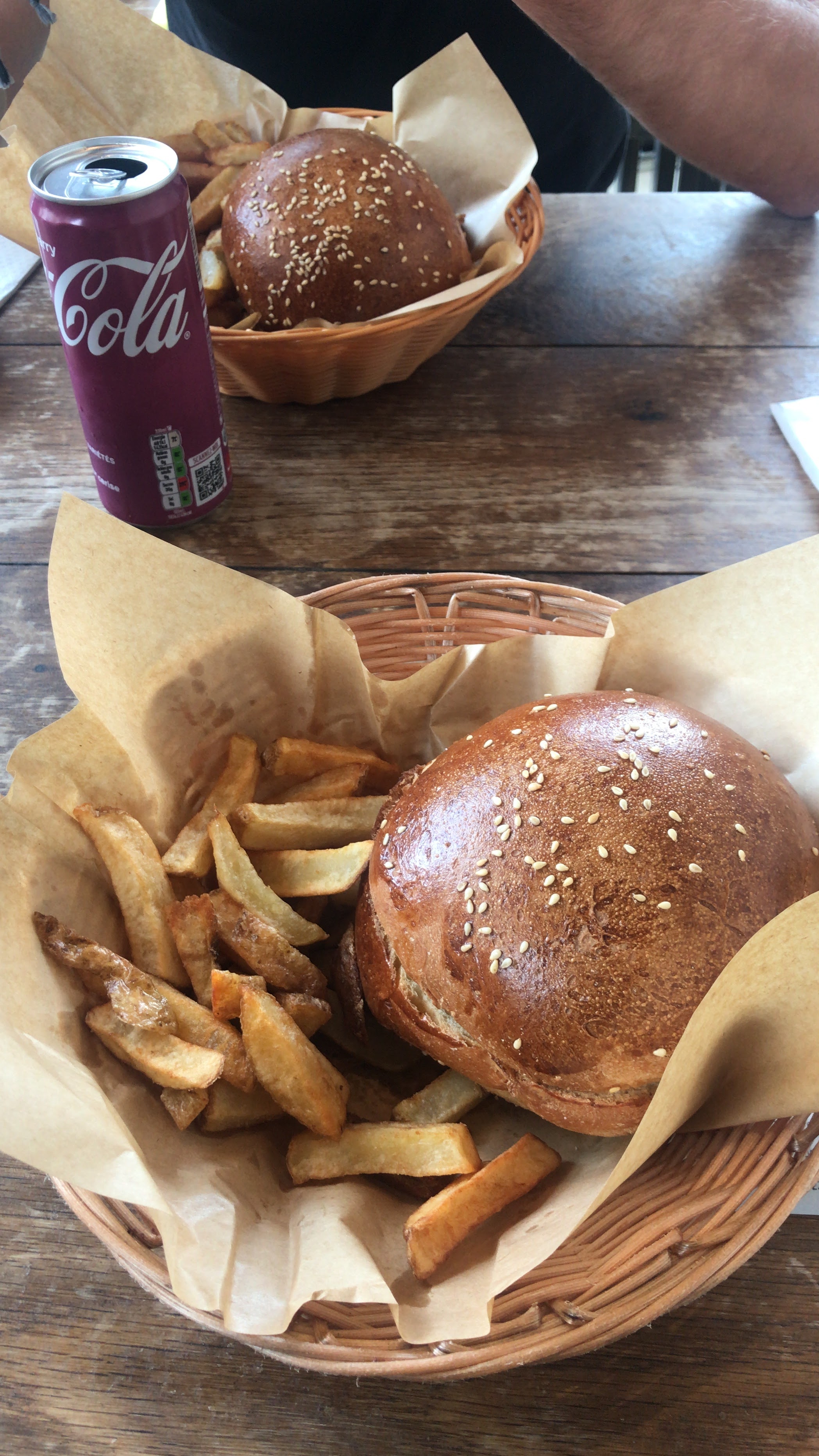 Frite maison et hamburgers très bon servit dans des panières à pain sans couvert et prix non justifier un menu avec juste plat et boissons plus chère que vendu séparément ????