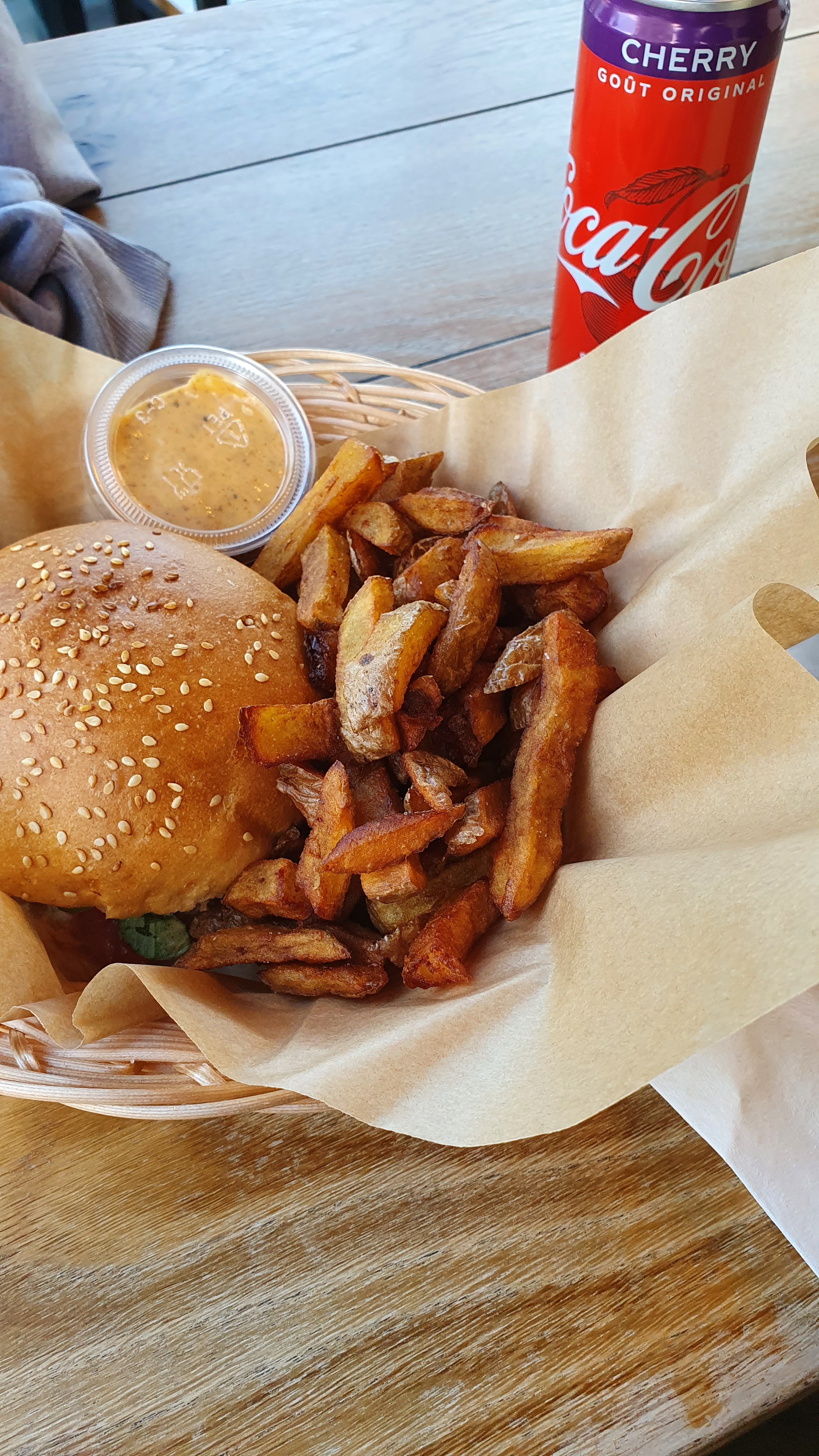 C'est ok, le lieu est joli, le personnel accueillant et ça fait plaisir d'avoir une proposition pour les végétaliens. Le burger vegan (un des trois je ne sais plus exactement lequel j'ai commandé ) est un peut tristounet, une galette lentilles/poids chiches servie avec un chutney oignon pas foufou, une ou deux rondelles de tomates et un peut de salade. J'imagine que c'est moins sec avec le fromage dans la version végétarien . Il a le mérite d'exister ! Les frites avec la peau des pommes de terre pourquoi pas mais un peut moles a mon gout. Le prix 13 € le menu burger, frites, boisson sans alcool. Du Fast food voilà voilà.