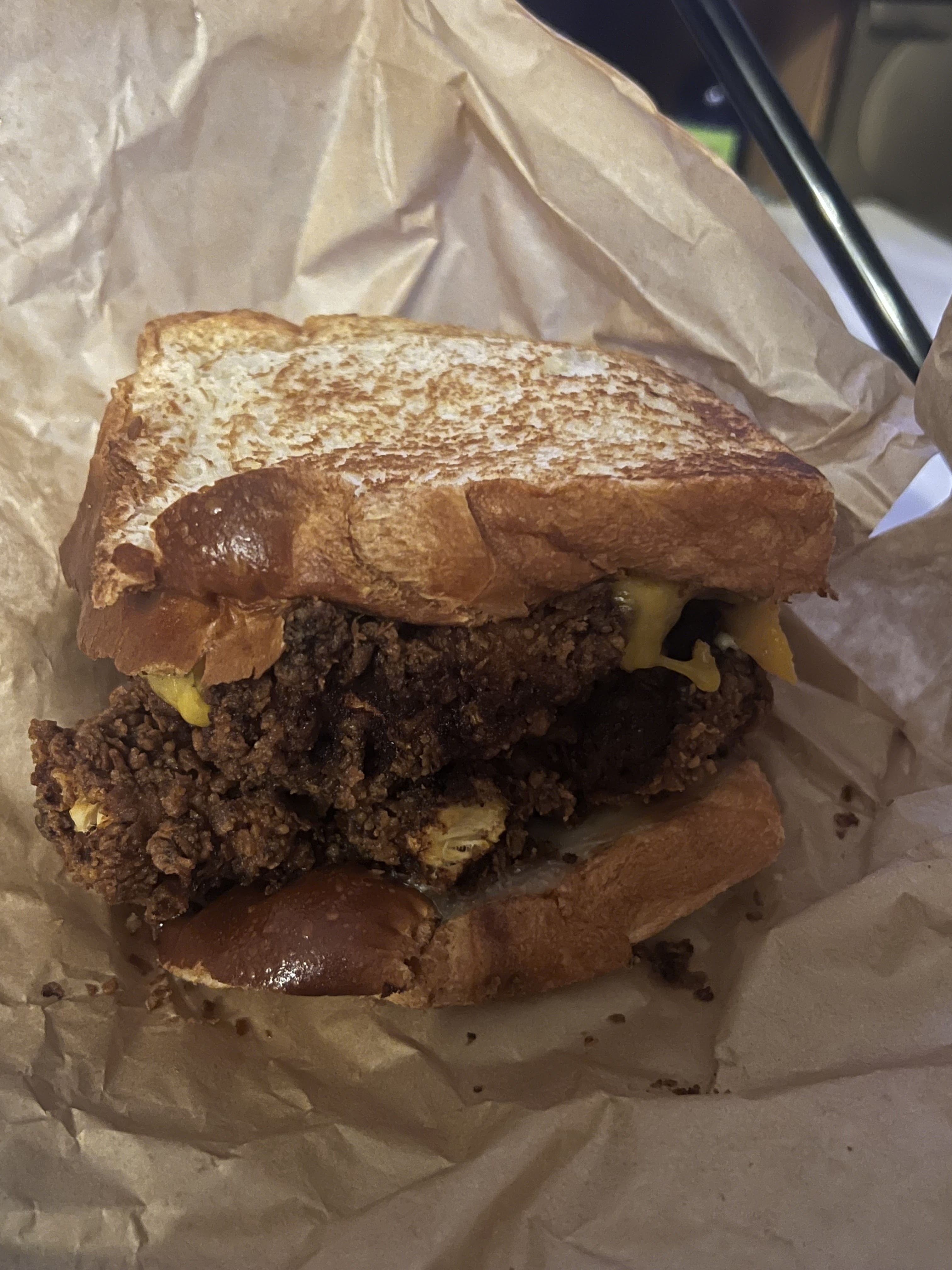 La semaine dernière j'ai mangé sur place hamburger très bon pas sec produit frais frites très bonne. J'ai voulu retenter l'expérience hier avec mon mari on a pris à emporter. Nous avons pris un menu aux poulet frits avec patate douce pour mon mari un menu big melt pour moi avec frites de pommes de terre et supplément fromage dans le burger avec une boîte de tenders prix 50€ déjà franchement je trouve celà exagéré même si ce sont des produits frais. Le burger de mon mari était trop sec. Le miens ? La viande avait un goût très bizarre forte et était carbonisé et le fromage cramé. Les frites étaient sèche je les aient jetés première et dernière. Le rapport qualité prix 0.