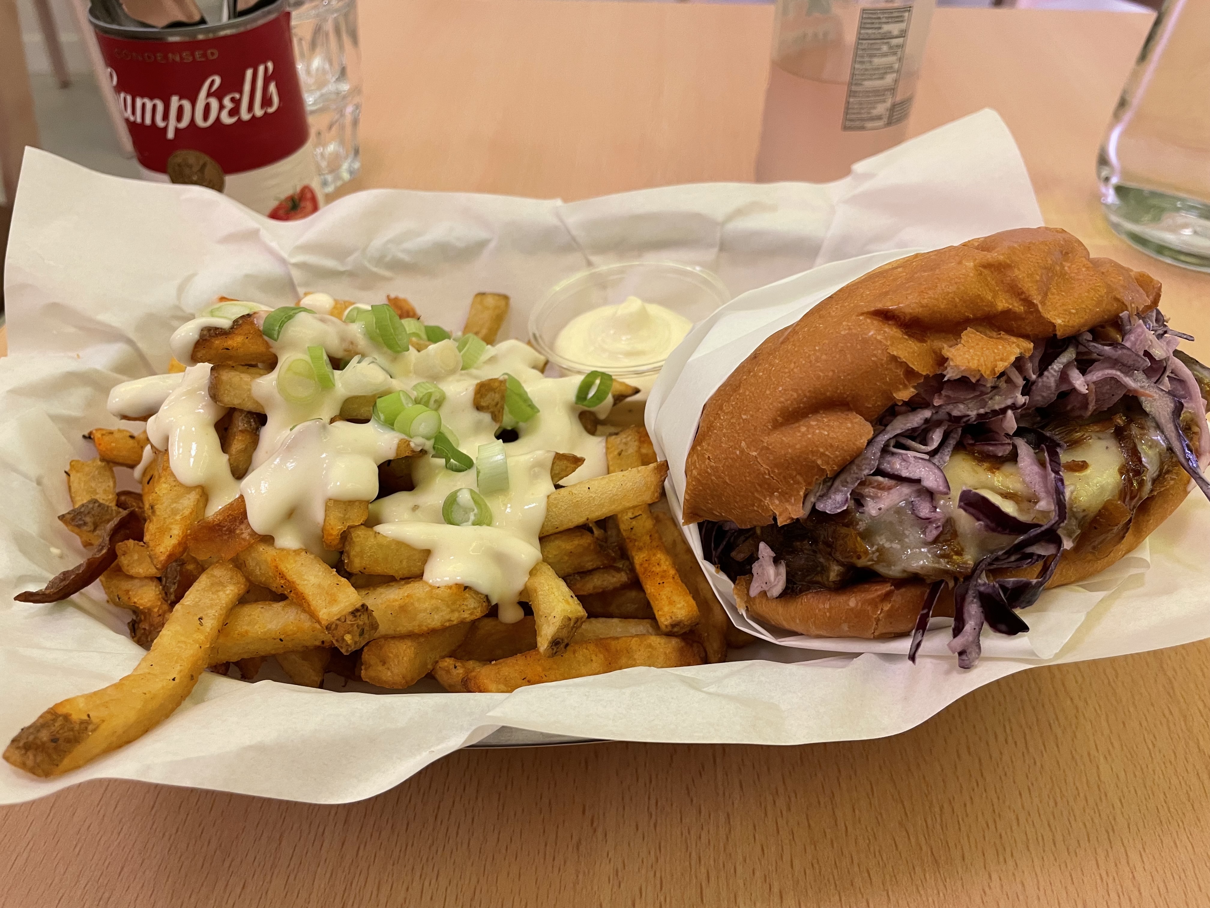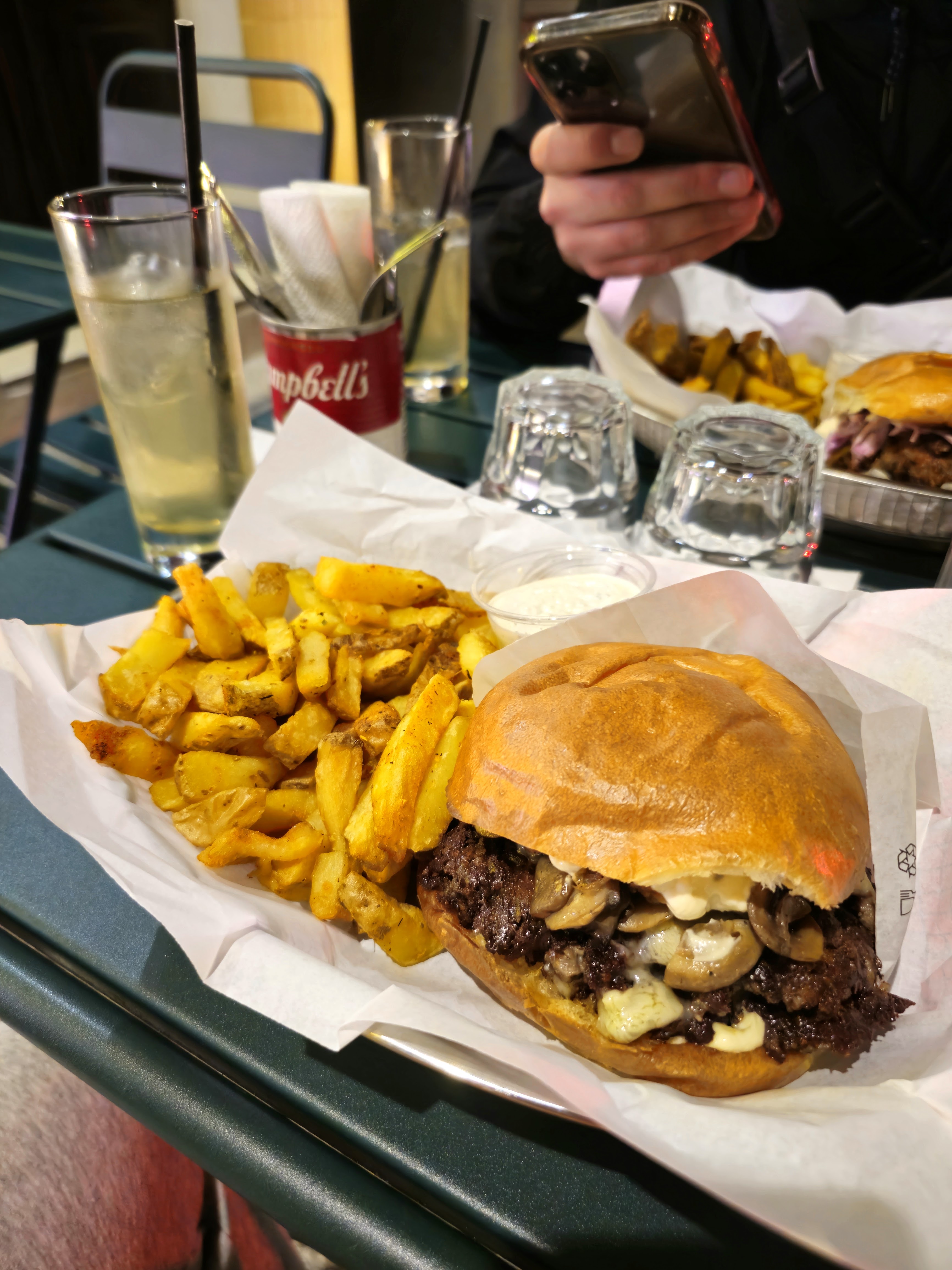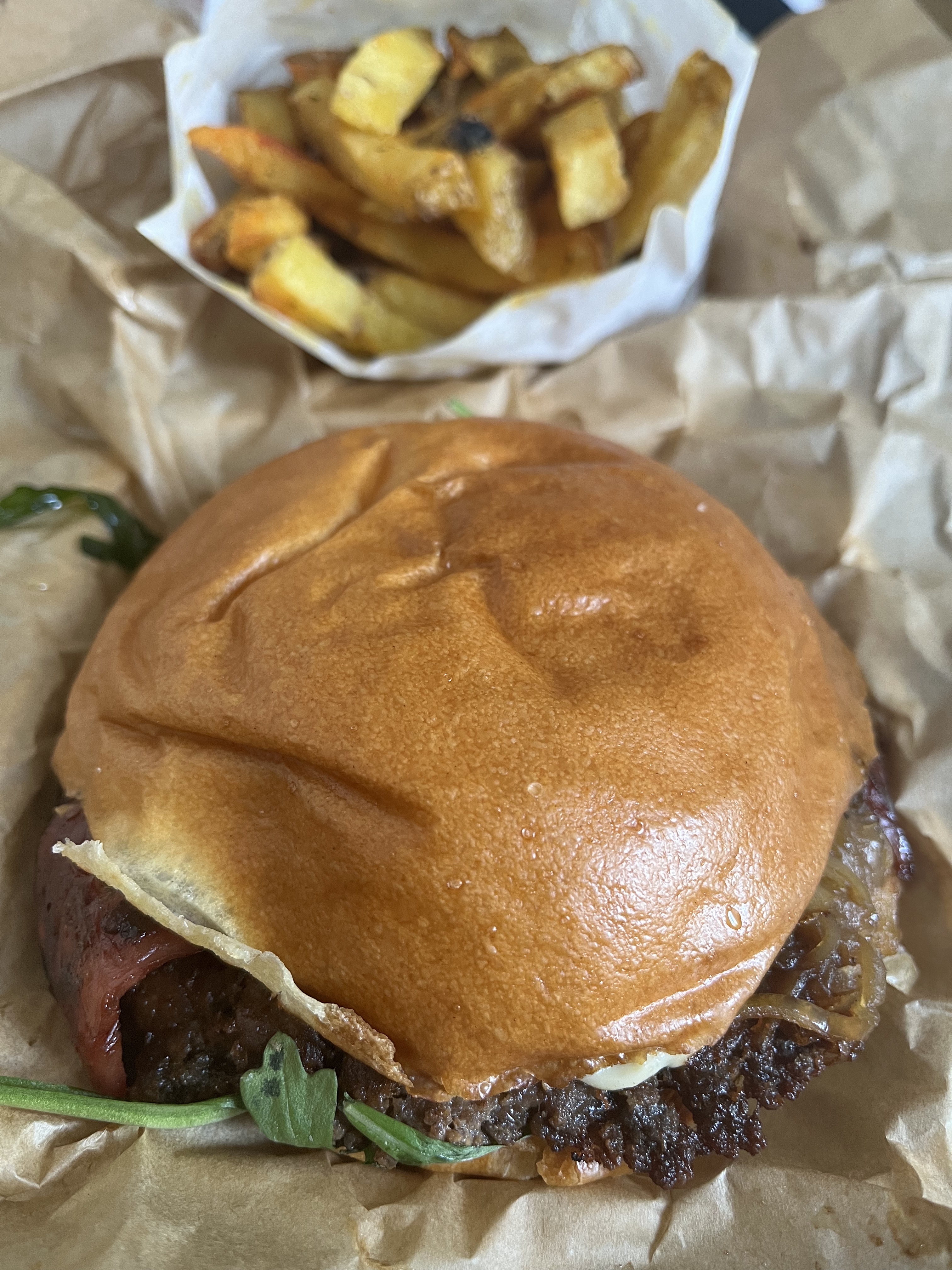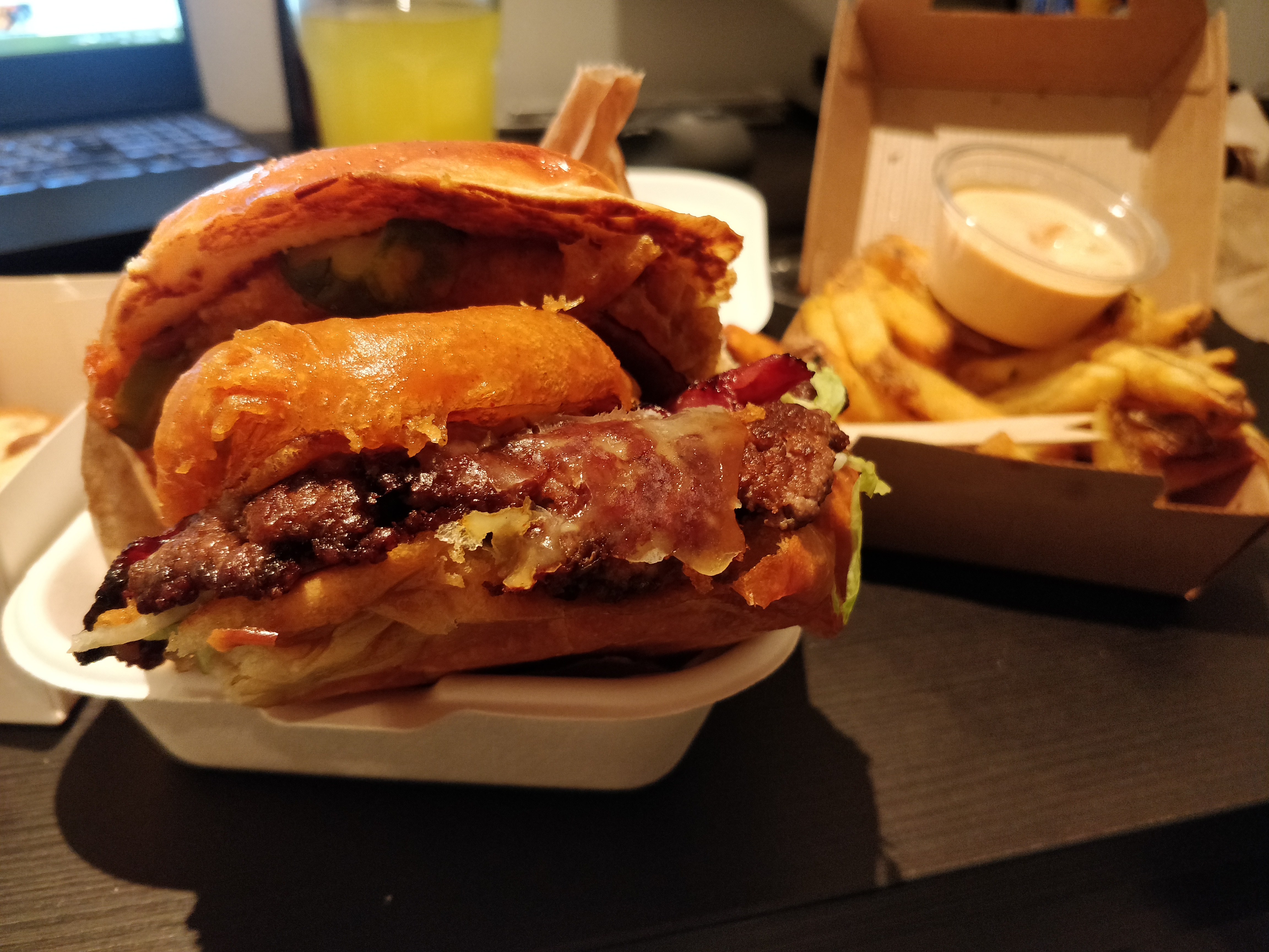 J’ai mangé à emporter, j’habite à une 15-20min du restaurant. Lorsque je suis arrivée j’ai dû réchauffer mon burger et mes sweet potatoes fries. Le service était super ! Le burger smoky blue cheese était excellent (j’imagine sur place 😋), peut-être que mes frites manquaient un chouïa de cuisson. J’ai trouvé le tarif assez élevé. La prochaine fois je prendrais seulement le burger qui lui vaut vraiment le coup !