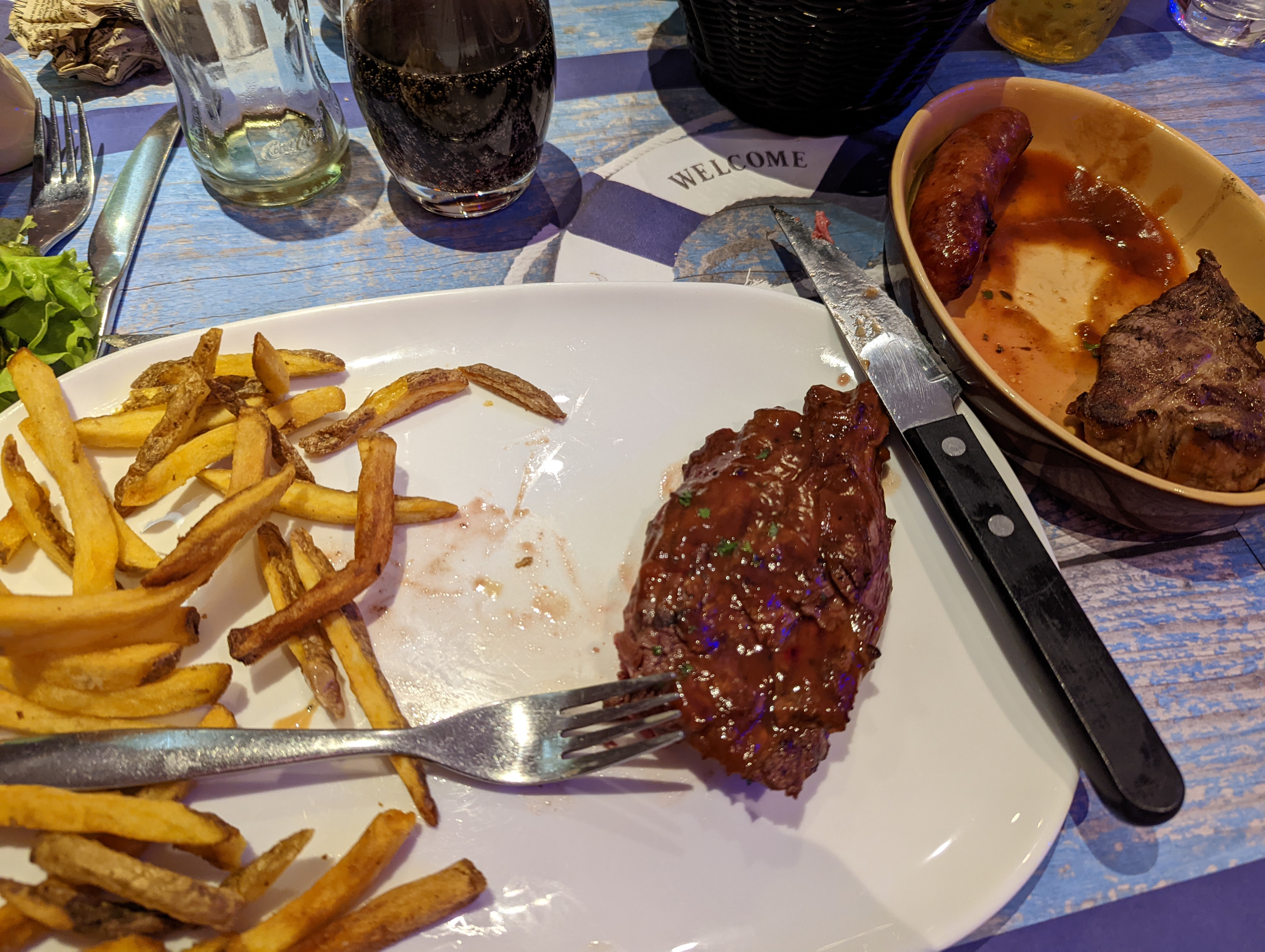 Pas déçue pour une première fois. Côte de boeuf cuite comme nous l'avons demandée, brochettes de gambas et calamars excellentes. Moules marinières bien fraîches. J'ai enlevé 1 étoile car les nems au poulet étaient trop cuits. A bientôt.