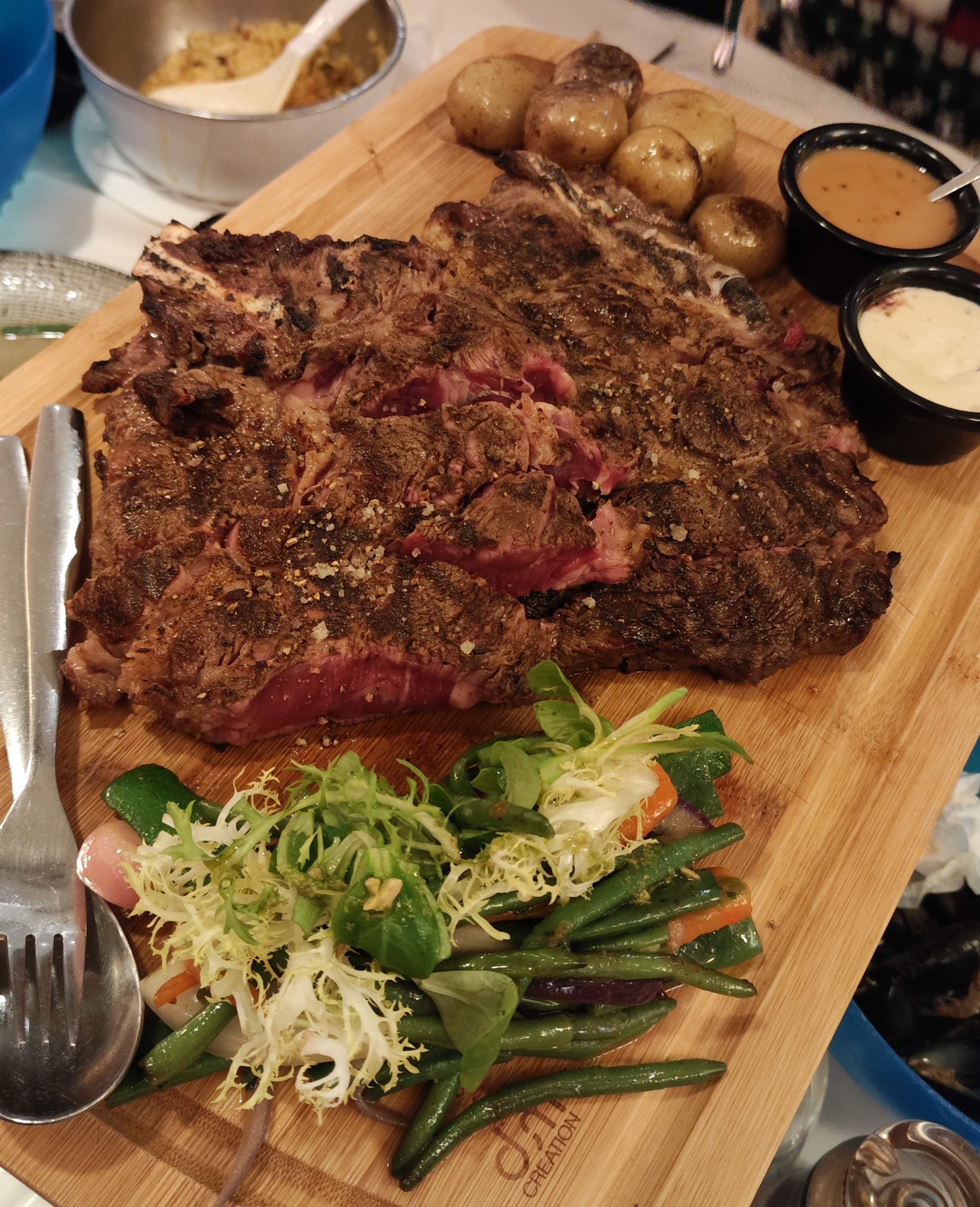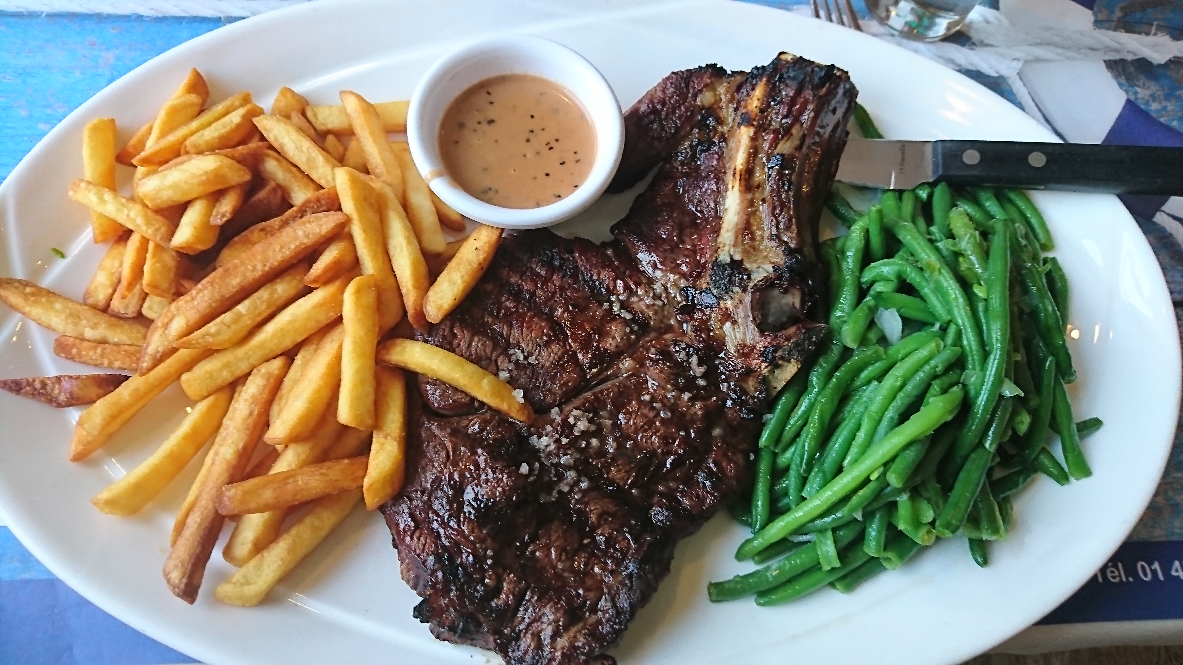 La cote de bœuf d’1 kg est très bonne, la cuisson est bien maîtrisé. Par contre pour une cote censé être pour 4 personnes l’accompagnement est ridicule, quelques feuilles de salade et 4 mini pomme de terre. Le plateau de fruit de mer ne valait pas le coût, produit non frais, sûrement surgelé.