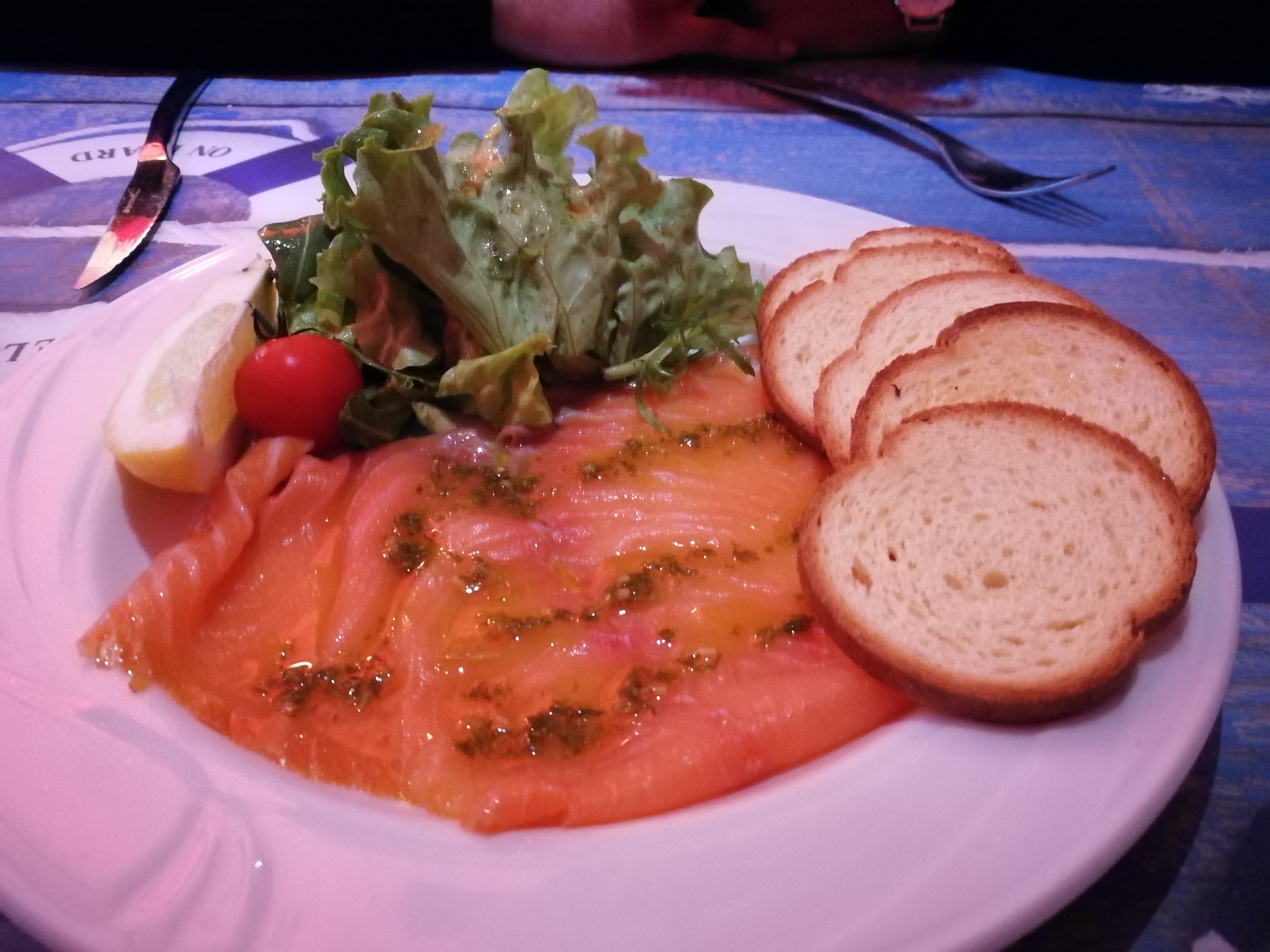 La première et la dernière.. Merci on ne m'y prendrait plus .. Dîner un jeudi soir donc supposé être tranquille, on s'en sort avec un mal de tête et des maux de ventre. Trop bruyant les gens ne parlent pas entre eux il hurlent!! Et dans mon plat des visiteurs!!! Les gambas à l'ail pas fraîches qui baignaient dans son huile ( responsable des maux de ventre). On nous a offert l'apéro ben c'est la moindre des choses!! Enfin bref on a vu du monde on s'est dit c'est bon et ben non.. Merci au revoir.