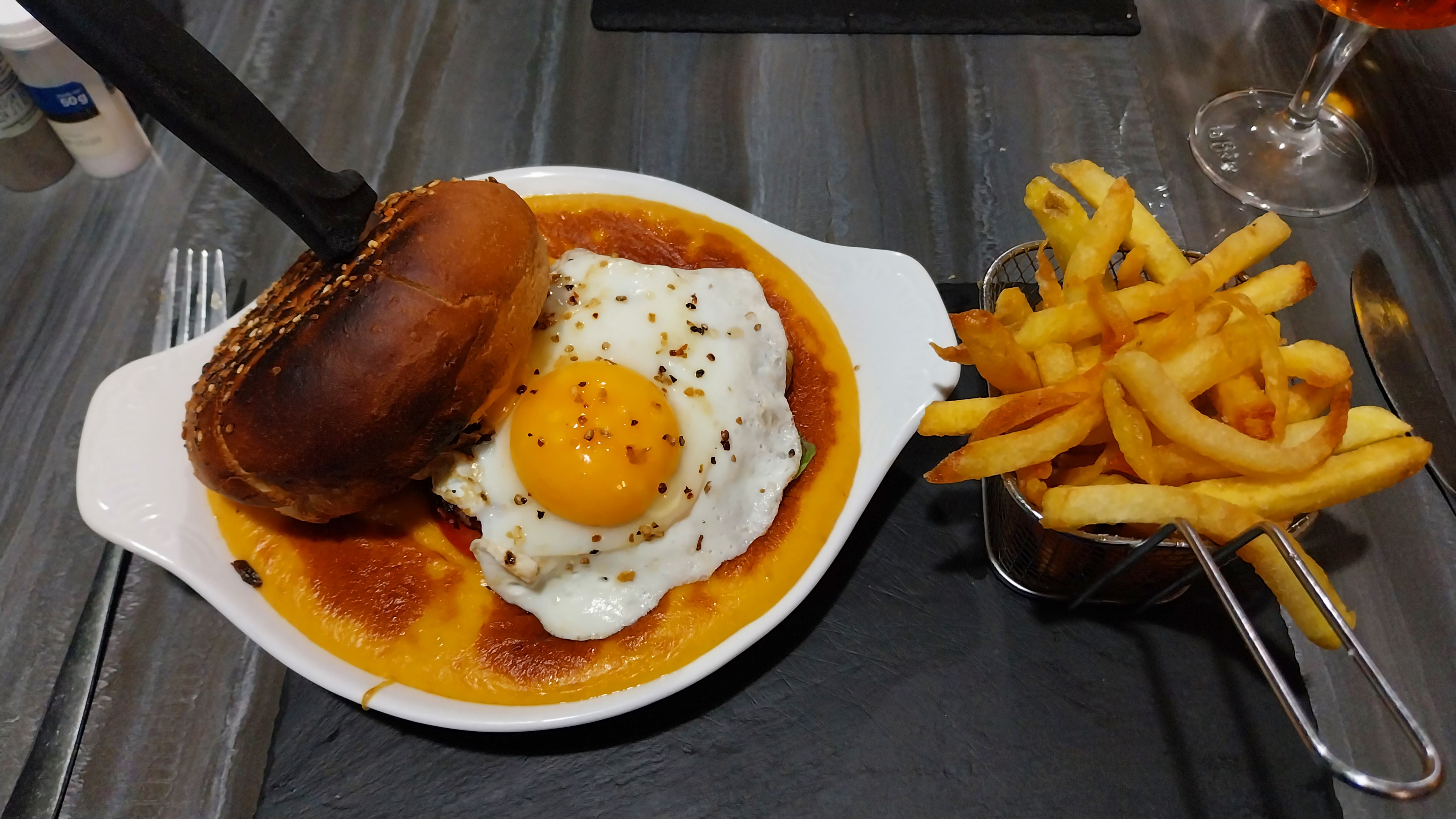 Pour résumé, c'est une friterie déguisée en restaurant. N'y voyez pas du tout une critique, j'adore les friteries. Mais les frites, la sauce, et même le type de burger (cheeseburger+bacon+oeuf à cheval) font penser à ce que vous pourrez trouver dans toutes les baraques à frites du nord, et c'est même plutôt bon dans le genre. Côté décor, le restaurant est une maison tout en longueur reconvertie en restaurant. L'intérieur sens la frite mais la terrasse dans le jardin derrière est bien aménagée, mais ça renforce le sentiment de friterie déguisée. Bref, c'est sympa, mais c'est un peu loin de la brasserie à laquelle on s'attendait