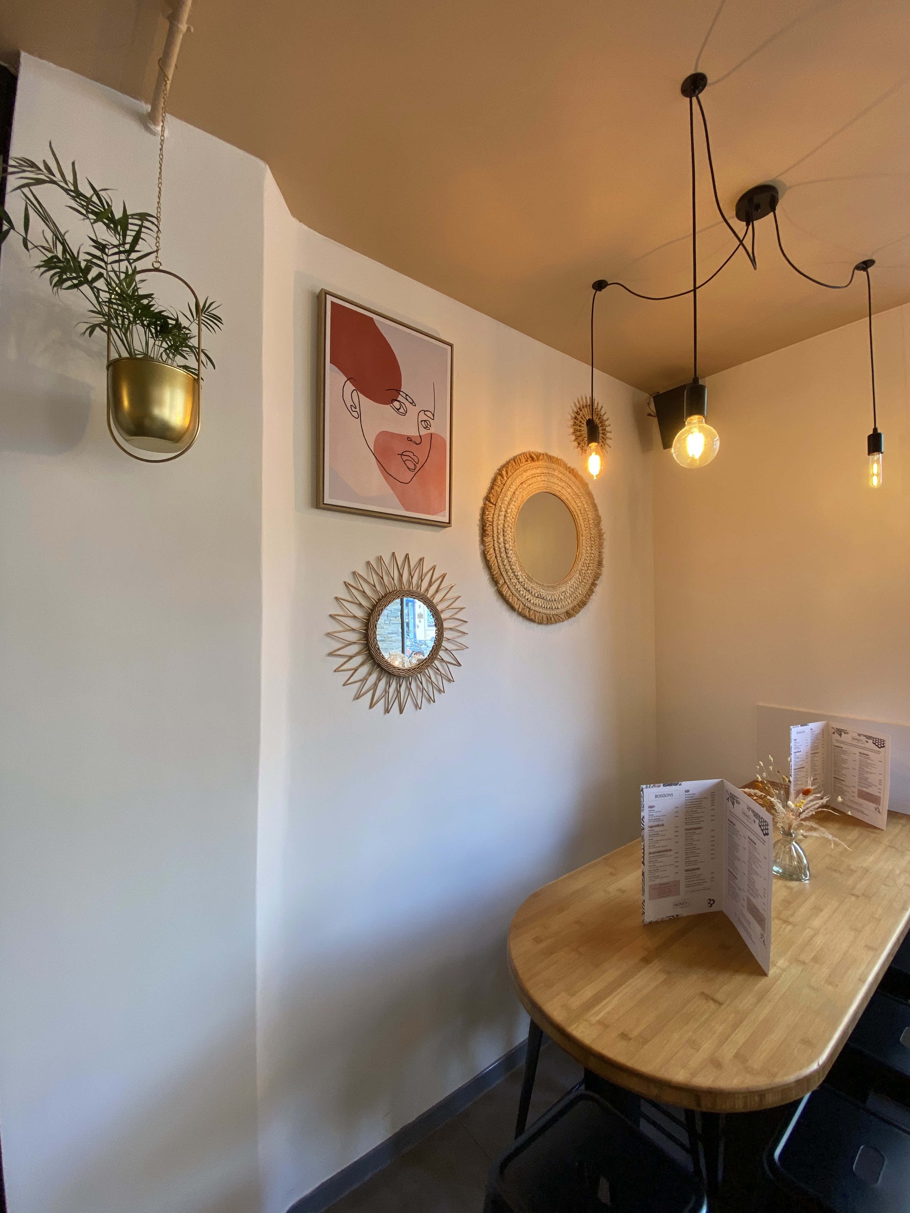 Nous avons pris un brunch exceptionnel chez Honey. Tout était délicieux et chacun s’est régalé. On voit même la préparation des plats se faire sous nos yeux avec les produits frais. La formule « Reine des abeilles » est copieuse et elle regorge de choix tous très alléchants (1 plat sucré et 1 plat salé au choix). Dur de choisir ! Seul bémol, il faut choisir entre boisson chaude ou boisson froide. Les deux dans la formule, en rehaussant un tout petit peu le prix, serait vraiment idéal. J’ai également adoré l’atmosphère très doux et cocooning de la décoration ainsi que les effluves de miel qui flottent dans l’établissement ! À noter que nous sommes venus à 5 et qu’on a pu nous installer sans problème. En tout cas, il faut savoir qu’il n’y a pas de réservation possible. Il existe une carte de fidélité (individuelle) gratuite. Au bout de 10 formules achetées, une formule offerte. (Carte valable un an) En tout cas, superbe découverte ! Merci.