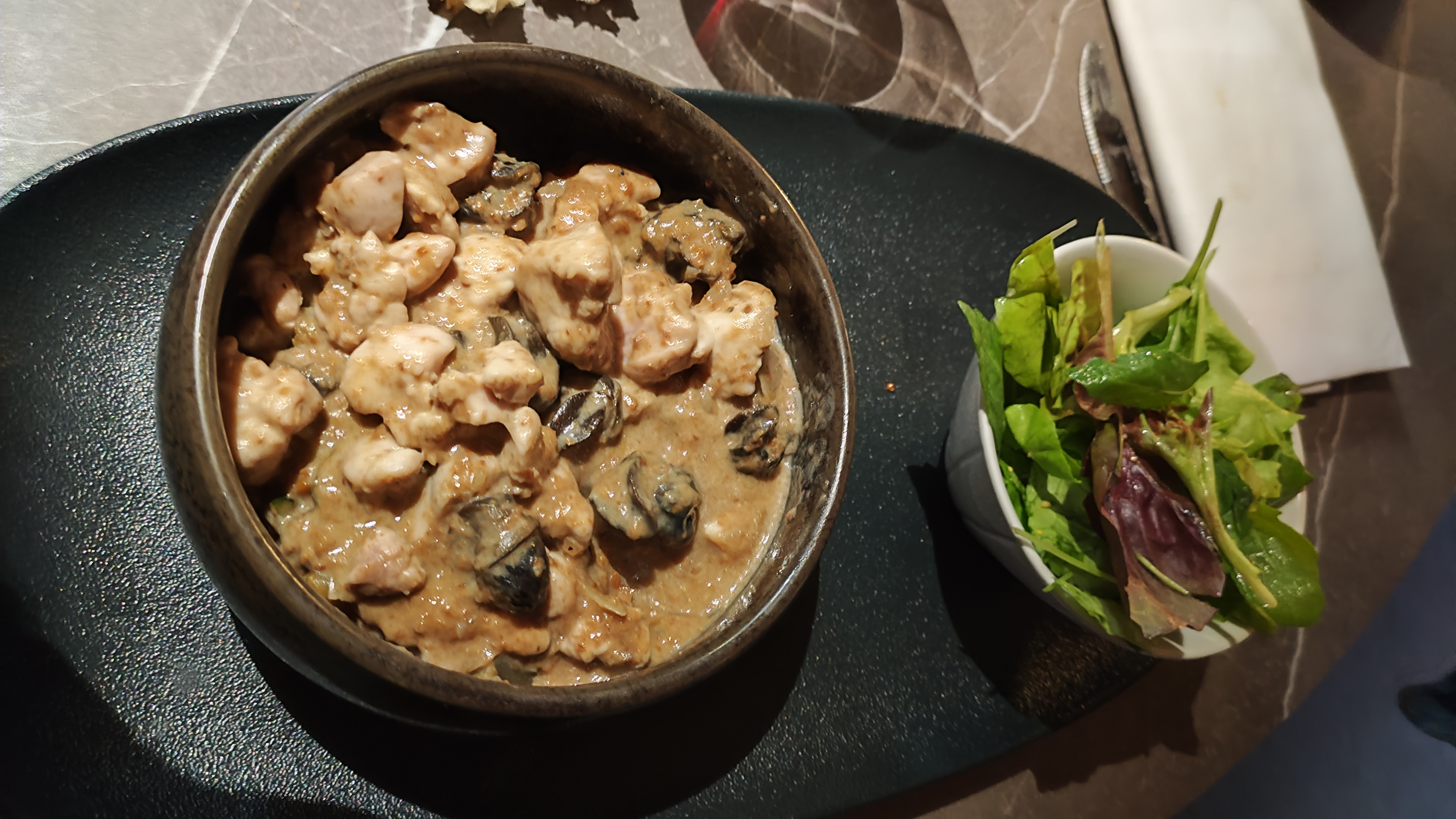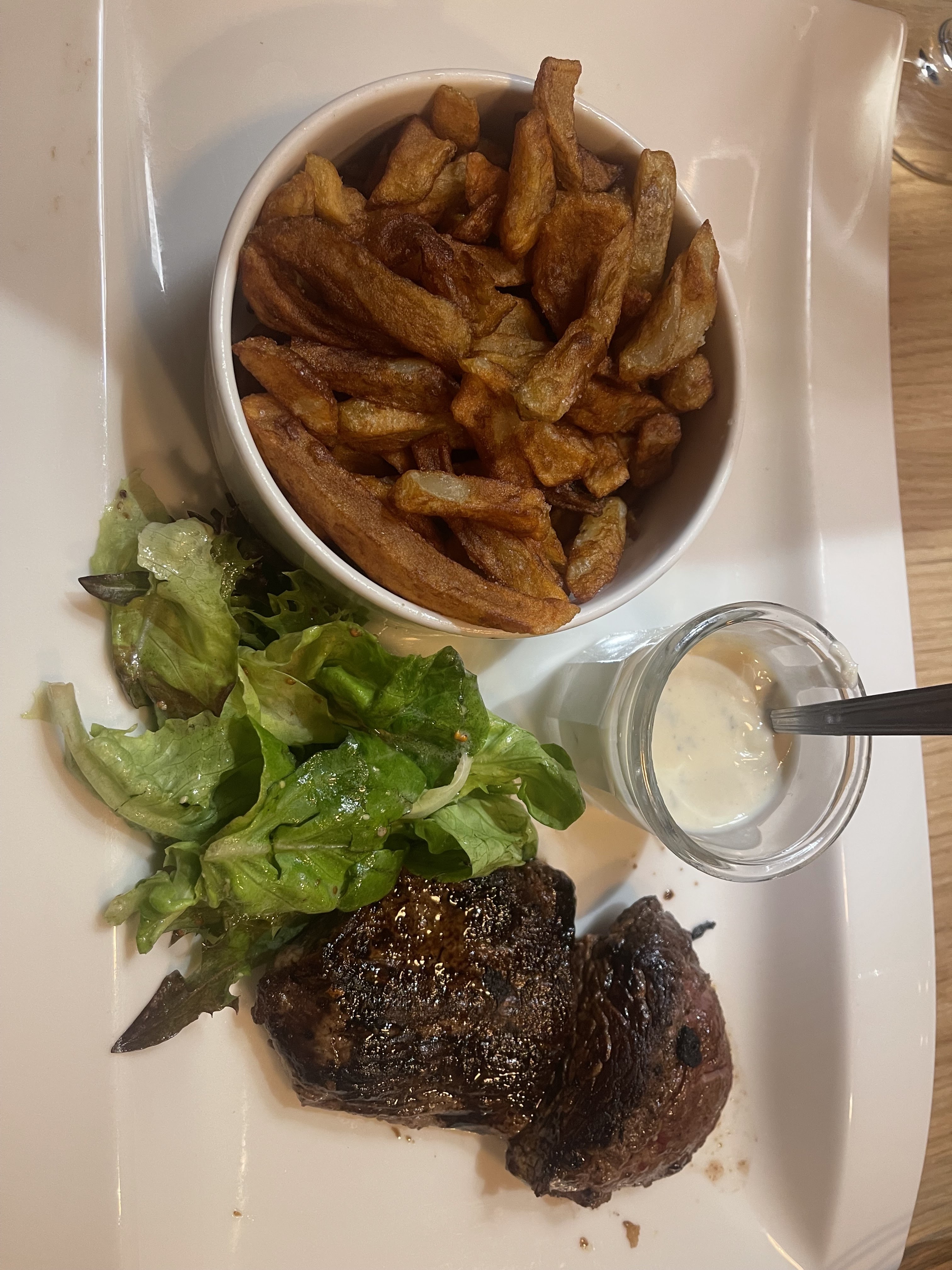 Salade en entrée très bonne et très copieuse mais la viande était trop cuite alors que je l'avais commandé saignante