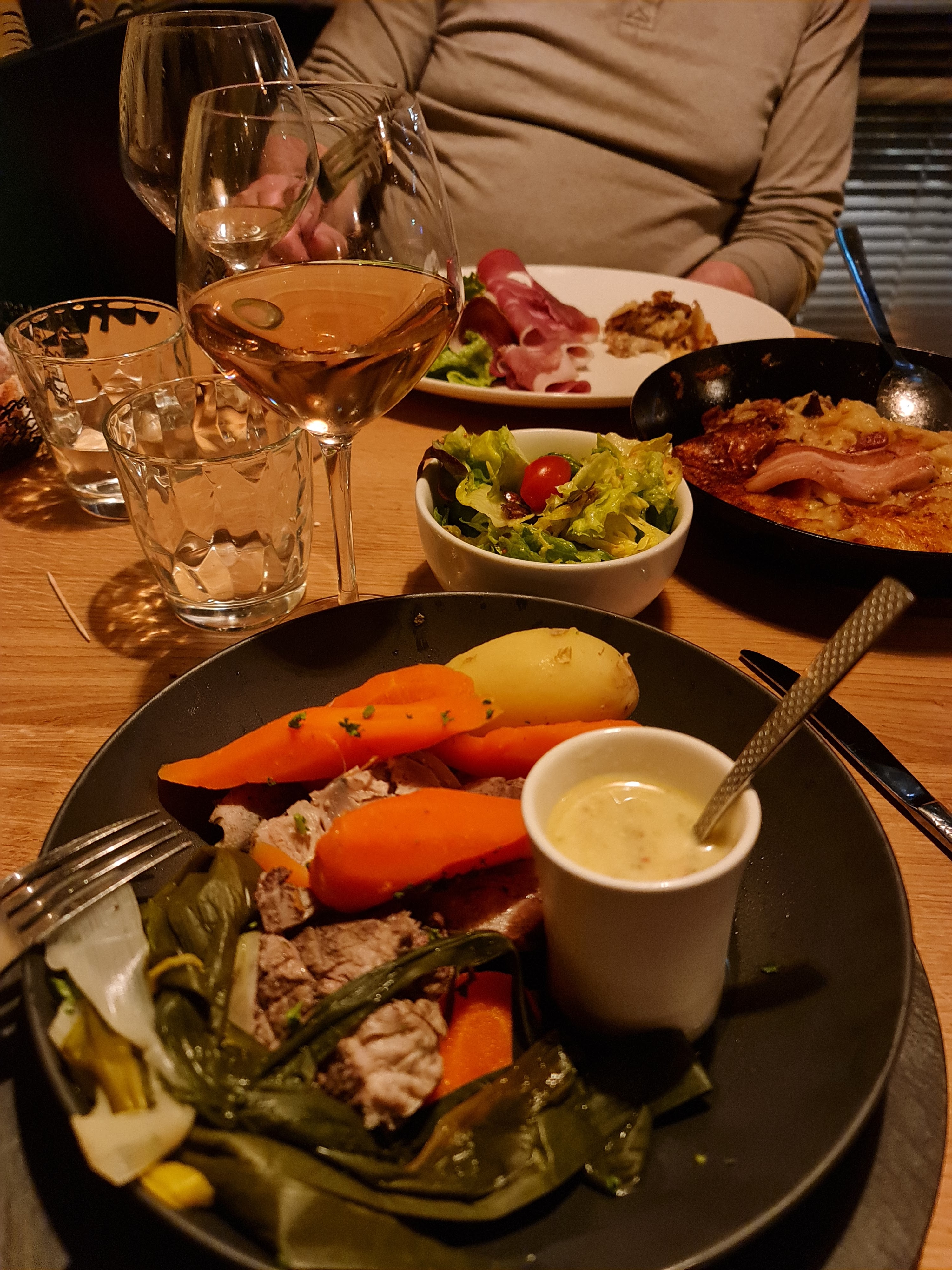 Menu Auvergnat terrine maison servie avec quelques feuilles de salade puis cuisse de poulet pomme de terre rissolées et gaufres.en dessert apéritif et 1 bouteille de Crozes hermitage Pour 4 .le prix de 188€ semble légèrement élevé (45€/personne semble peut être élevé au regard des produits servis :terrine, poulet pomme de terre feuille de salade.