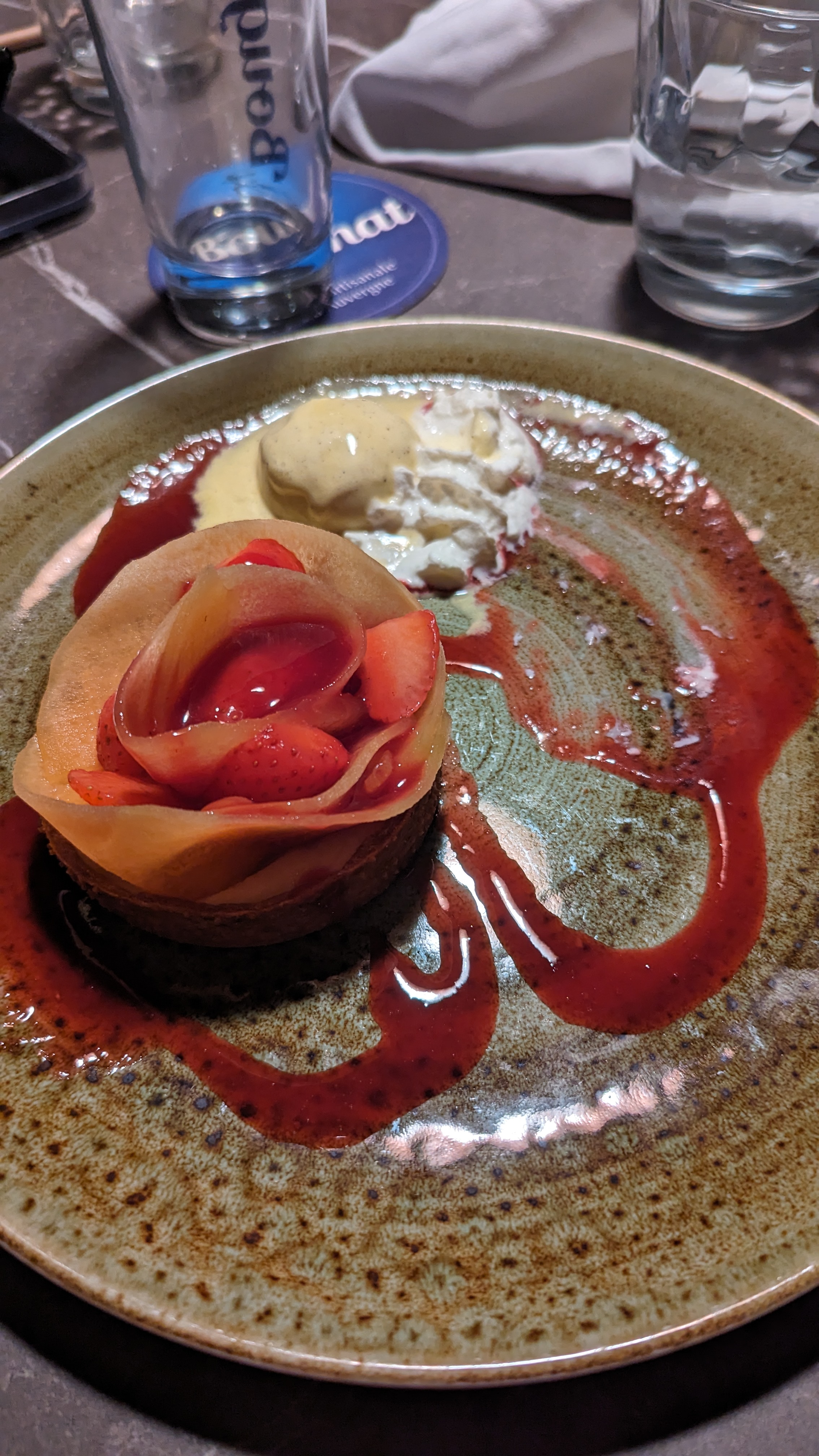Service déplorable, les assiettes sont jeté es sans un mot rien , ou sinon les assiettes fuient sur nos vêtements et le serveur ne s escuse pas malgré nos constations ... ils se permettent d'ouvrir la porte pour les autres tables parce qu'ils ont trop chaud mais les autres tables avaient toujours et nous nous avions tous l air qui nous gelé... c'est vraiment dommage car les plats étaient délicieux et les desserts aussi mais petit bémol le dessert était un peu trop cuit pour moi . Sinon je recommande pour la cuisine mais alors le service pas du tout