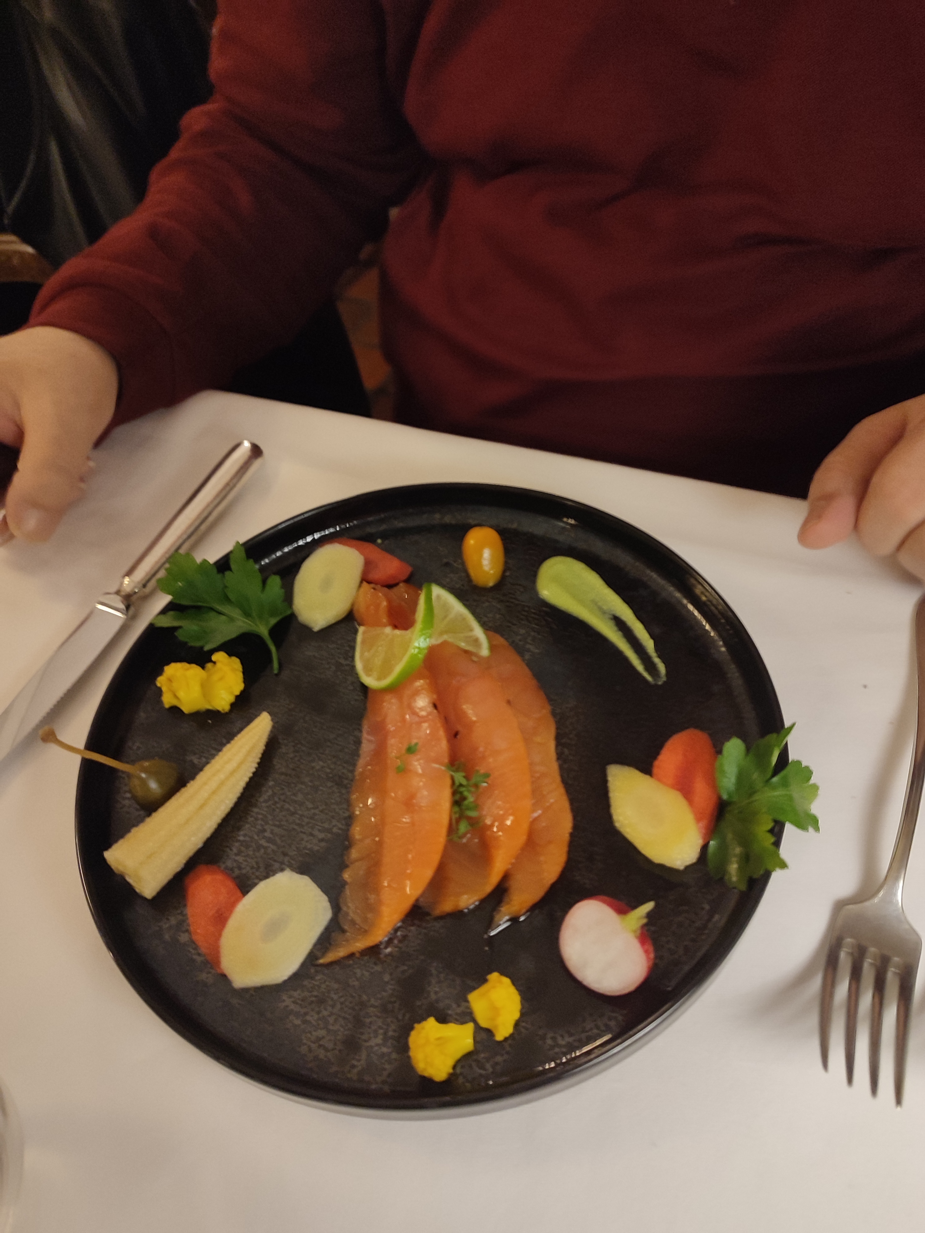 Restaurant traditionnel, beau, on est content et le service est sympathique au premier abord. Bonne carte des vins. Mon entrée, une salade de feuilles de saumon fumé et de crevettes, était tout à fait correcte, malheureusement sans une bonne vinaigrette et présentée d'une manière ou d'une autre sans aucun esprit. Le saumon n'avait pas très bon goût. Le plat principal, un gigot d'agneau aux légumes, était incroyablement fade, sans aucun goût, tout comme les légumes. La viande était de mauvaise qualité et ne sentait pas particulièrement bon. Je m'en suis plaint et j'ai reçu une réponse peu amicale. Une petite excuse aurait été la moindre des choses. En tant qu'invité, vous n'êtes apparemment pas très apprécié ici. Je ne peux pas du tout recommander le restaurant, non seulement les prix sont trop élevés pour cette qualité de nourriture, mais la nourriture, du moins celle que j'ai commandée, n'était pas bonne. Globalement très décevant. Cependant, elle ne pouvait pas se tromper avec le vin...