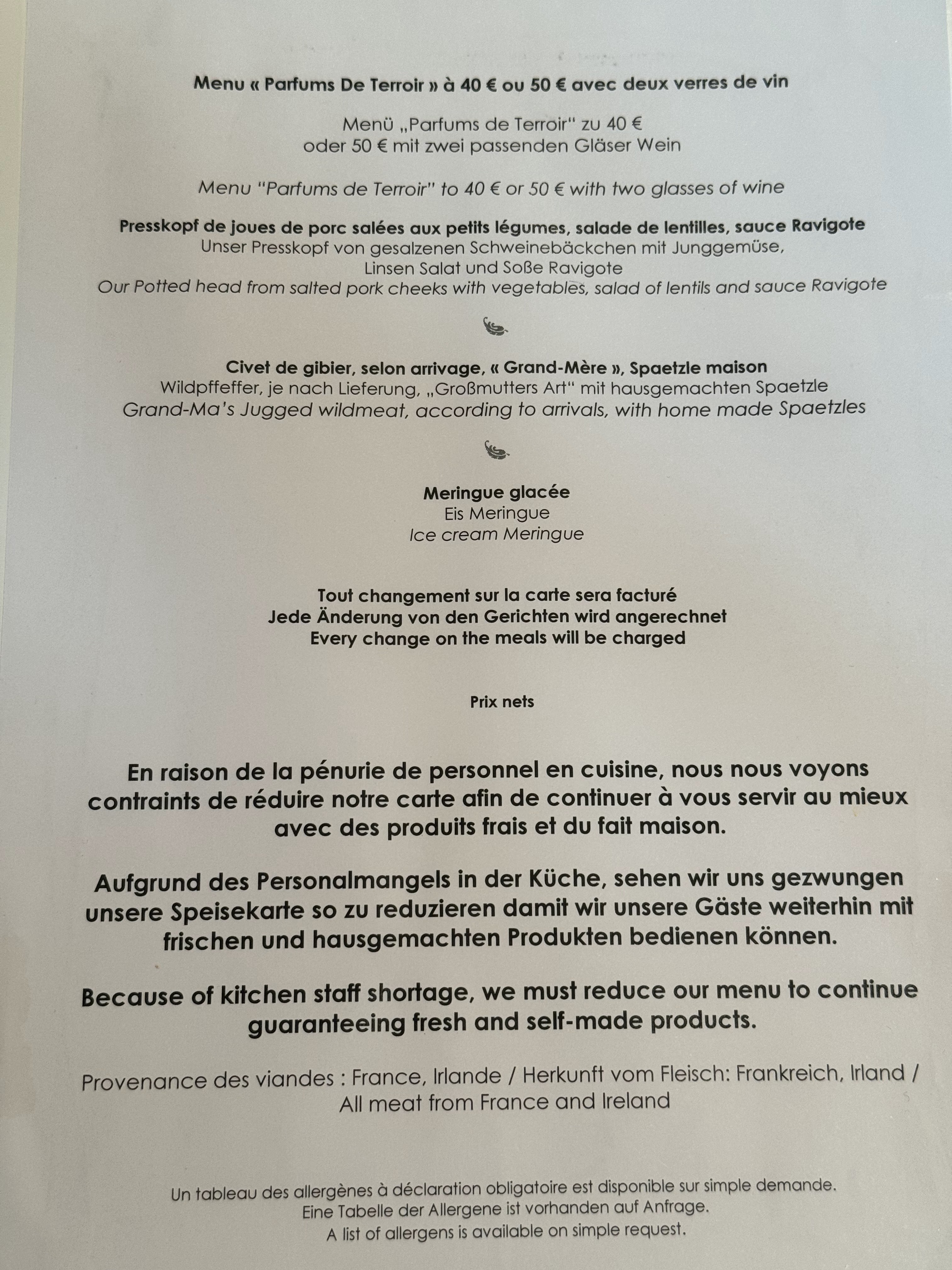 Nous avons dîner sur place. Carte typiquement Alsacienne, qui propose des plats du terroir. Je recommande le sanglier en civet, nous nous sommes régalés. Peut être que la carte des vins et des bières meriterait quelques références en plus.