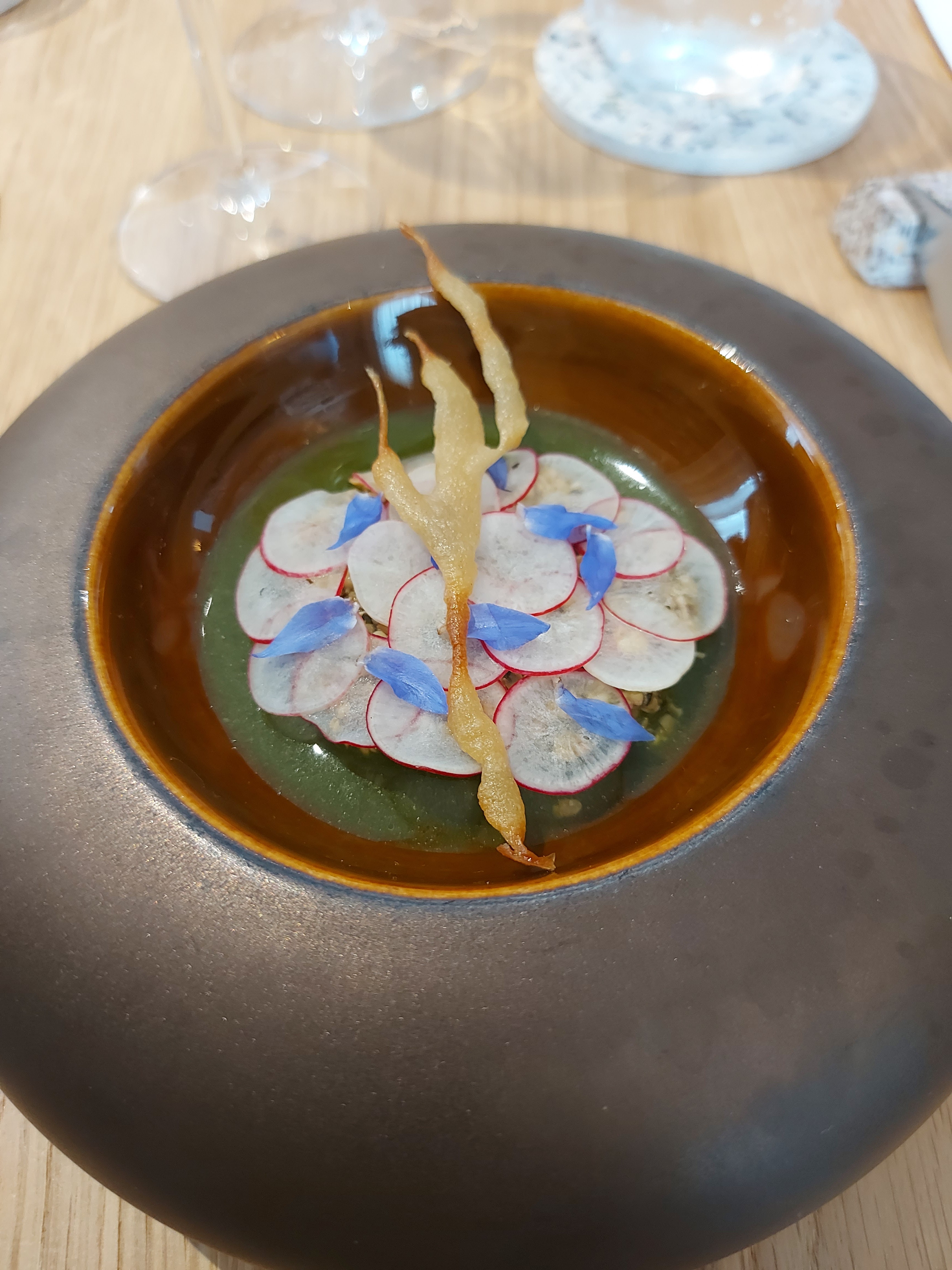 Escapade et poésie culinaire en mer d'Iroise, cette colombe aux ailes iodées et au zen insolent. Ce fut un festival d'arabesques de saveurs, éclatantes au palais, surprenantes à notre plus grande surprise. Et toujours ce ressenti, celui de la passion de celles et ceux, qui derrière le rideau, oeuvrent pour notre plus grand plaisir.