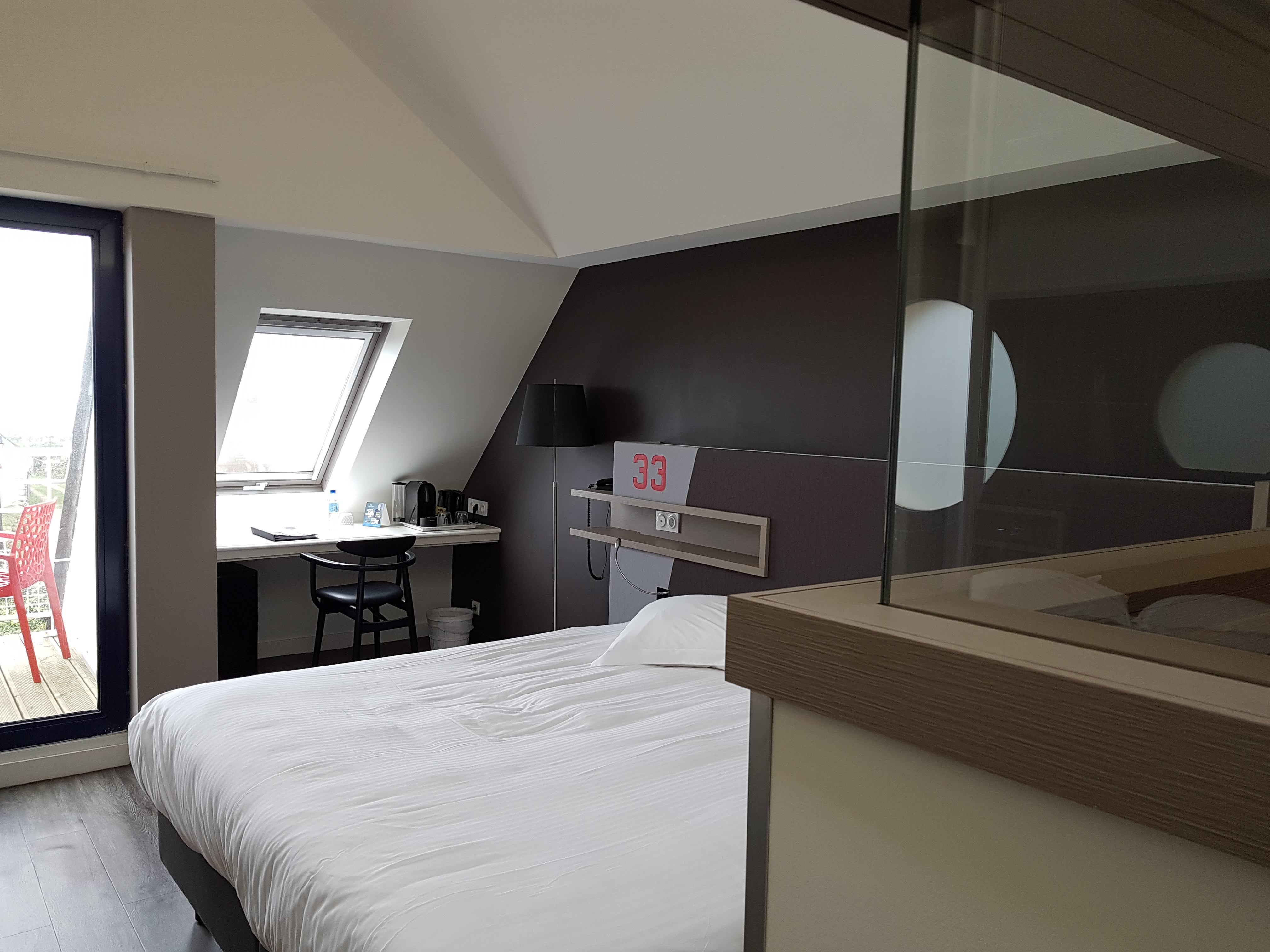 Grande chambre spacieuse et vue le phare et petite vue mer (No 20 étant sur le côté arrière) j'avais payé 25€ de plus pour avoir la vue mer, donc un peu de frustration ... Lit très confortable, déco moderne, grande terrasse qui doit être agréable en été. Petit bémol, pas de porte entre salle de bains et chambre alors que la fenêtre sdb n'a pas de rideau occultant. Salle de bain froide. Pas de produits dans la salle de bain, un lait corporel serait bienvenu. Peignoirs confortables, prêt de maillot de bain, chaussons trop petits pour les hommes. Belle piscine bien chauffée, jacuzzi manque un petit degré ou 2. Petit déjeuner très copieux, produits de qualité.