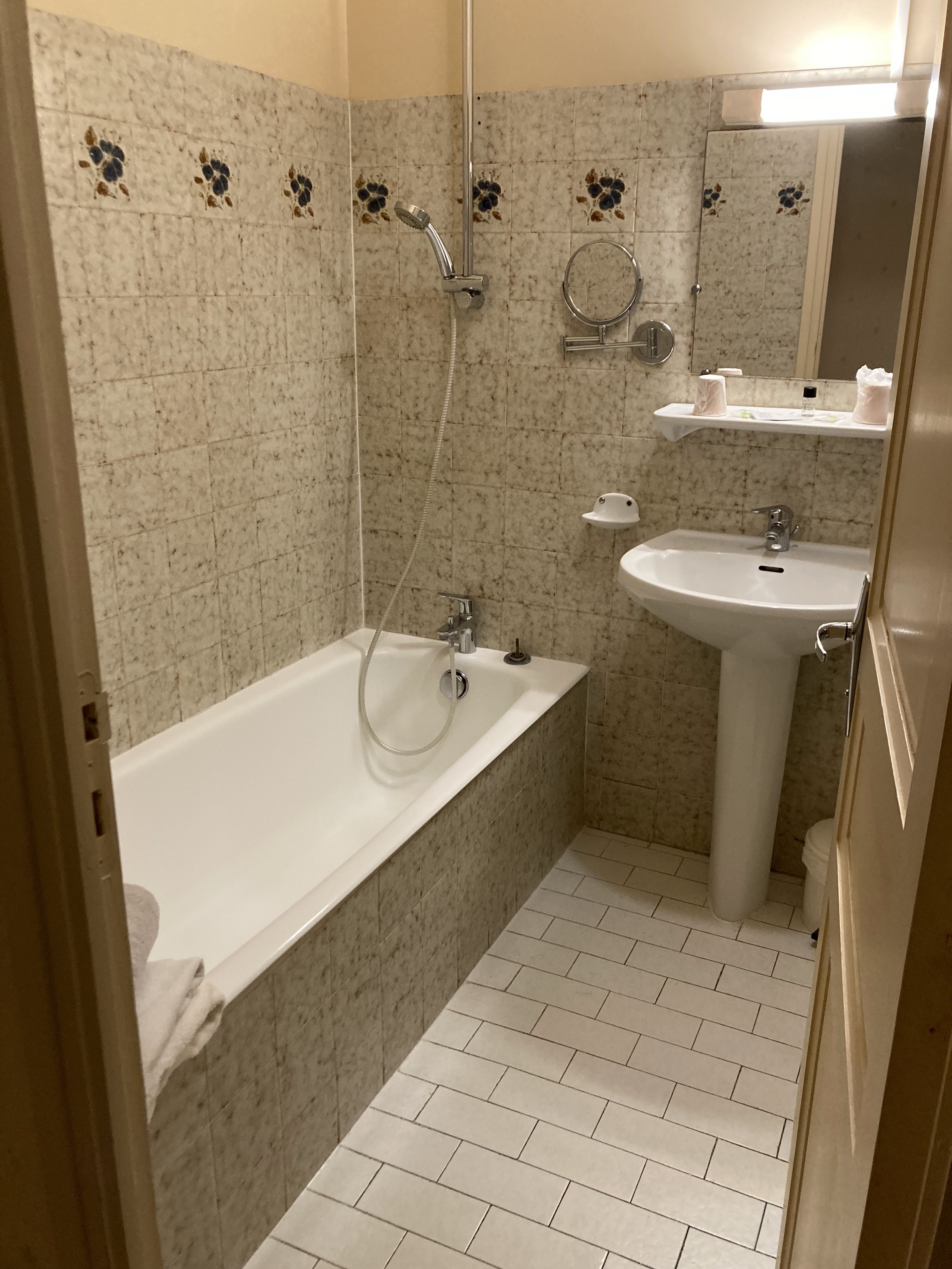 C’était un peu comme revenir, j’imagine, aux années 1950. Le bar et la salle à manger de l'hôtel étaient impressionnants par leur taille, leur décoration et leur style (ancien). Le menu était à 28€ pour 3 plats. Cela avait l'air bien mais trop cher pour nous cette fois. Nous avions les chambres 28+27 au deuxième étage (vue sur le village et les collines lointaines). Elles sont reliées par une porte, donc bien pour les familles (double + twin). 80€. Le petit déjeuner était très bon à 8€50. Nous avons plongé rapidement dans la piscine, ce qui était délicieux. Les chambres que nous avions étaient grandes, mais avec une décoration vieillotte et des meubles démodés (vous vous souvenez des années 1950 ?) ; Le lit double était parfait, très confortable. Les salles de bains avaient une bonne sélection de serviettes et d'articles de toilette. De nombreuses chambres disposent de petits balcons donnant sur le jardin arrière et la piscine. J'espère en réserver un la prochaine fois. Le personnel de l'hôtel que nous avons rencontré était gentil.