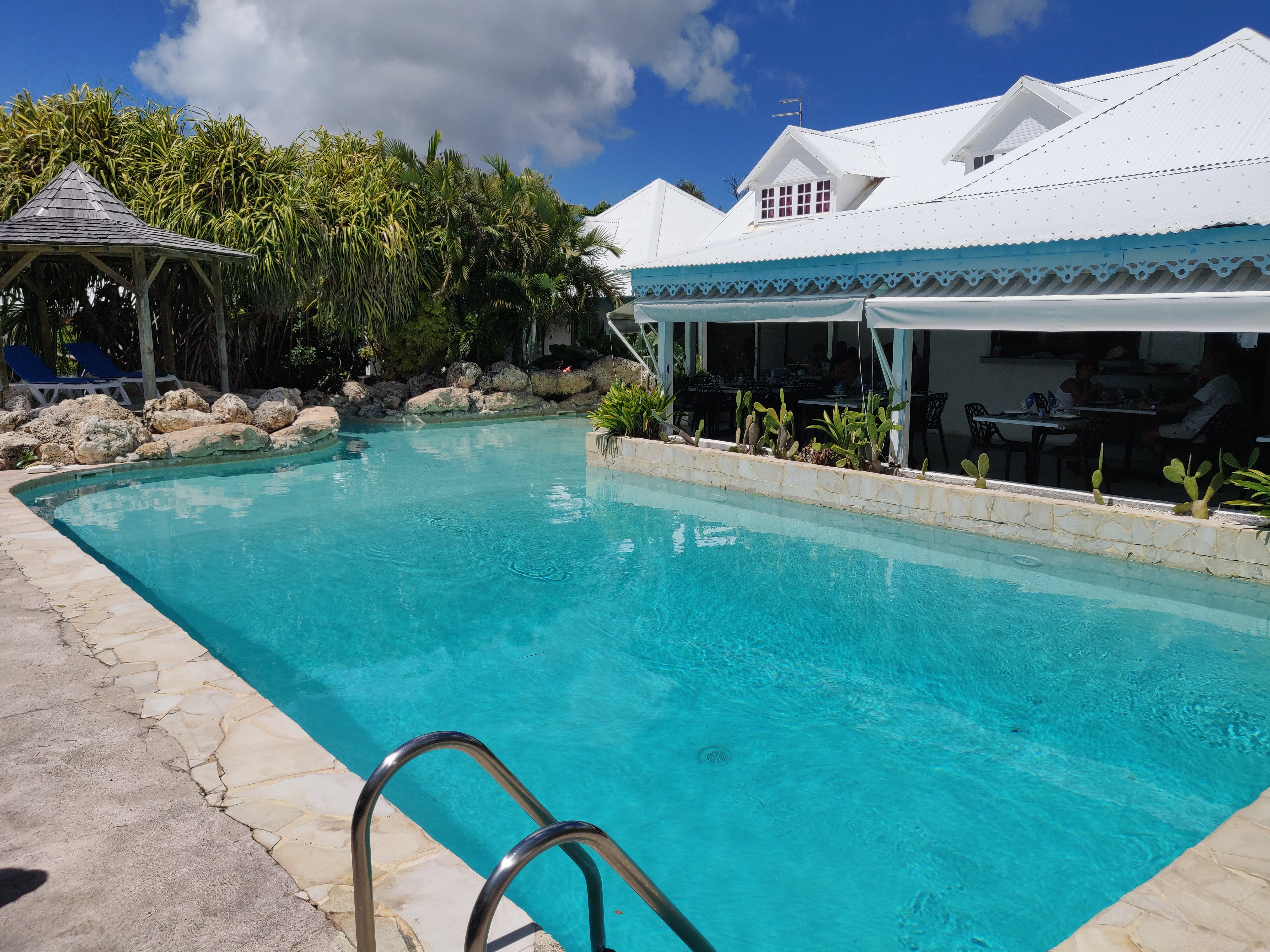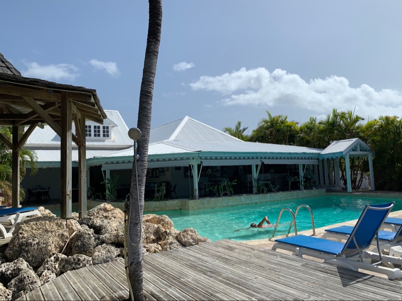 Petit hôtel avec bungalows et quelques chambres équipées simplement, mais confortables. Belle piscine avec jacuzzi intégré. Le restaurant est très correct et le cuisinier plein de talents. L'accueil et les conseils du directeurs sont un plus pour les ballades. J'ai été déçue par les petits déjeuners qualifiés de fabuleux par certains, je les ai trouvé très ordinaires, avec au départ du pain de la veille dur et désagréable. Il a fallu demander pour avoir du pain frais... 😒C'est dans l'ensemble un lieu agréable et calme, bien situé pour explorer le nord de grande Terre.