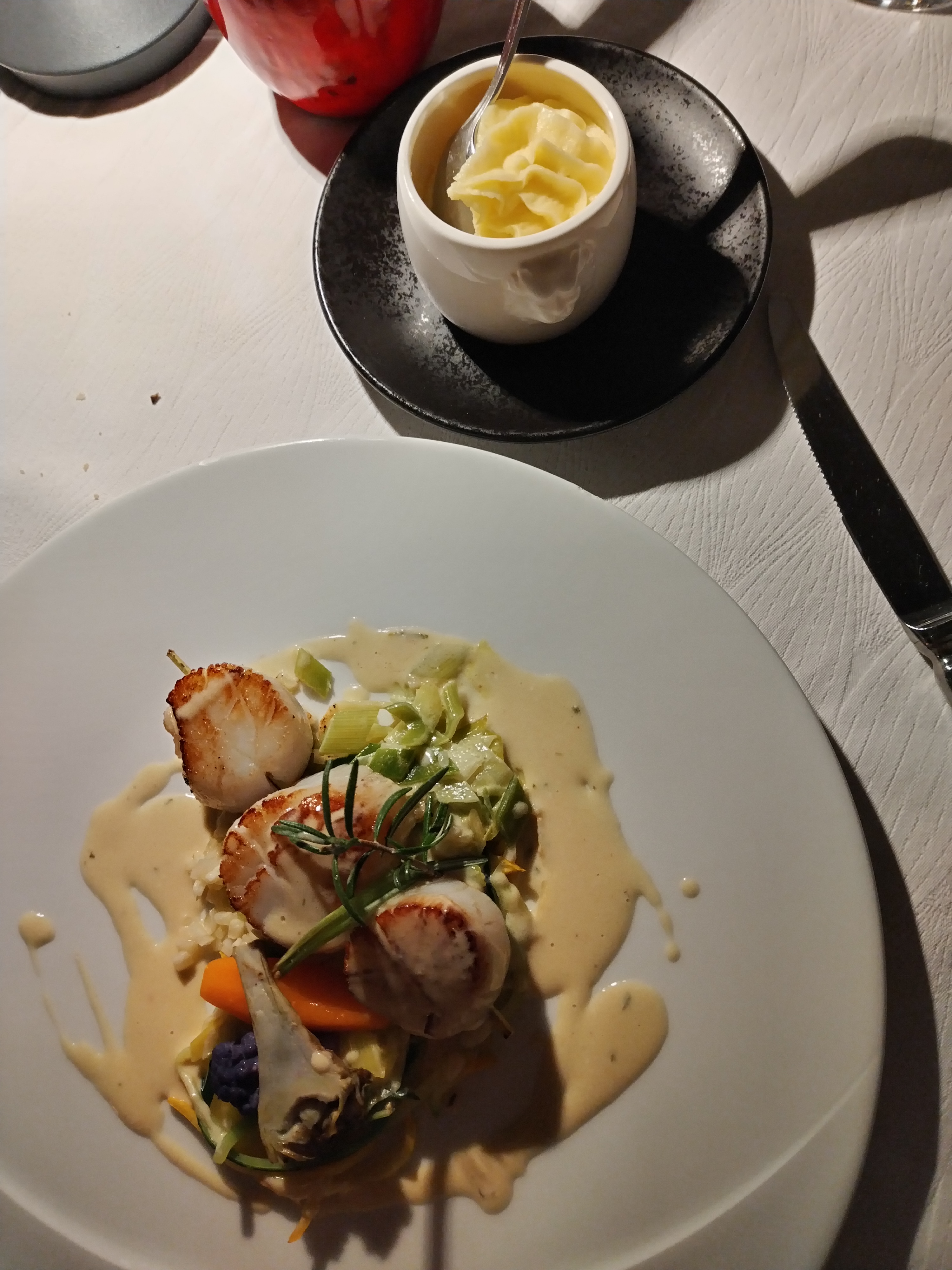 Grande fan de saint Jacques, habituellement dans d autre restaurant j ai soit une entré soit le plat, mais la j ai eu la chance d'avoir un menu saint Jacques complet, velouté, carpaccio, brochette, tous a la saint jacques. Cuisiné à merveille, en bonne quantité, la taille des saint jacques est impressionnante, fraîche du jour. Un pur bonheur. Dans un ambiance calme et cosy, avec une petite musique de fond agréable et apaisante. Ne regrette pas l arrêt, et compte bien y retourné.