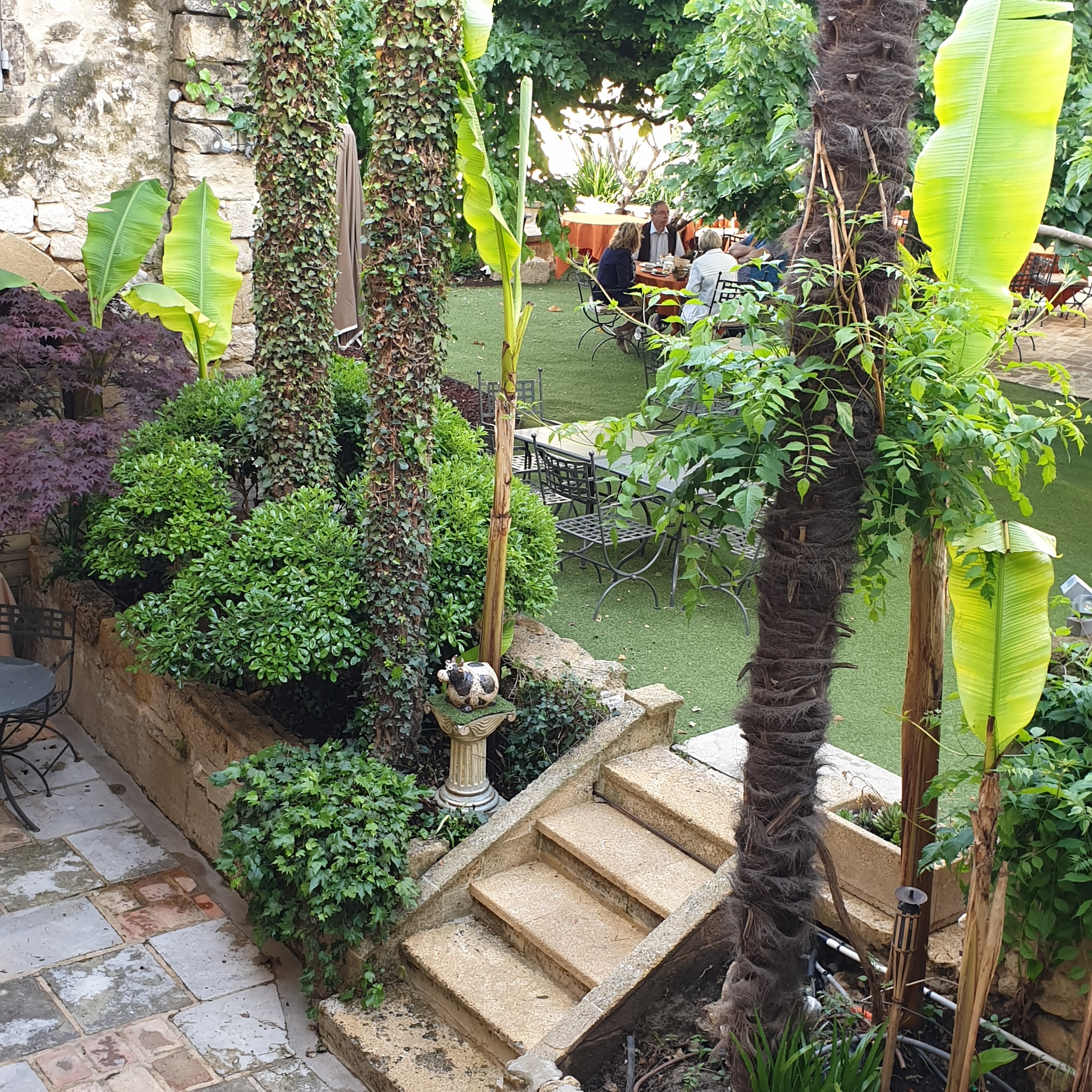 La cours ombragée permet d'être éloigné de l'agitation. Une cuisine inventive est au rendez vous.