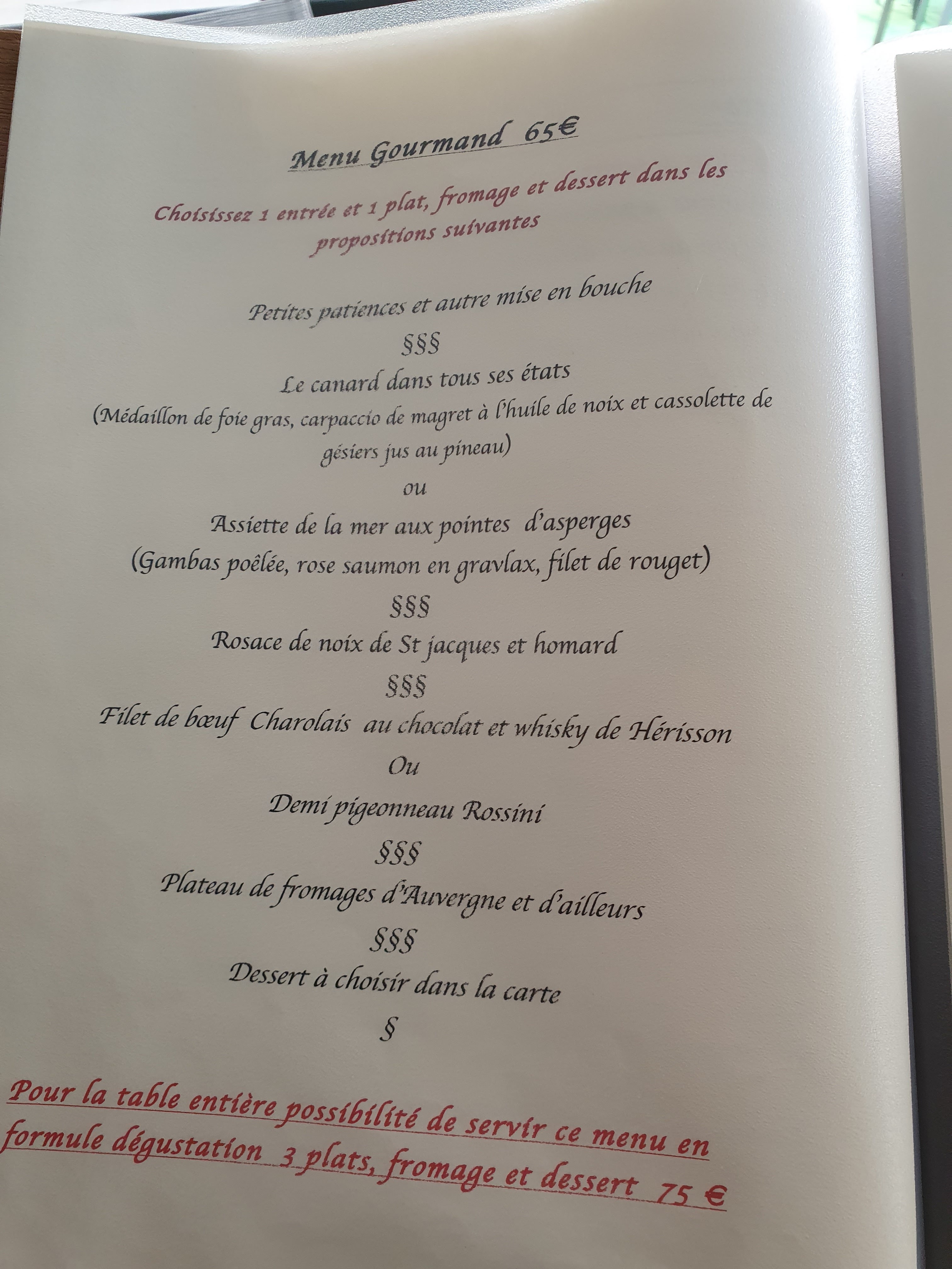 Repas de Saint Valentin. Nous étions de passage. Menu à mon sens un peu cher si on le compare au menu usuel à 35 €. .Le chef exécute de plats accompagnés de sauces habilement préparées et le service est attentioné, classique et très bien , il va jusqu aux miettes avant le dessert ce qui est très agréable. L'accueil a été très sympathique malgré notre retard par rapport à l horaire de service. Visite du maitre de maison à la fin du repas très appréciée. Le maître d' hôtel assure un service de qualité épaulé par la maitresse de maison.Une bonne expérience. Personnellement je porterai attention sur la vue générale de l établissement qui mériterait un petit lifting. On est loin du laisser aller mais ...Un bonus aux desserts : très bons.