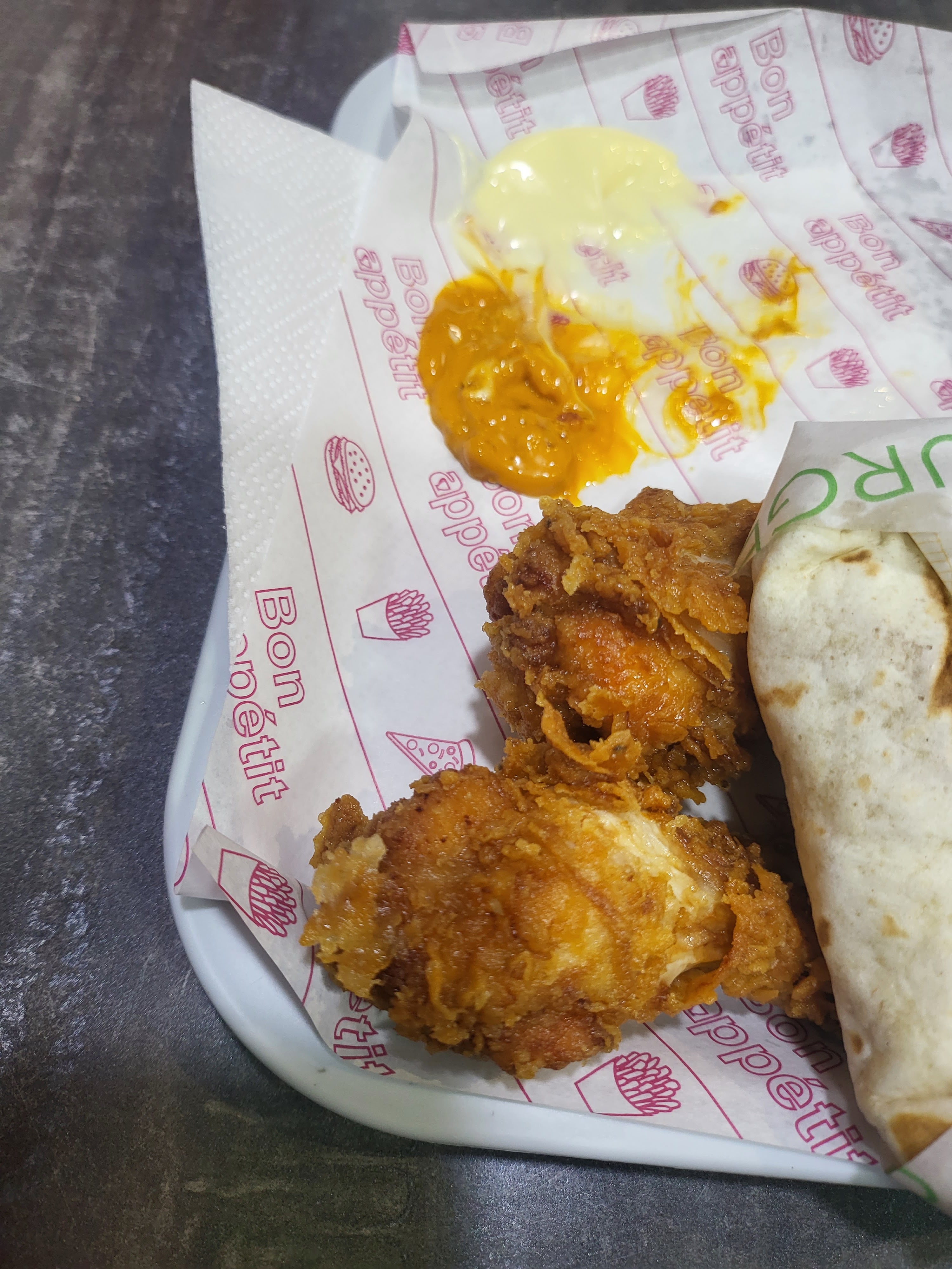 Le poulet est bon et a été servi rapidement. Pour un fast food c'est raisonnablement gras. Le personnel à l'entrée fait ce qu'il faut. Je ne mets pas 5 étoiles car il faut quand même raison garder ça reste De la junk food
