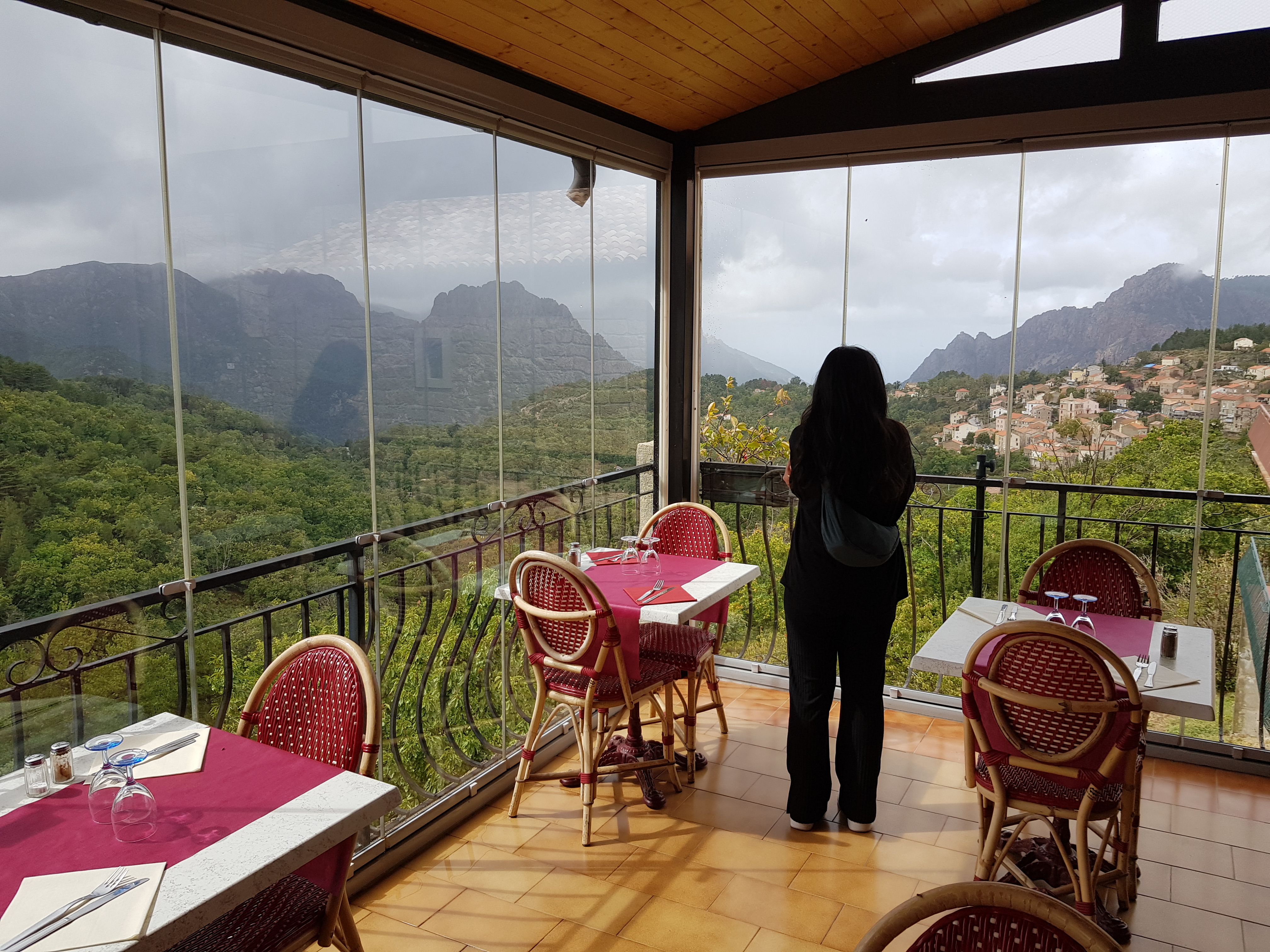J'ai mangé au restaurant avec des amis d'Evisa, le menuisier. Super, très bon repas et vue imprenable sur la mer à travers les montagnes corses. Grandiose !!!! La salle est au dessus du maquis, dans le village et domine toute la région. A voir et à déguster avec de vrais Corse.