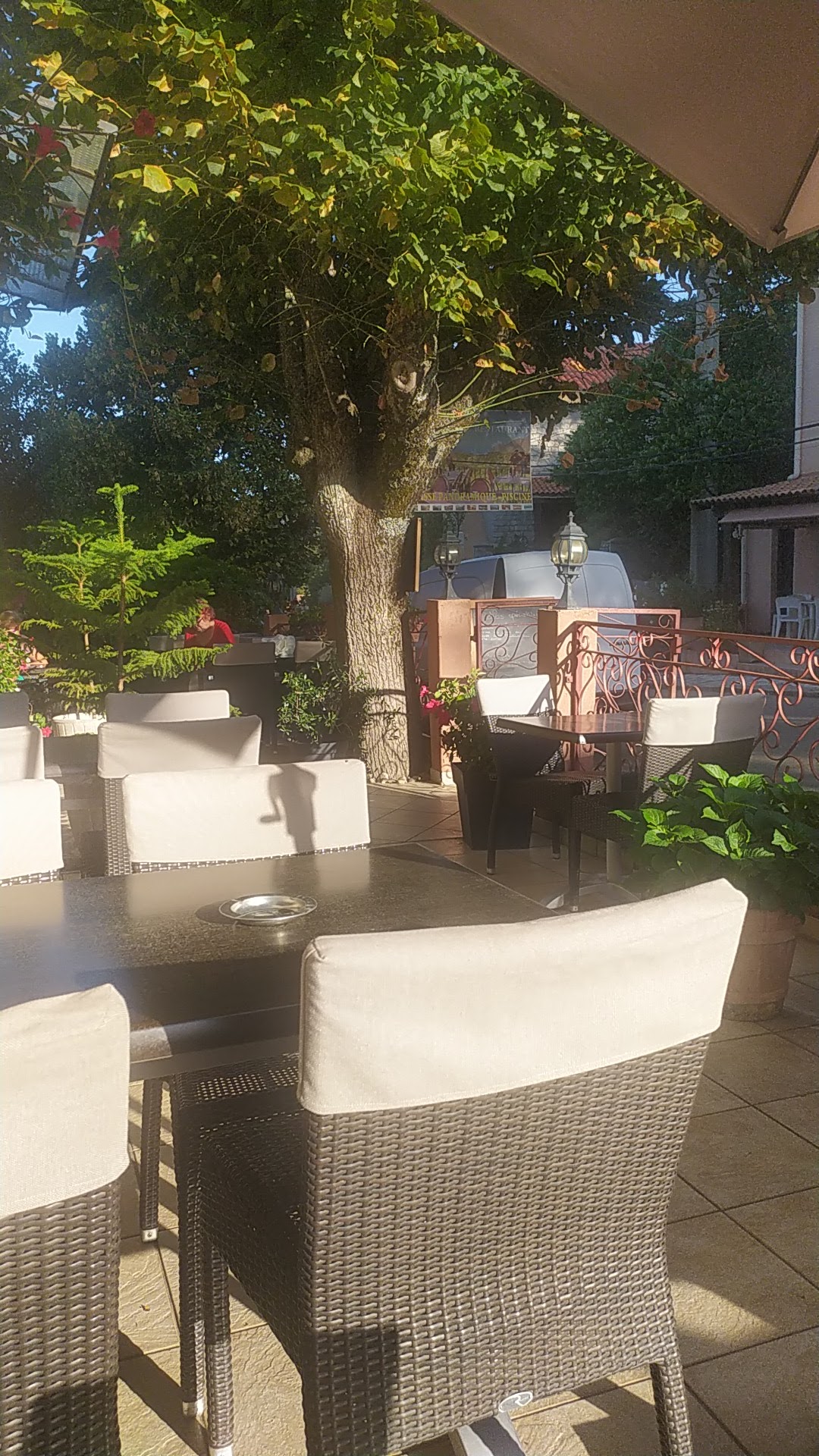 Bel hotel avec piscine et une superbe terrasse. Accueil chaleureux. Petite chambre. Pas de sèche cheveux. Restaurant décevant : menu à 25 euros testé, menu continental. Point positif : garage à moto gratuit.
