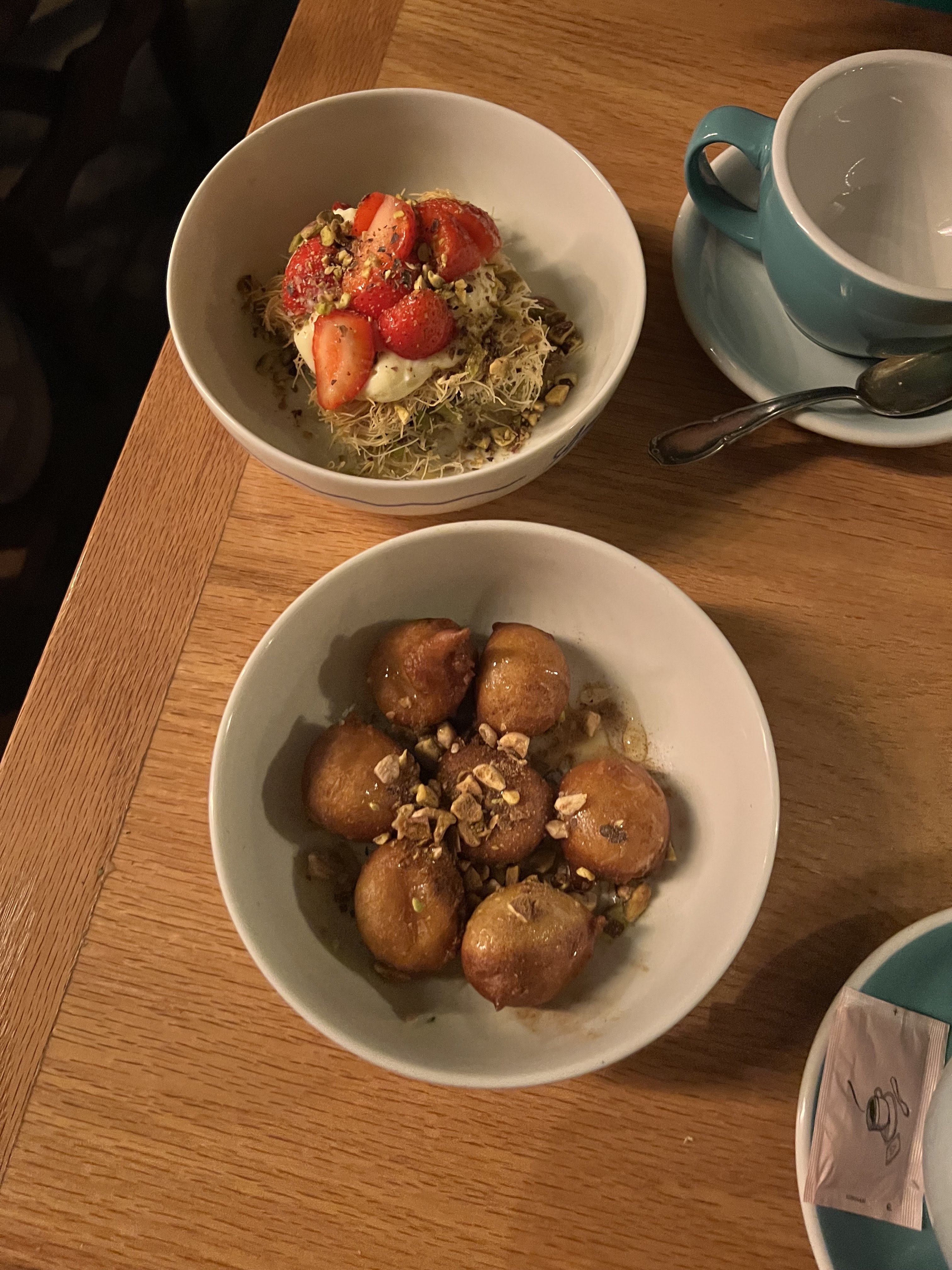 Un super cadre, un service adorable et des plats non seulement beaux mais délicieux ! Nous avons payé 126€ pour 4 entrées, 4 plats, 3 desserts et 4 boissons. - les asperges feta miel sont incroyables - la salade betterave saumon fumé fraîche et jolie - le halloumi excellent - le tirokafteri plein de saveurs avec 2 types de pains Puis - l'épaule d'agneau confite la plus fondante qu'on ait eu - le poulpe cuit à la perfection, grillé avec sa sauce - la dorade rose (pêche du jour) grillée et juteuse Enfin - mille-feuille kumquat avec sa confiture amère, très léger - loukoumades frites à la commande crispy et fondantes (sauce chocolat bien noir et pistache brisées) - riz au lait pas trop sucré, complimenté par une sauce caramel parfaite et pistaches brisées Ce cadre est idéal pour un bon petit repas à partager entre amis dans une ambiance tamisée. Carte des vins fournie et intéressante, plein de choix du côté boissons (à noter que certaines comme matcha latte, golden latte etc ne sont disponibles que jusqu'à 18h!).