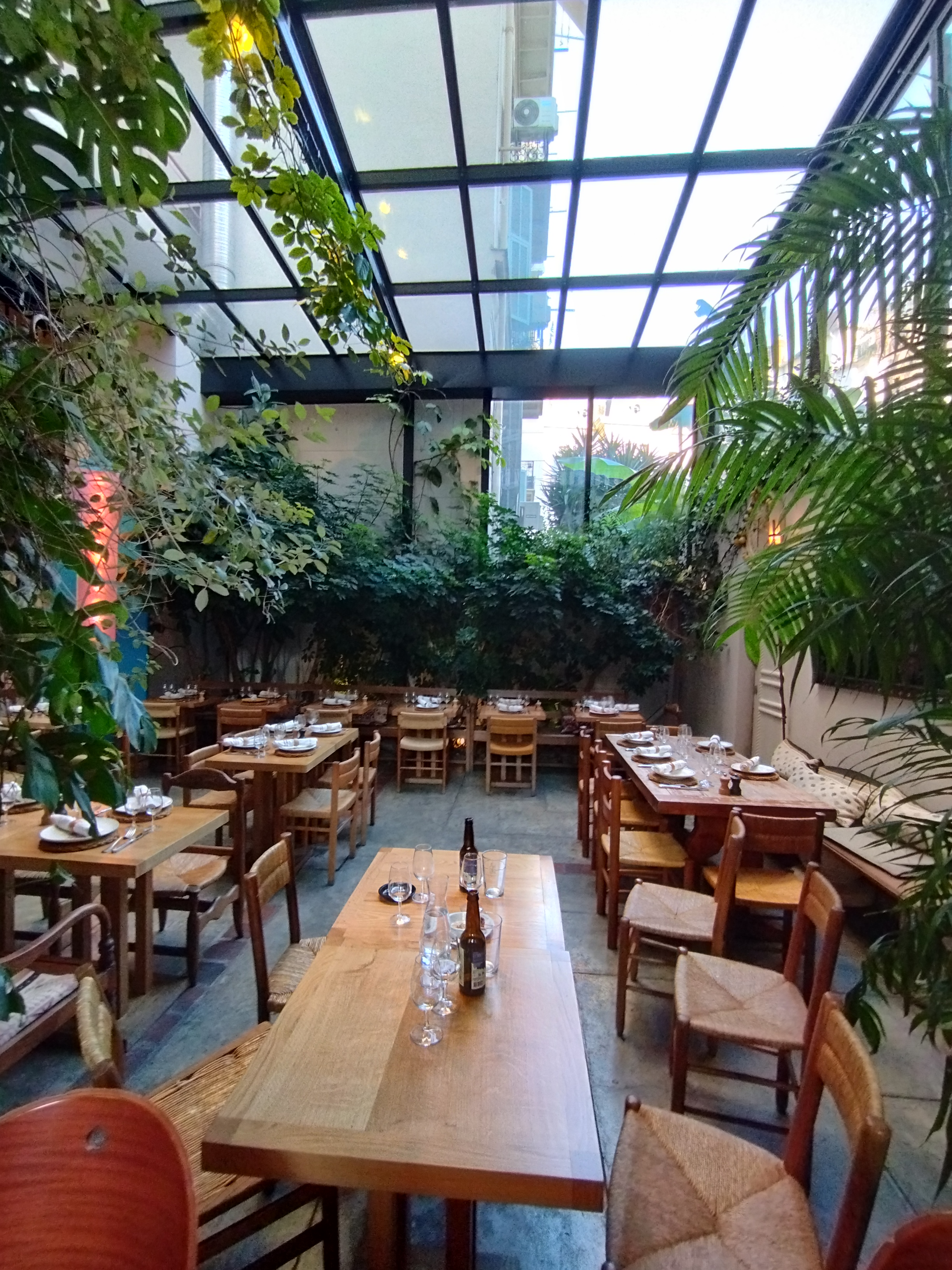 Très joli restaurant dans cet hôtel situé dans une cours intérieure niçoise, beaucoup de verdures, mobilier cosy, ambiance tamisée. Côté ambiance, il y a de la musique que ça soit en semaine ou le week-end, peut être être gênant si on souhaite échanger en toute tranquillité à moins que la table ne soit située à un autre endroit que la terrasse intérieure, a l’étage par exemple. Côté plats, excellent! Nourriture grecque, de très bonnes saveurs, joliment présentée. plats peu copieux cependant, pour les hommes cela peut être un peu juste. Légère déception sur les desserts notamment les beignets qui sont trop quelconques. Le gâteau à l’orange est très bon. Côté service, serviabilité aléatoire en fonction des serveurs/serveuse. Malgré cela, bon accueil globalement.