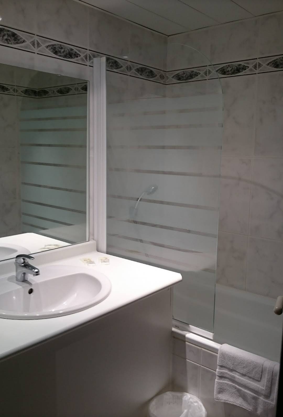 Accueil à l'arrivée au matin, très jovial et agréable. Ce qui n'a pas été de même l'après-midi : juste professionnel. Parking privé éloigné, non gardé, boueux. Impossibilité de venir dans la rue de l'hôtel à cause de travaux. La chambre et la salle de bains sont vétustes : le matelas est mou, pas du tout confortable. La salle de bain avec la baignoire sabot et le bidet date des années 70. Trois étoiles dans les années 70, qui ne mérite plus que 2 à notre époque. Une seule carte d'accès par chambre, ce qui fait que lorsque une personne sort de la chambre, il n'y a plus de lumière.
