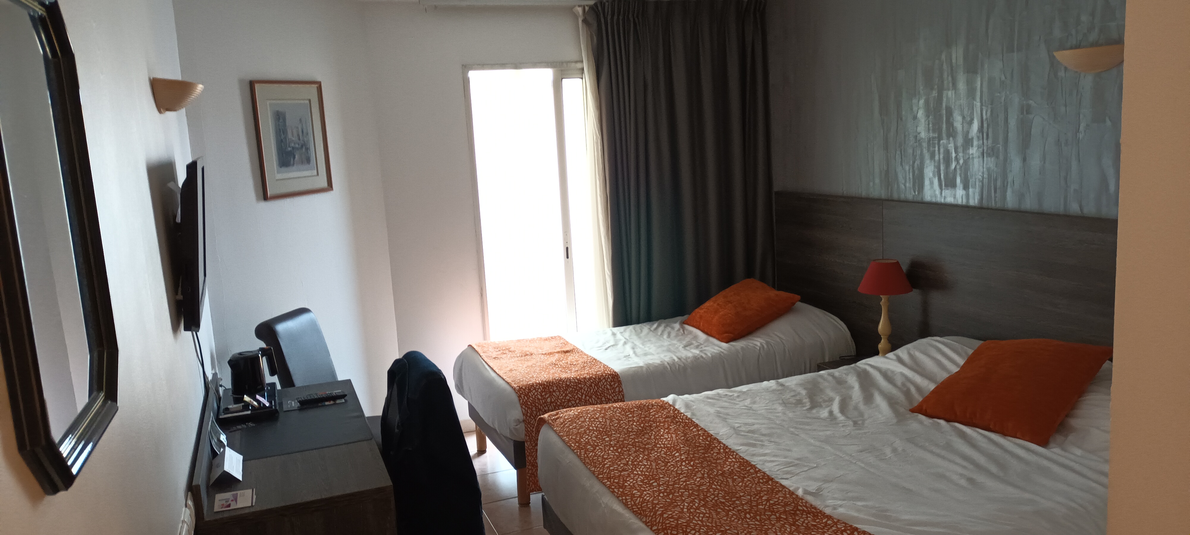 Le personnel de l acceuil est très sympathique .grand parking , la chambre réservée était propre de taille convenable ,toilette séparé . La literie était confortable ,petite terrasse mais pas de siège mobilier de terrasse . Le petit déjeuner servi à table , dommage qu avec le covid il n y avait pas de produits salés ni de fruit mais il y avait de la viennoiserie ,pain, confiture miel beurre . Petits points négatifs : j aurai aimé des serviettes de bain de meilleures qualités et un petit nettoyage au niveau de la terrasse de la piscine J' ai passe une nuit c était donc très bien