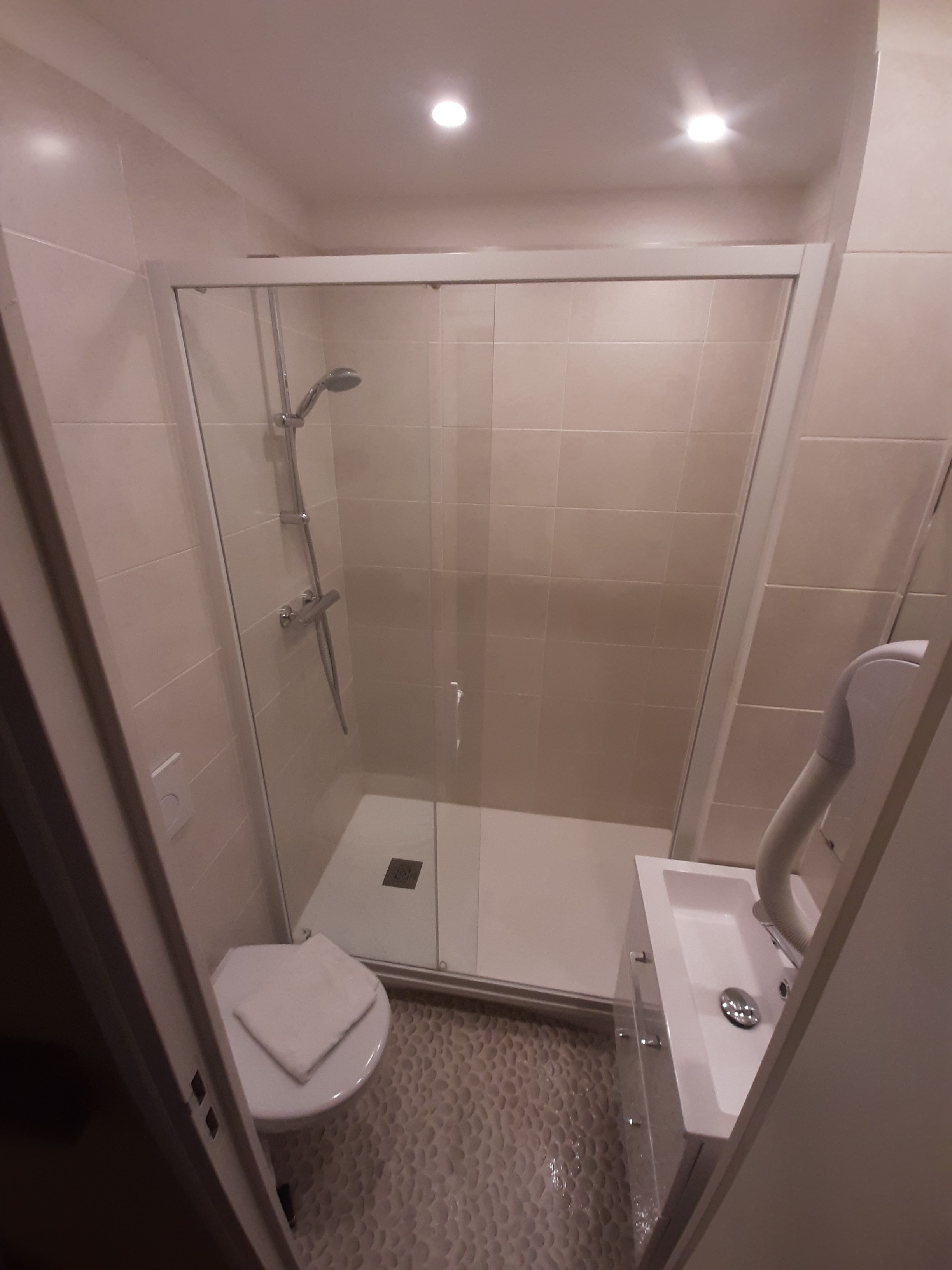 Douche vétuste ... Presque pas de pression dans le jet d'eau. Cabine avec du gros scoch gris dedans. Porte de la chambre qui laisse énormément passer la lumière. Heureusement que je n'ai pas eu à payer et que c'était un cadeau