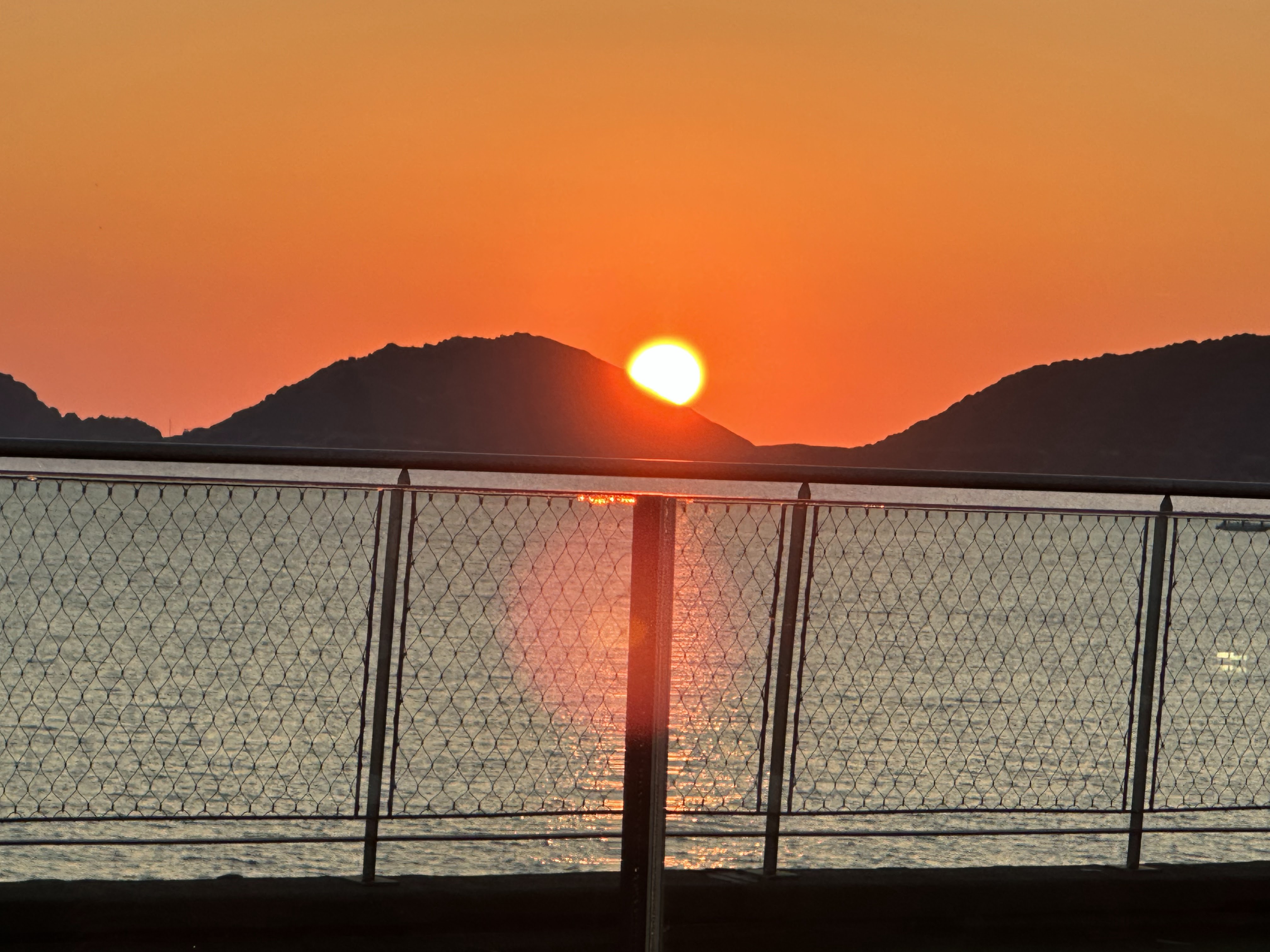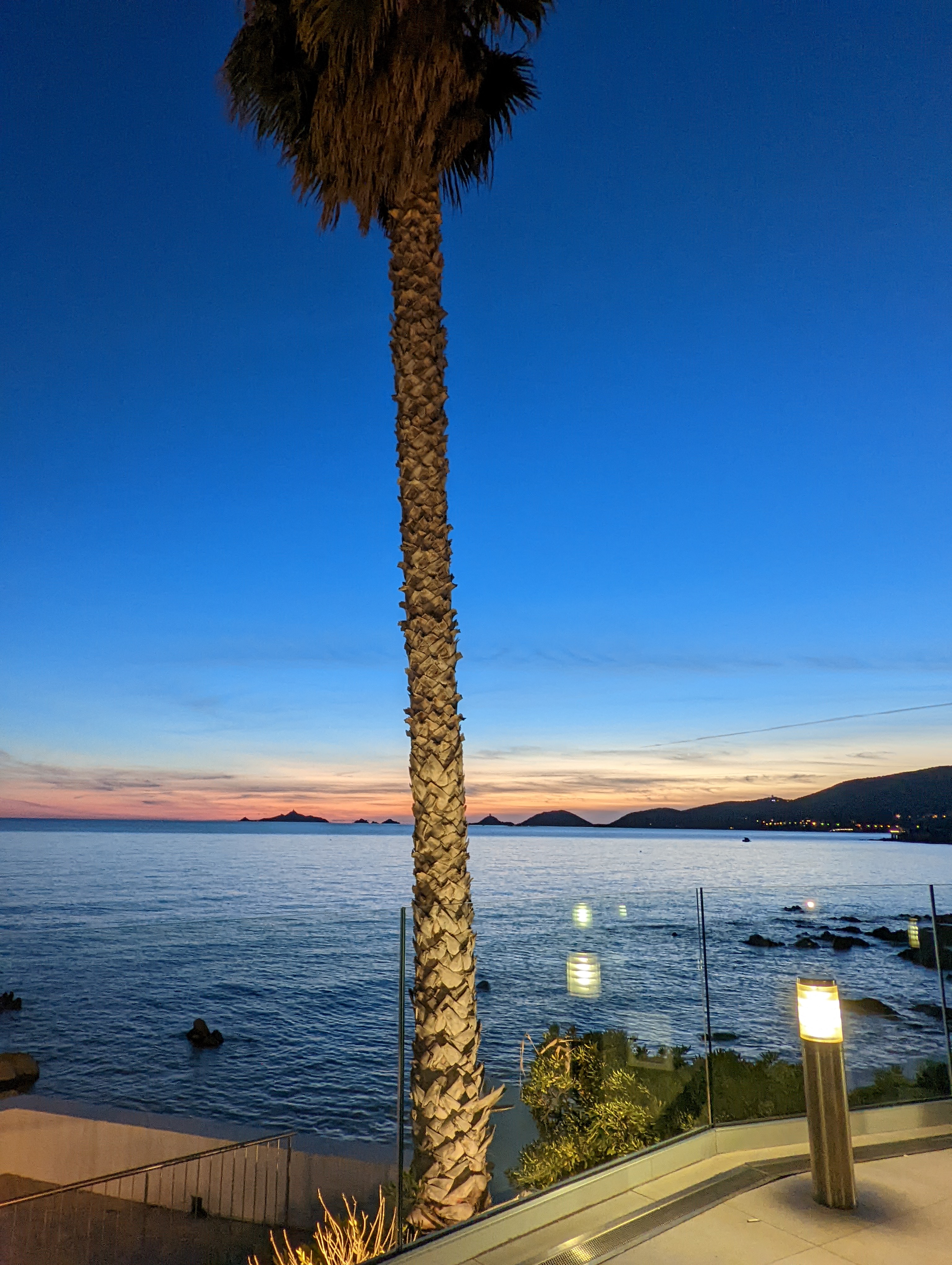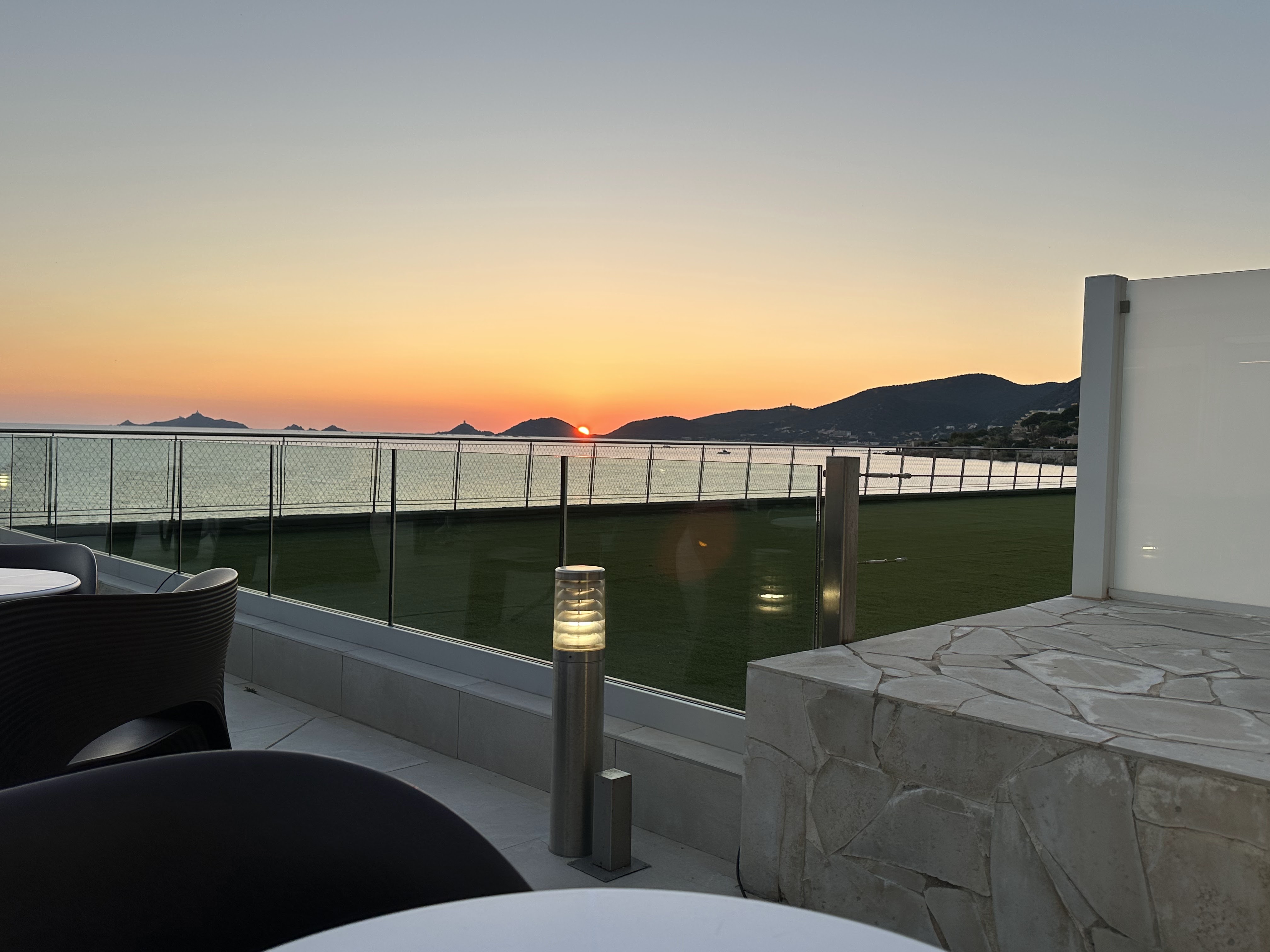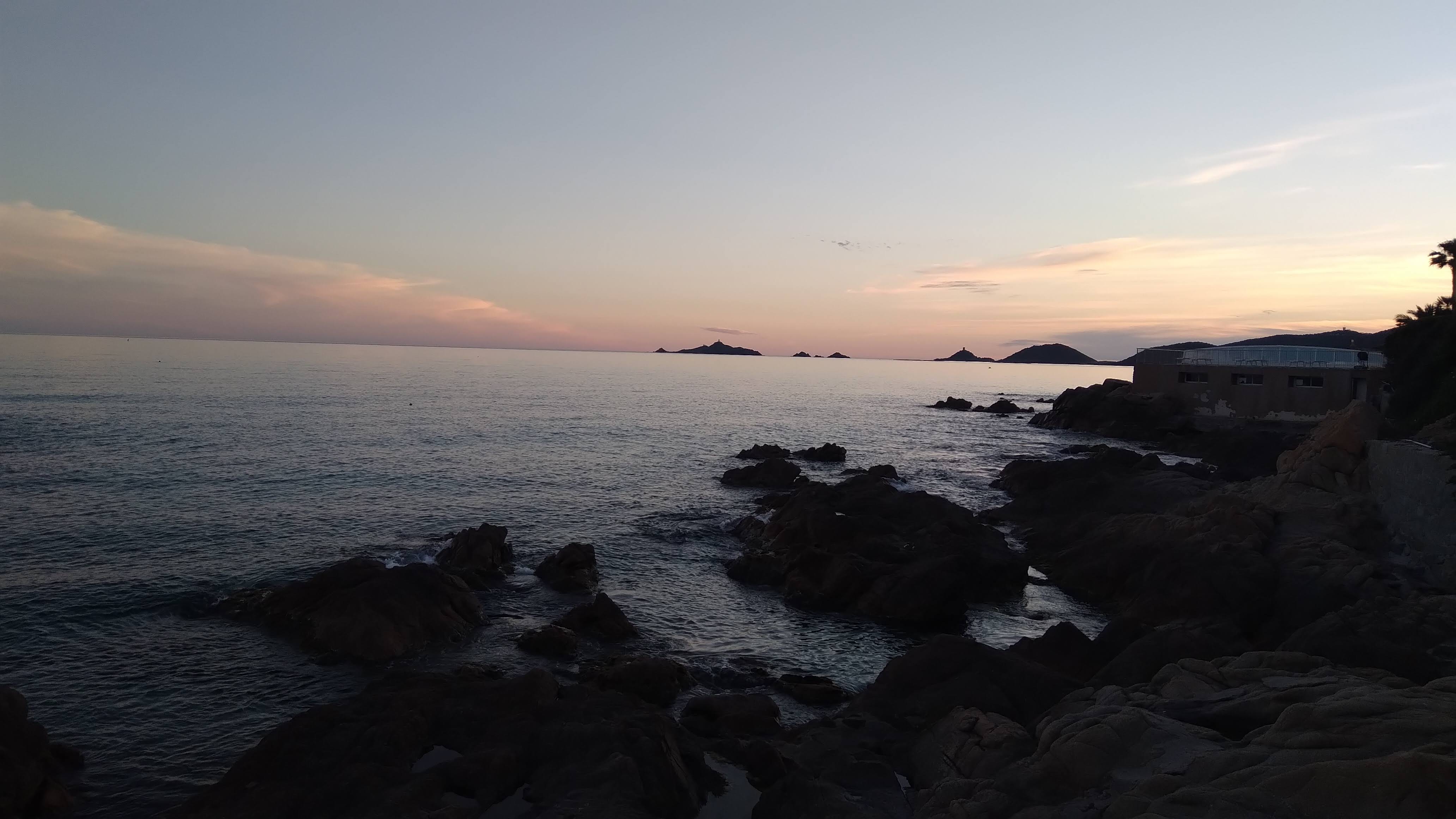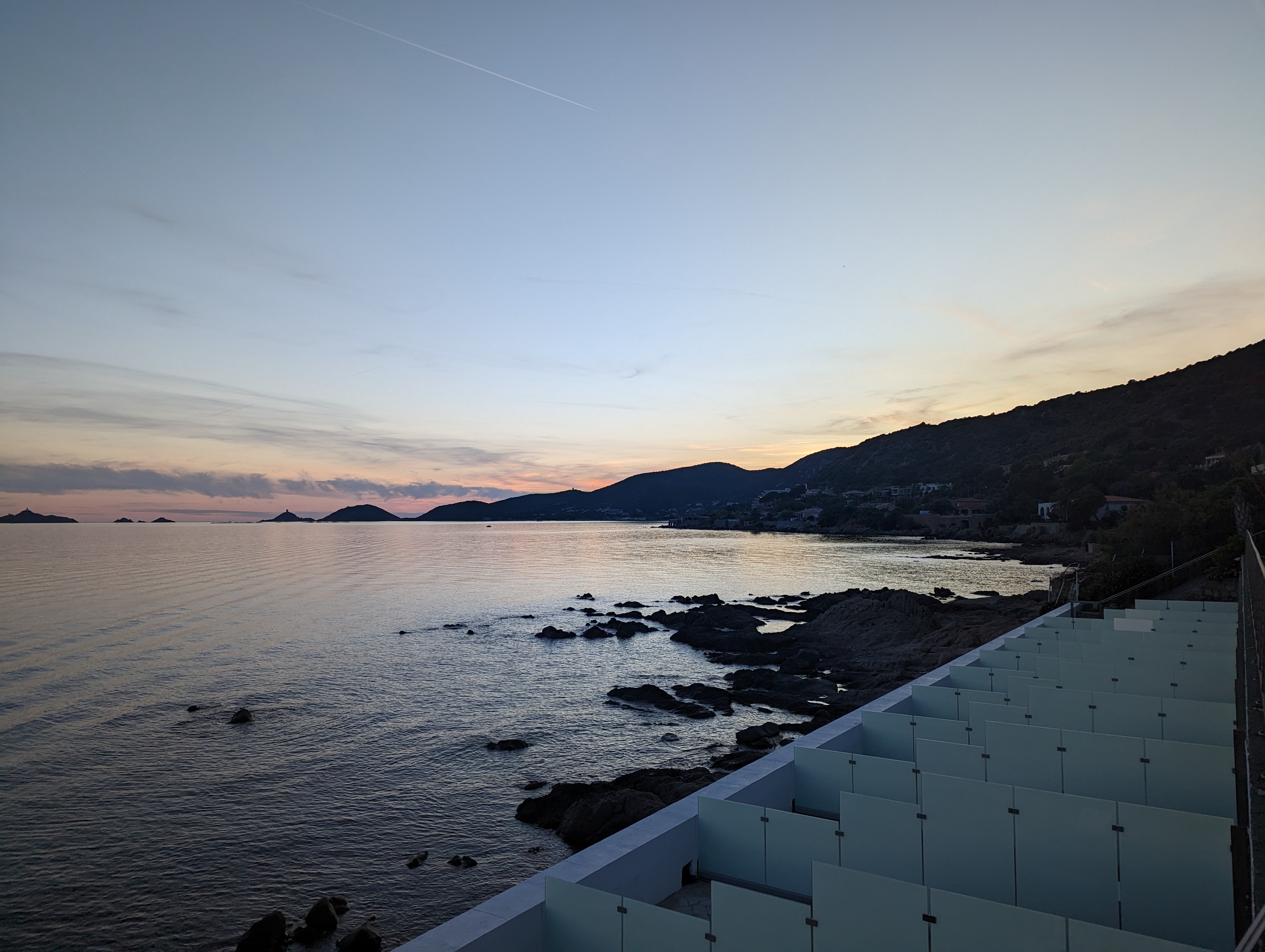 Alors que nous organisions un petit séjour sur l'île de beauté, avec atterrissage à Aiacciu, un ami nous a conseillé de poser nos bagages du côté de l'archipel des Sanguinaires. Conseil ô combien judicieux ! Après quelques recherches, Cala di sole a retenu notre attention. Malgré les (superbes) photos et les (dithyrambiques) avis, jeter son dévolu sur un hôtel au travers d'Internet présente toujours une part de risque. Mais en l'espèce, l'établissement s'est montré au-dessus de nos espérances ! Légèrement à l'écart de la ville, à quelques encablures de la villa de Tino Rossi, en bord de mer, doté d'une magnifique piscine la surplombant, avec vue imprenable sur l'archipel suscité, jouxtant une petite crique paradisiaque et sa charmante paillote — une mention toute particulière pour le ceviche de Saint-Pierre —, il nous a littéralement enchanté. Le fameux sole était également au rendez-vous et nous a gratifié d'un bon trente-cinq degrés. Quel bonheur que ce réchauffement climatique ! Sans oublier le directeur et son équipe, mais aussi la patronne de la paillote, tous aussi sympathiques qu'attentionnés. Aux petits soins... La crique du soleil, dont on peut admirer le coucher sur les îles Sanguinaires, nous a définitivement séduits !