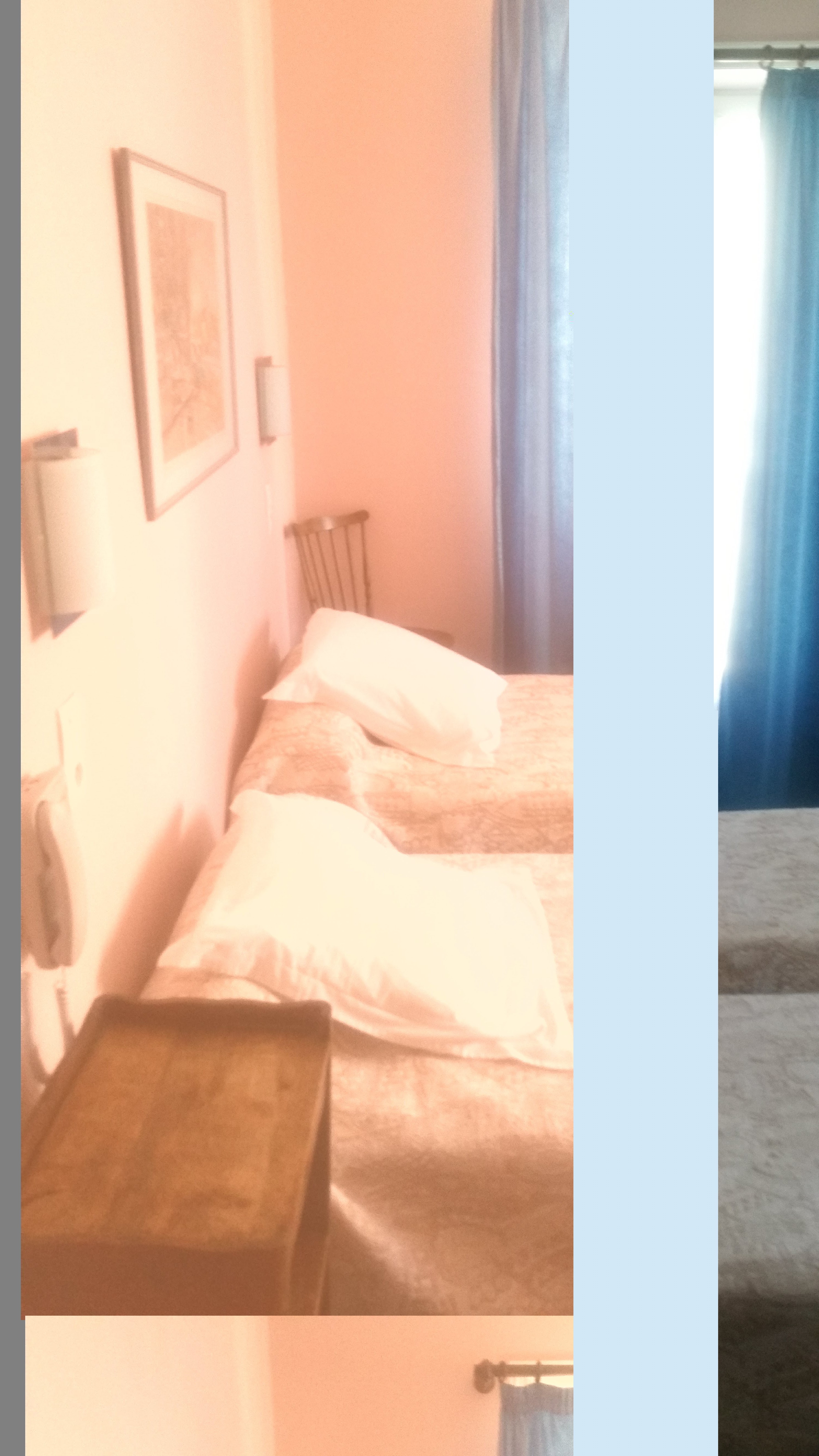 Chambre et salle d'eau aux odeurs d'égoût Chambre vétuste, papiers peints tachés, traces d'inondation, plafond abîmé, volets déglingués, cassés laissant passer le jour car manque de lattes, moquette sale. Salle de bains minable sans porte ,patères tombées Mobilier vieux. Une seule table de nuit. Poignée de la fenêtre tenant par un gros clou agressif. Bref, super!
