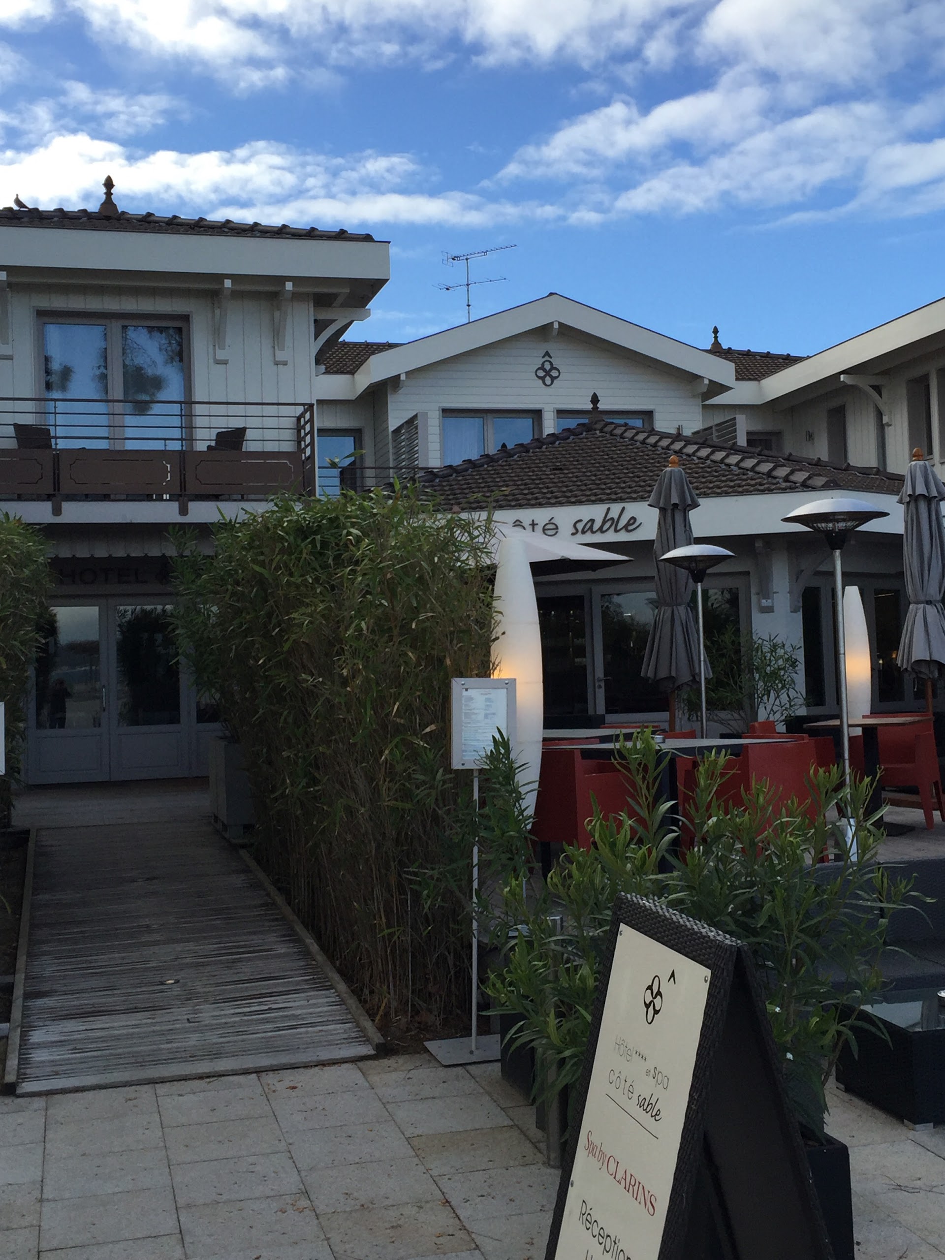 L'emplacement est idéal pour se poser et profiter de tout à pied ! Vous garez votre voiture et vous l'oubliez … L' hôtel est très agréable , on se croirait dans un immense chalet ! Le personnel est très chaleureux et discret, les chambres sont très propre , rien à dire , et le petit déjeuné au top ! Notre chambre avait une vue sur le bassin ; mais sans vis-à-vis , grâce à un petit chapiteau pile devant la fenêtre , pour certain cela peut être dérangeant , pour moi c'était plus intime !(Chambre N°7) … Mais d'autre chambre vous donnerons pleinement la vue sur le bassin , ne craignez rien ! j'ai eu l'occasion d'en visiter d'autre , et elles donnent toute l'envie de revenir! Pour ma part je reviendrais dans cette hôtel sans hésiter ! Côté Sable , ne changez rien !