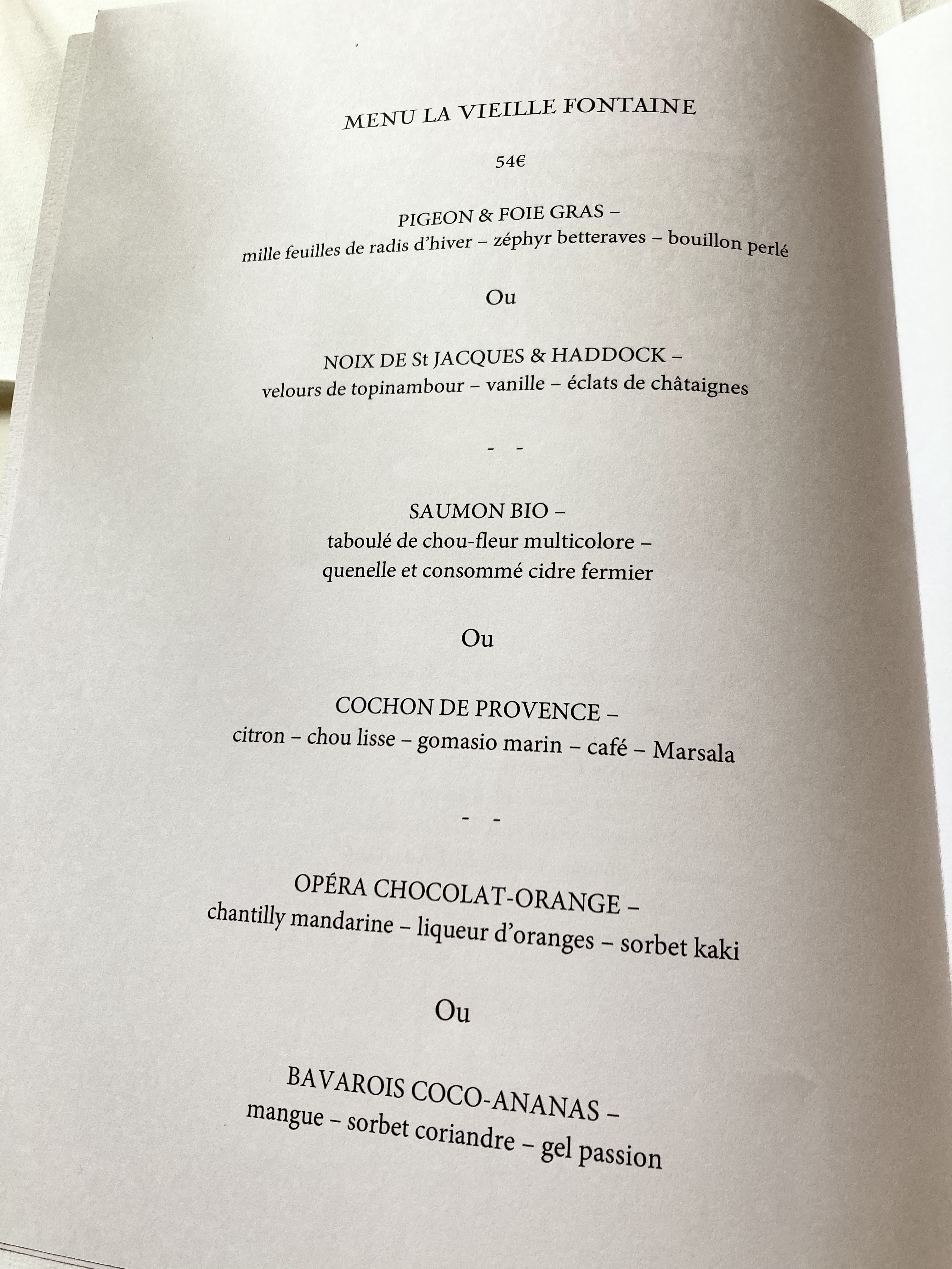 Le restaurant de l'Hôtel d'Europe La Vieille Fontaine est un un endroit magique. Le cadre est magnifique. Un service sympathique et professionnel. Dîner près de cette fontaine ancienne et de ce platane planté il y a 320 ans nous prépare à une expérience de saveurs. Le menu est est très fouillé et tous les plats sont à la hauteur avec une préférence pour le dessert, beau et bon à la fois : du grand art. Miam !