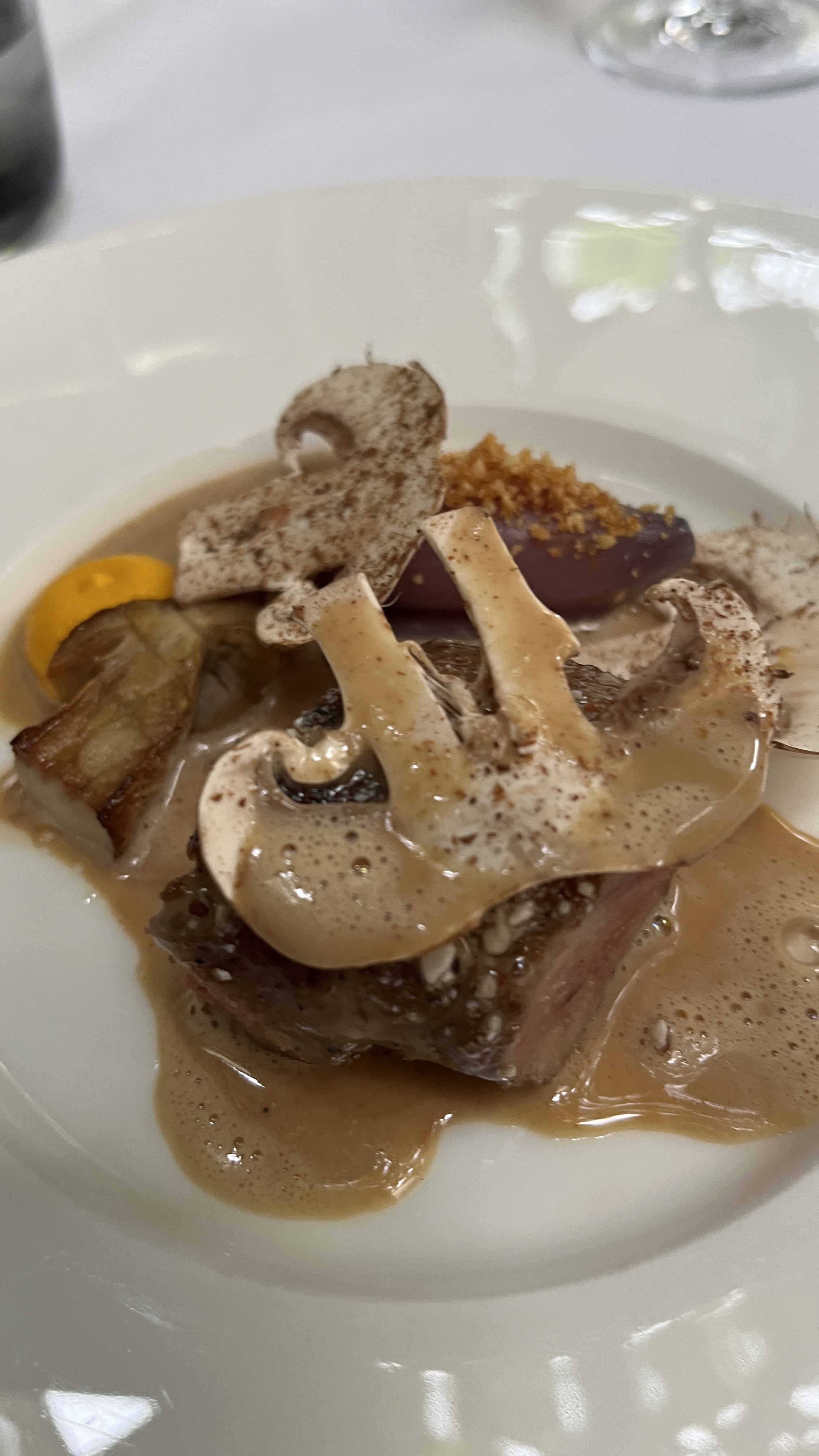 Agréable déjeuner à l’ombre d’un magnifique platane dans une ambiance bizarre, un peu triste… Assiettes soignées et jolies (une étoile Michelin quand même) goûts francs et agréables. Malheureusement pour moi qui suis assez restrictif dans mes goûts, pas de carte et donc peu de liberté dans le choix des plats…