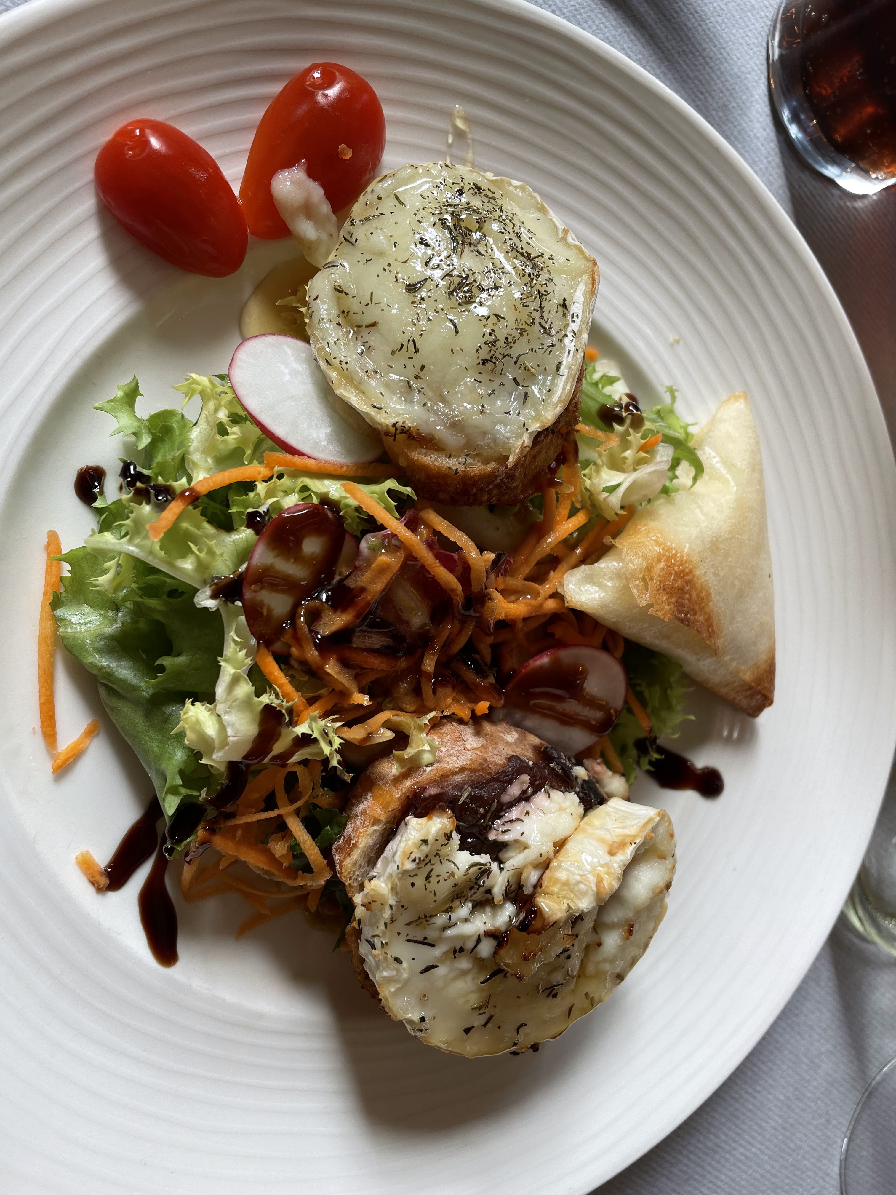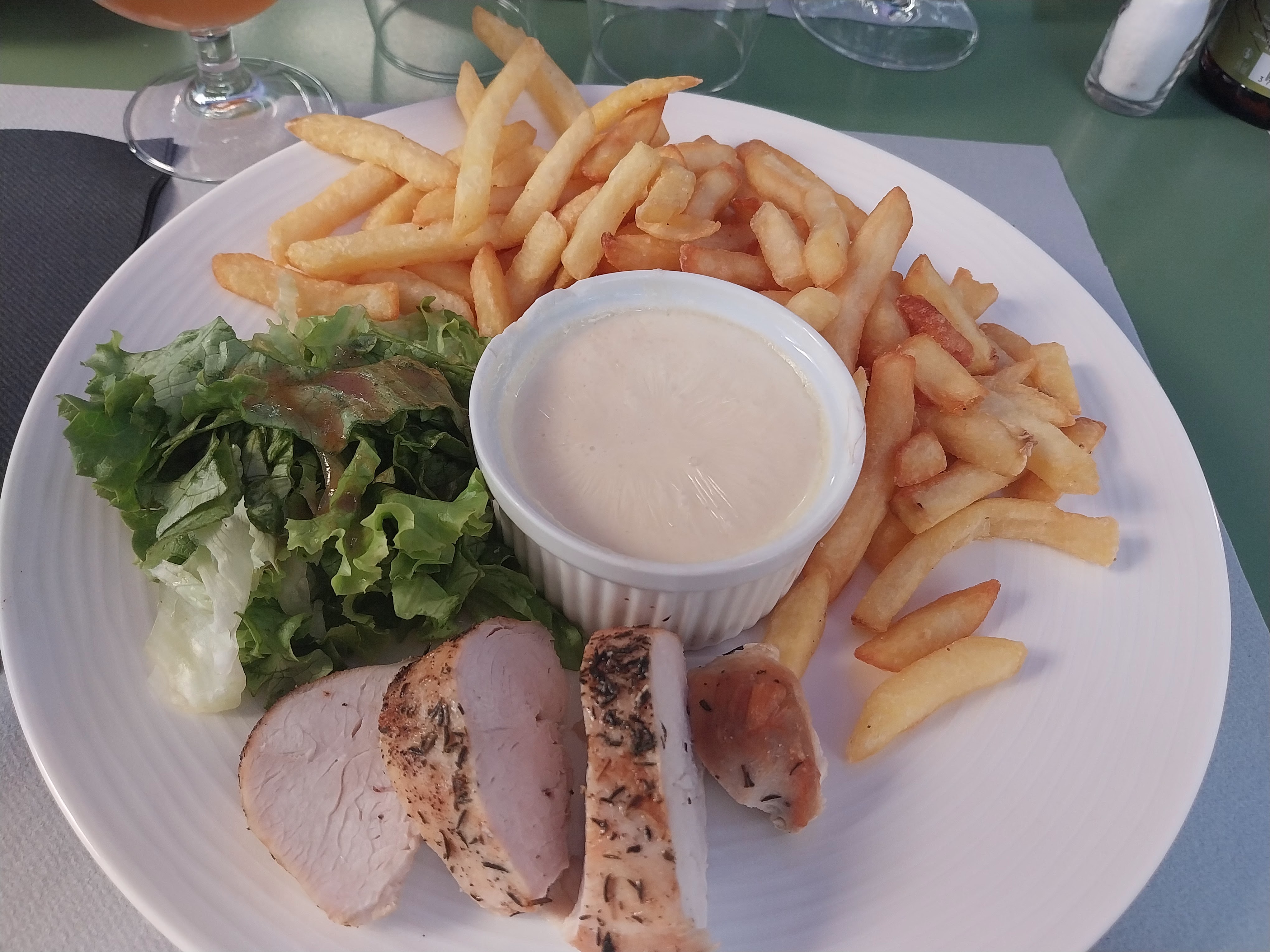 Entrée pas si mal, quand aux reste c'est très moyen... Frites surgelées, tomates au mois de février ainsi que desserts qui n'avait pas l'air frais.. Cela fait tâche avec le cadre magnifique.