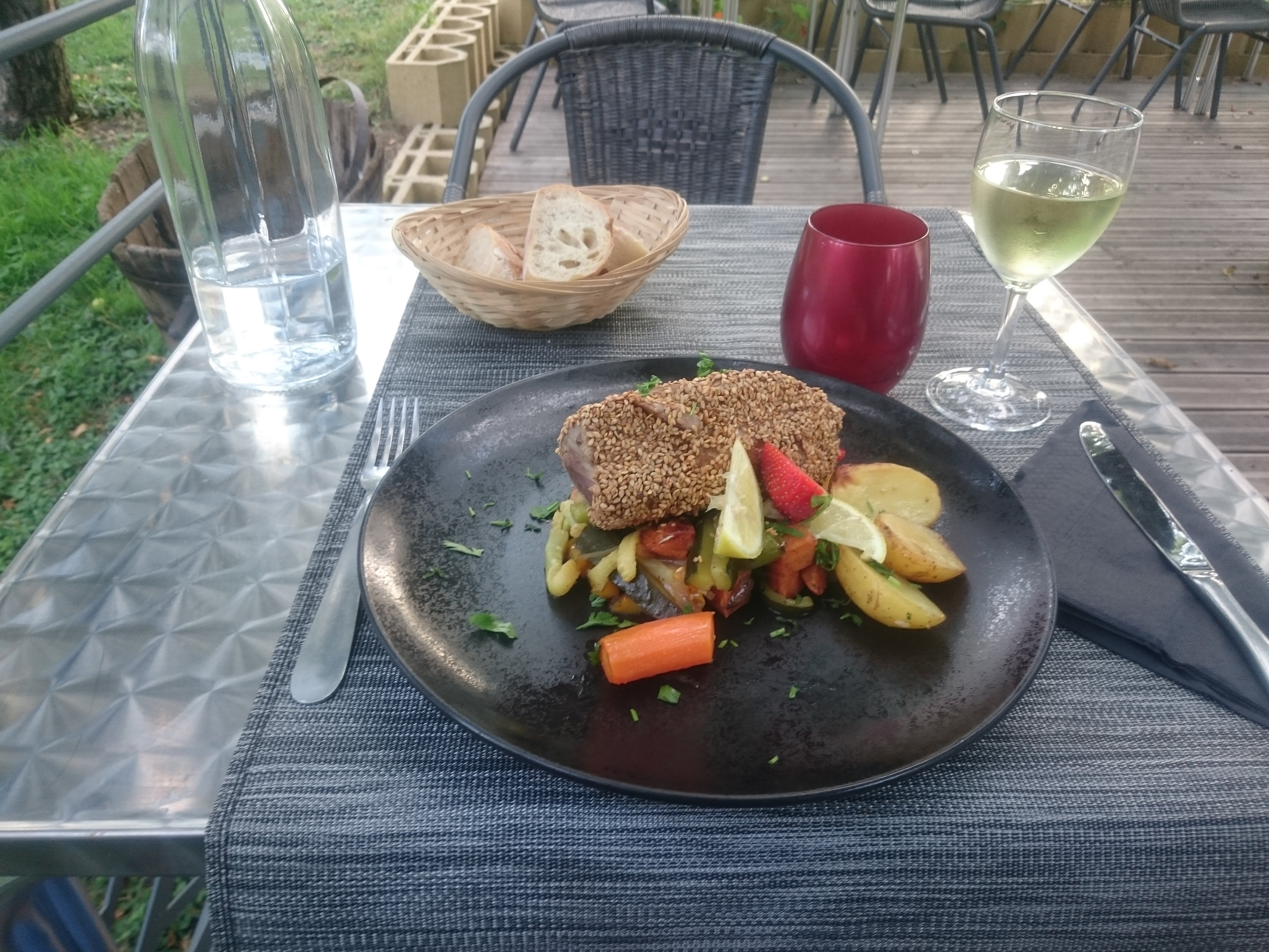 Terrasse du restaurant très agréable les soirs d’été, nous avons très bien mangé, plats maison, repas enfant copieux avec frites maison délicieuses, menu 3 plats à 23 euros. Les tables mériteraient juste d’être un peu plus espacées pour plus d’intimité,