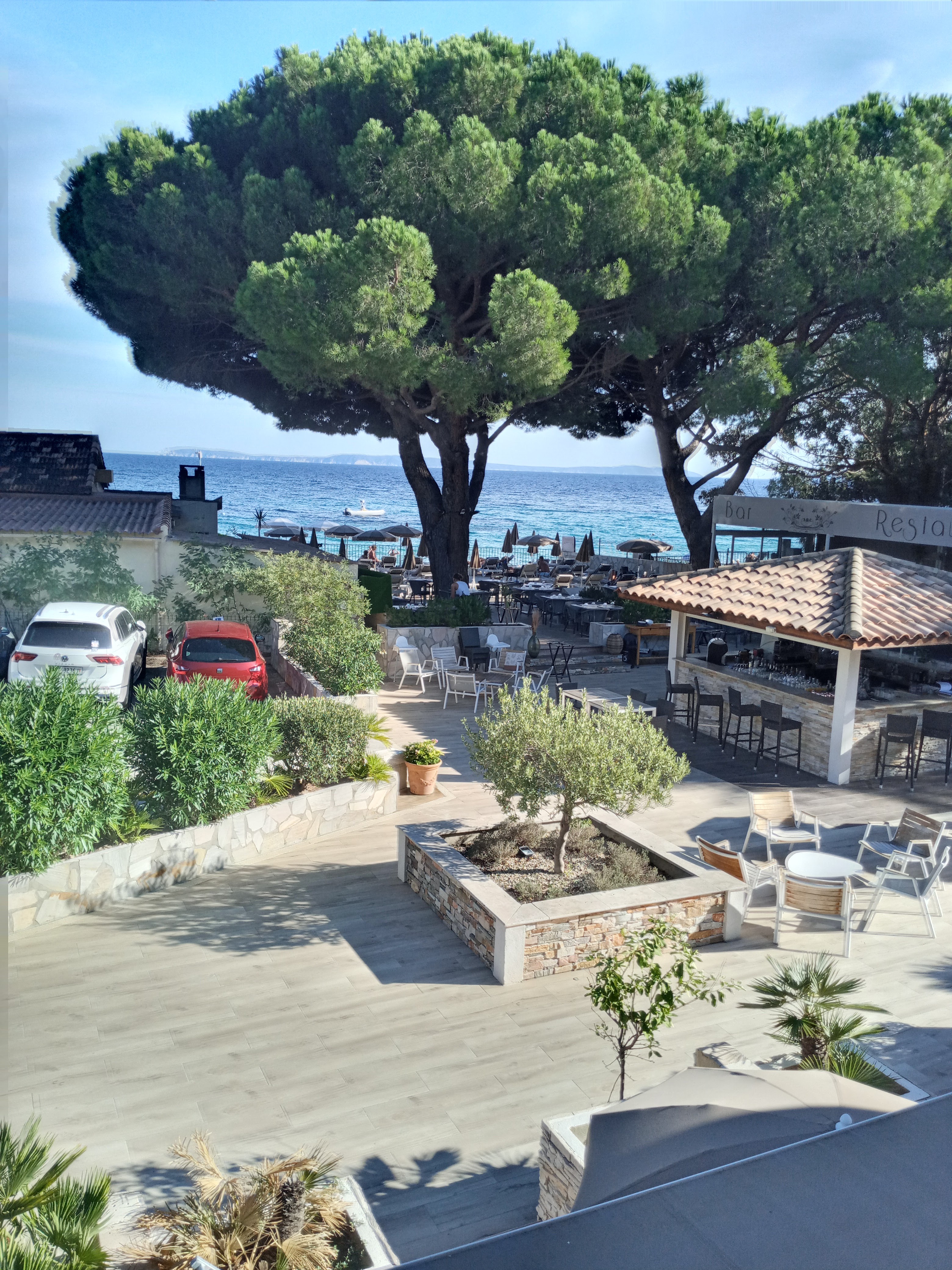 Excellent hôtel les pieds dans l’eau ! On mange vraiment très bien au restaurant et le service est impeccable tandis que le repas est servi sous les magnifiques pins parasols. Quant à l’hôtel, je n’en reviens pas de l’incroyable rapport qualité prix !!! Les chambres sont modernes et refaites à neuf, nous avons eu une chambre avec terrasse vue mer totalement fabuleuse 🤩 Mention spéciale pour le personnel souriant, très attentionné : j’ai mal a la gorge et la standardiste s’en rend compte au téléphone, elle m’a gentiment proposé une infusion au miel en plus du petit dej habituel ! Petit dej copieux monté en chambre en seulement 5 mn : qui dit mieux ? 🤩