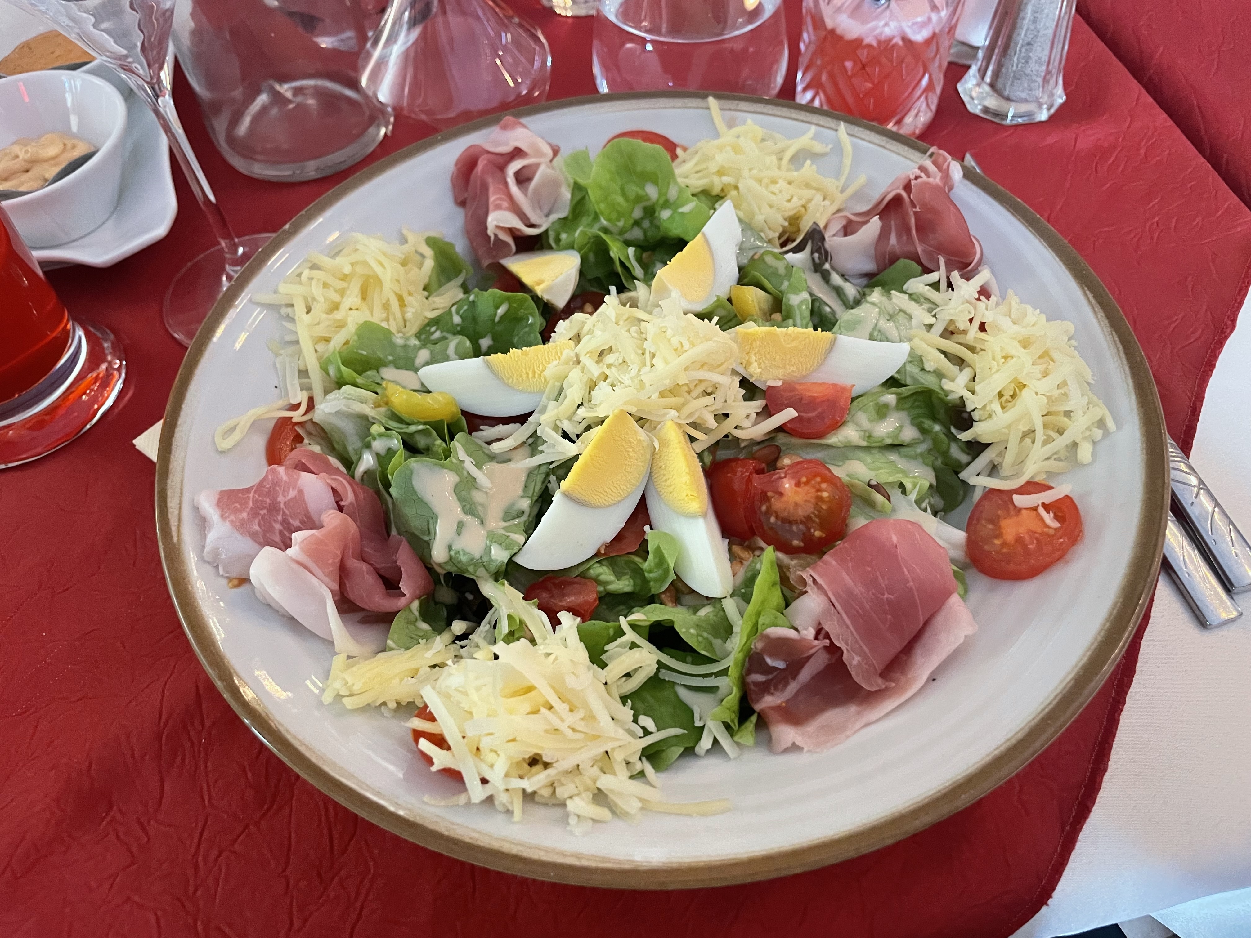 Toujours un bon point de référence. Puis dîner avec Tartiflette et petit-déjeuner copieux et de qualité. Au petit déjeuner, du vrai pain frais (encore chaud), 3 confitures (myrtille, orange et fraise), des yaourts variés, un excellent jambon cuit, de la toma di savoia et bien d'autres choses. Malheureusement, le Covid nous a offert ces machines à boissons chaudes et à lait blanc chaud, c'est imbuvable, où qu'on aille. Le nouveau bar extérieur dans le jardin pour cocktails et tapas est magnifique. Avec chambre demi-pension pour deux tout compris 135 euros. août 2022