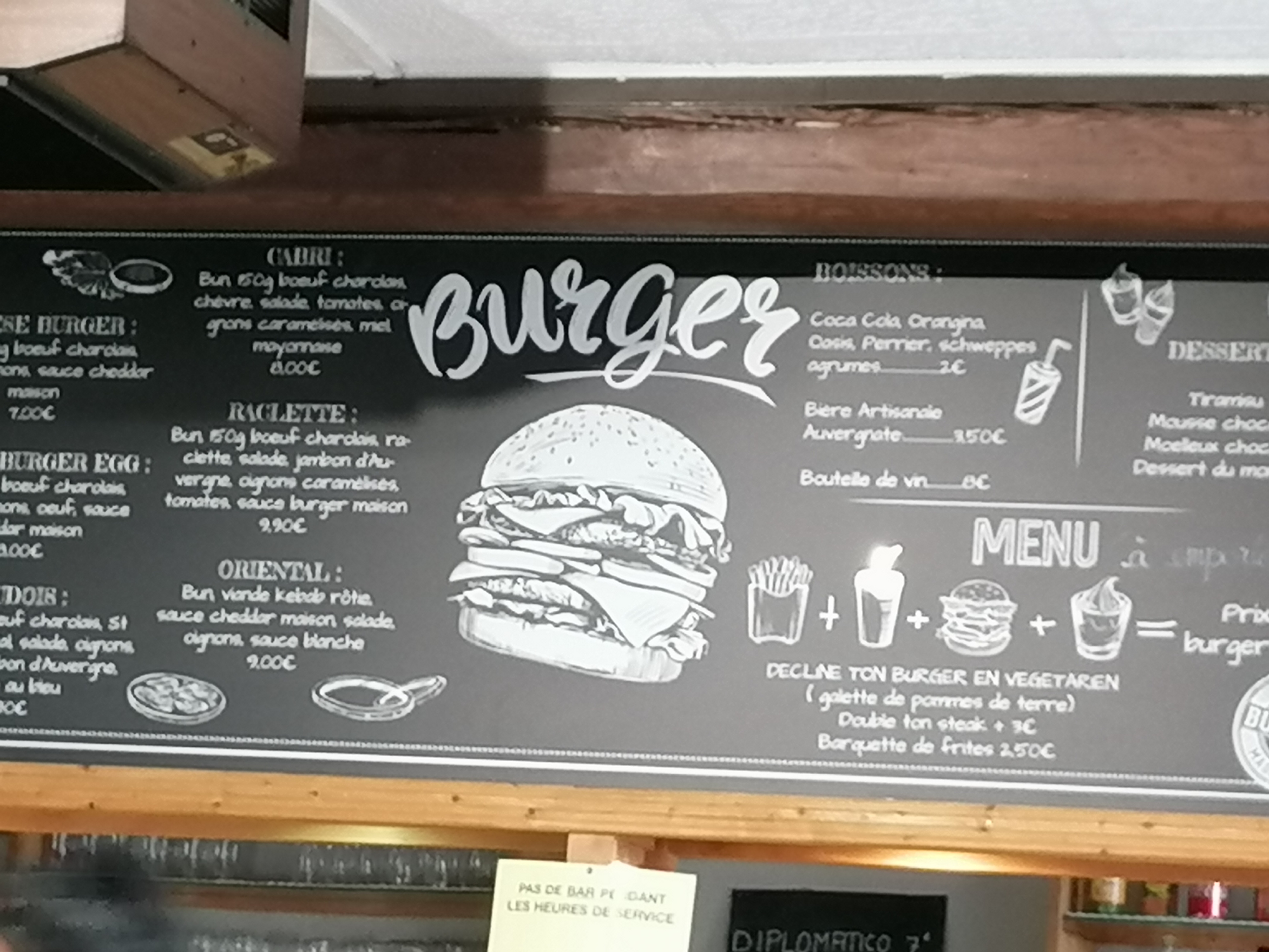 L' hamburger coudois avec soit disant 3 fromages auvergnat (cantal,bleue ,st nectaire)à 9 euros (+2 euros sur table )avec du pain hamburger premier prix, deux steaks surgelés trop cuits,les trois fromages on les cherche encore!!! Les frites étaient froides et trop cuites( soit disant maison). Conclusion :à ce prix là c'est du vol!!!