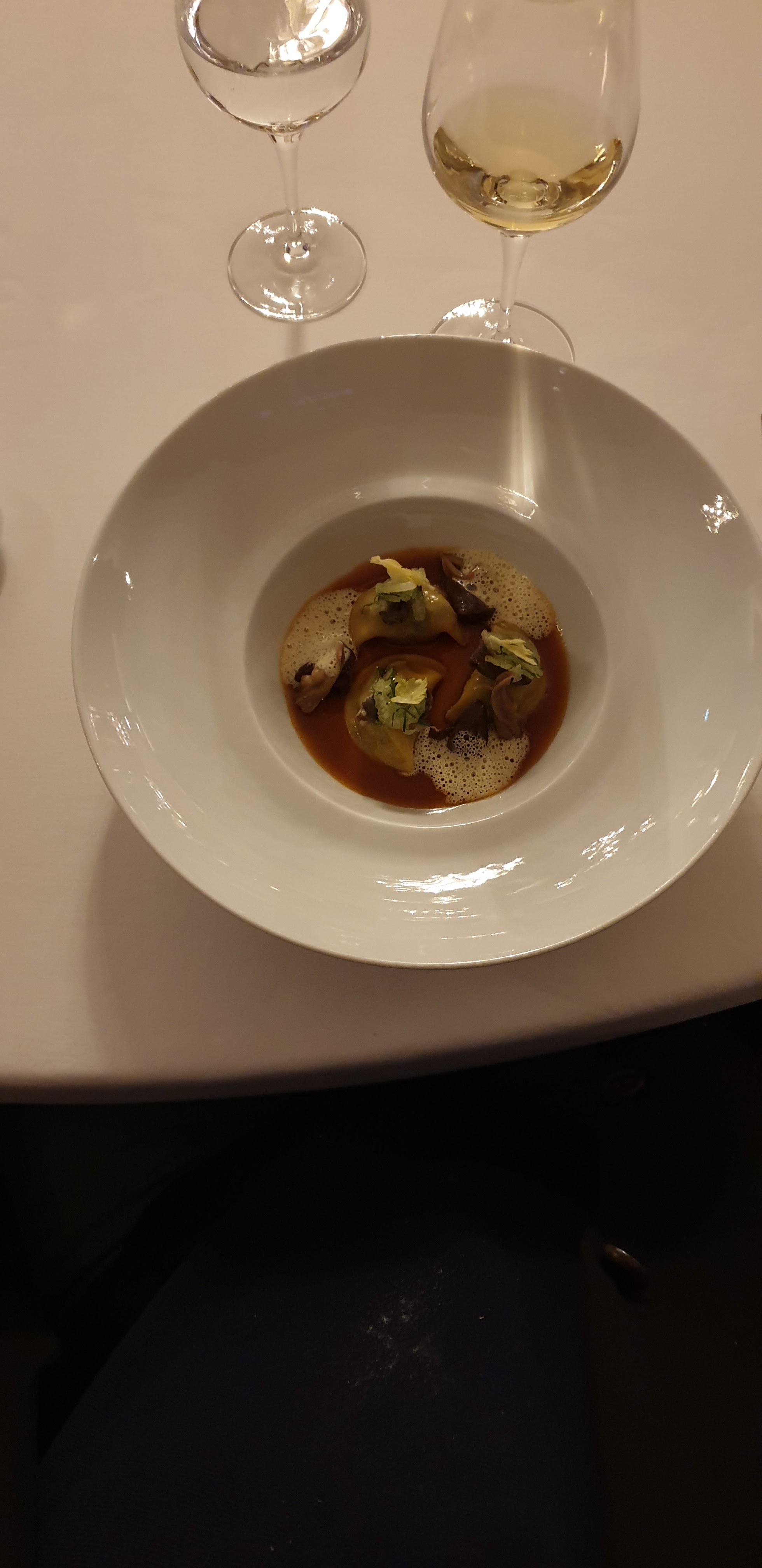 La nourriture était exceptionnelle, l'accord mets et vins était bon. La présentation et l'ambiance étaient toutes deux fantastiques. Le seul reproche est que le service est encore très démodé, par exemple, le menu pour femmes ne mentionne pas les prix, les serveurs ont pour la plupart ignoré ma femme, m'ont seulement demandé ce que nous voulions boire, etc.