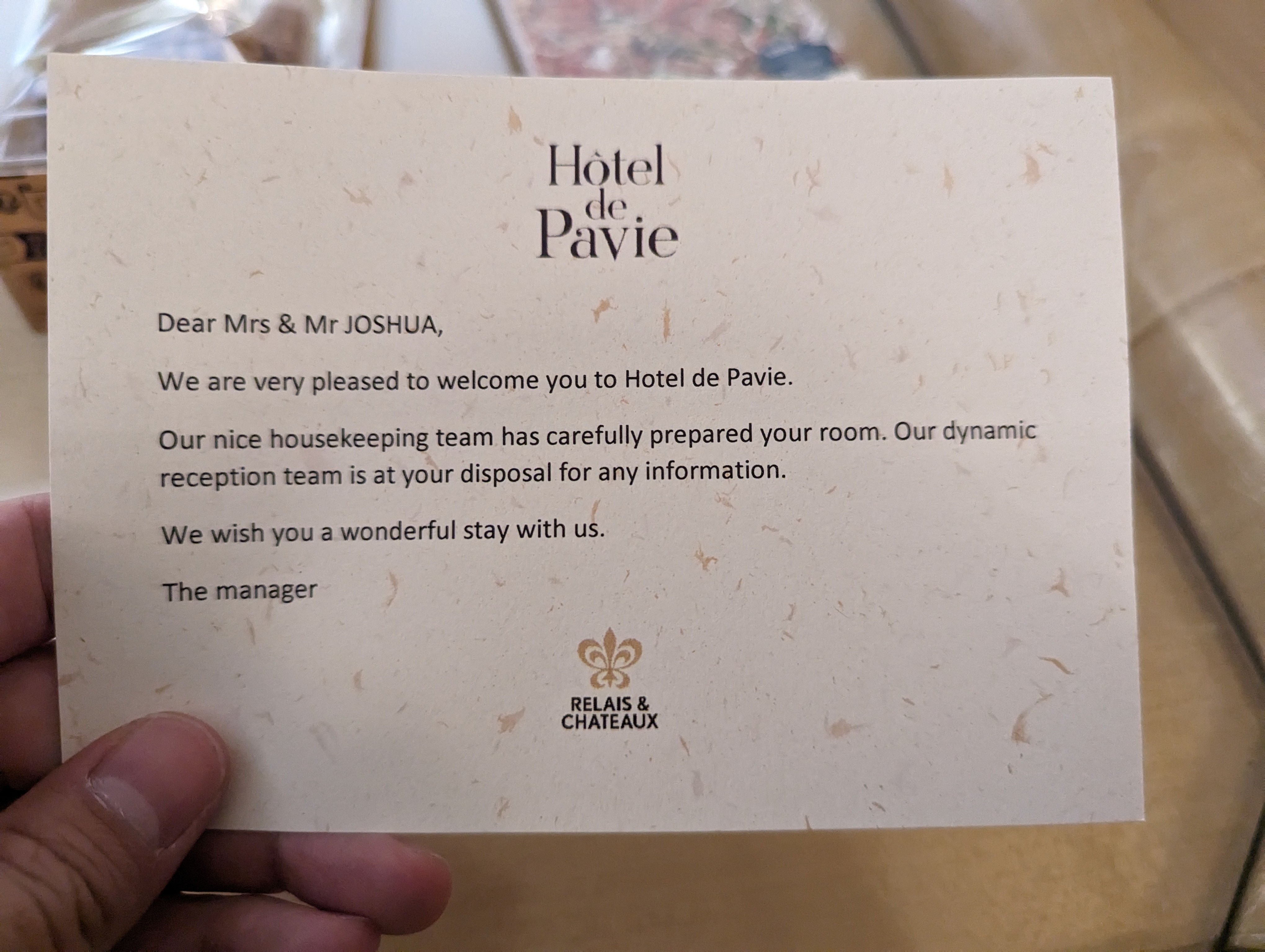 Un merveilleux petit hôtel avec des chambres décorées avec goût et bien aménagées, et un service haut de gamme et très affable. Le petit déjeuner est excellent, avec peut-être place à amélioration en ce qui concerne le café et les croissants. Il manque à ces derniers le goût de noisette du beurre et la légèreté de la pâte feuilletée. Le restaurant Table de Pavie est époustouflant : il vaut largement ses deux étoiles Michelin avec un équilibre parfait et une richesse de goûts. Les vins recommandés par le sommelier étaient bien sûr magnifiques.