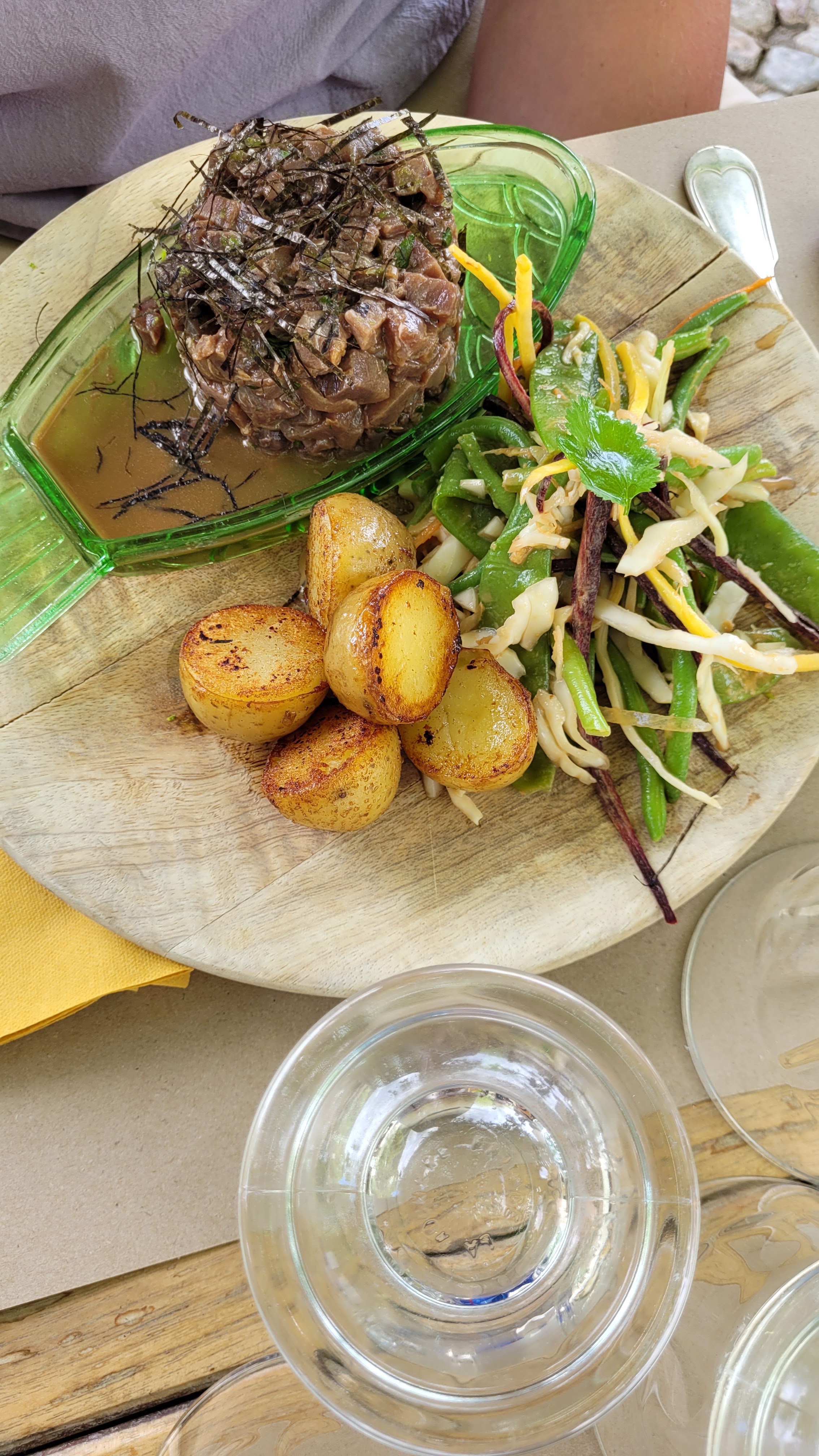 Très belle terrasse ombragée autour d une fontaine apportant de la fraîcheur. Belle carte et produits de qualité. Choix de vins naturels et bios. Personnel au top. A recommander.