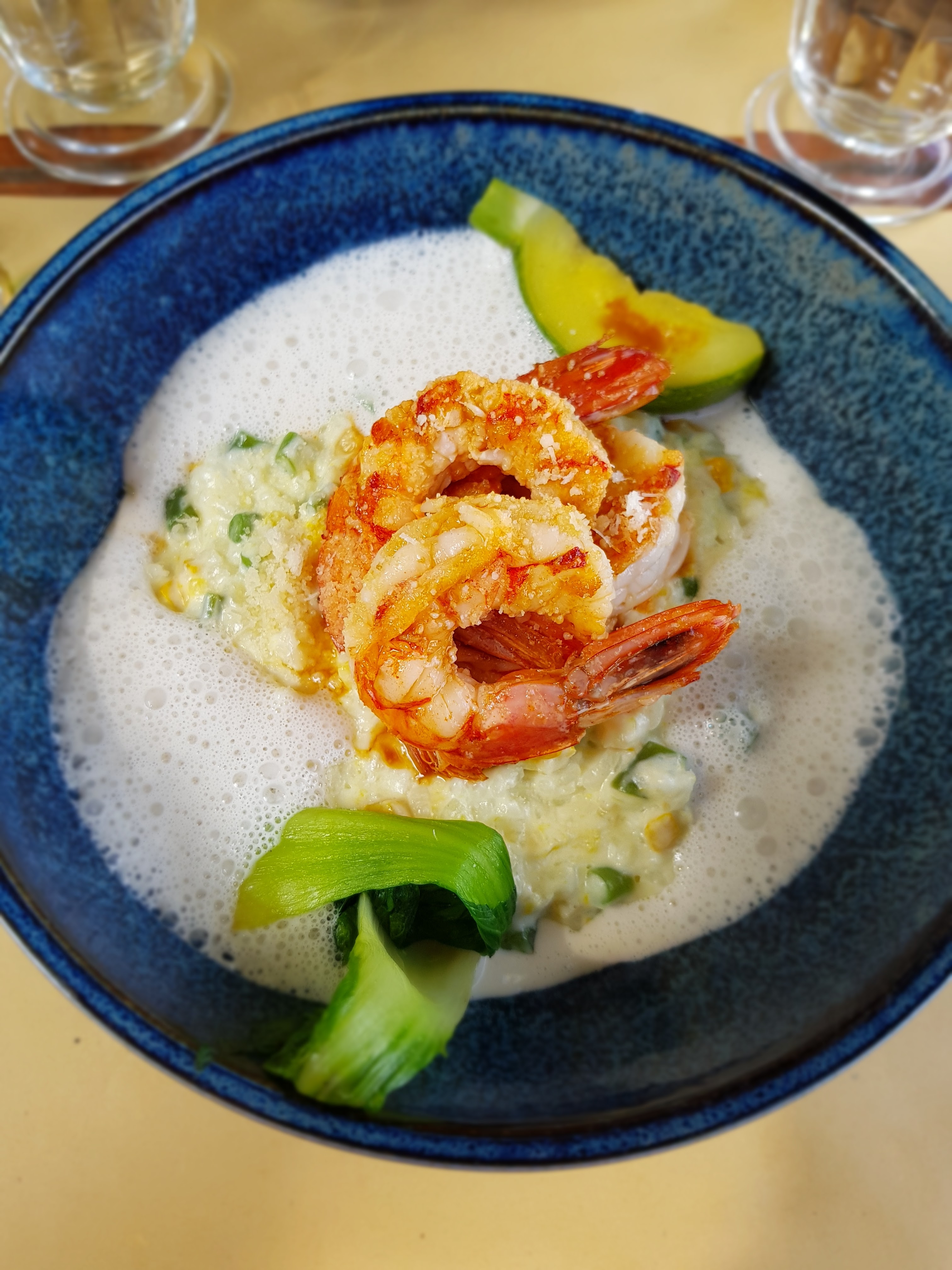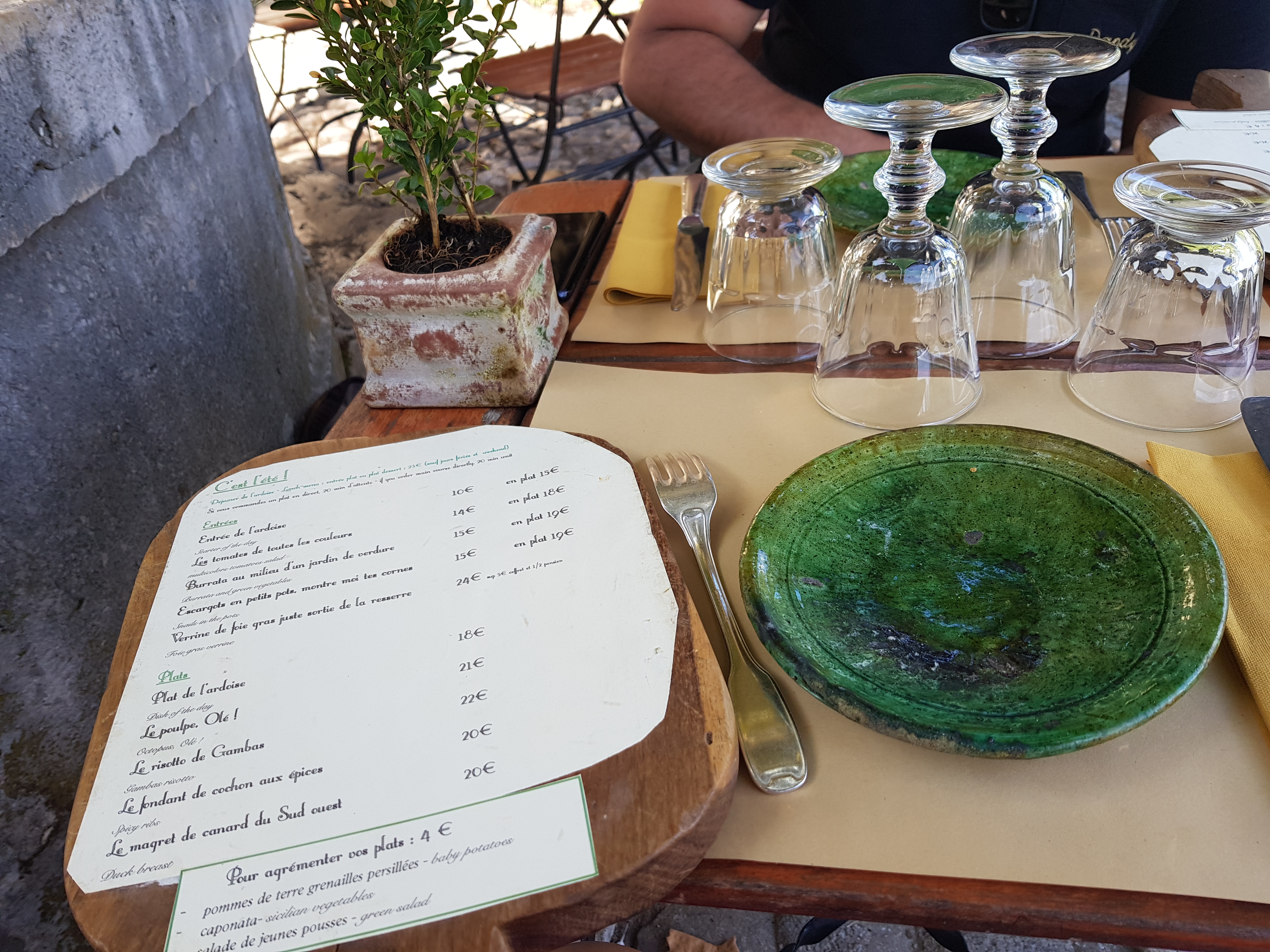 Un délice du début à la fin. Déjà le cadre est sublime, au calme a l'ombre de la fontaine nous sommes bien installés. Le service est excellent et efficace. L'entrée de l'ardoise était dune légèreté parfaite: betteraves et mousse de chèvre. J'ai pris le risotto aux gambas en plat, le lait de coco et la citronnelle en ont fait un plat succulent! Et en dessert le crumble a la mirabelle a terminé d'enchanter mes papilles. Un sans faute : fin, léger et délicieux.